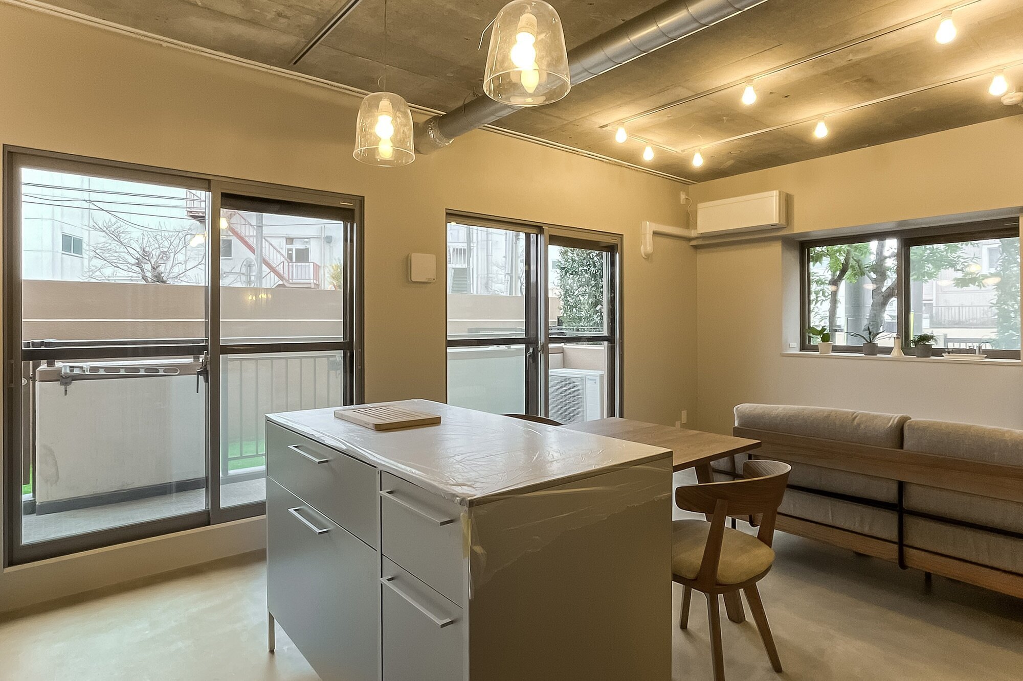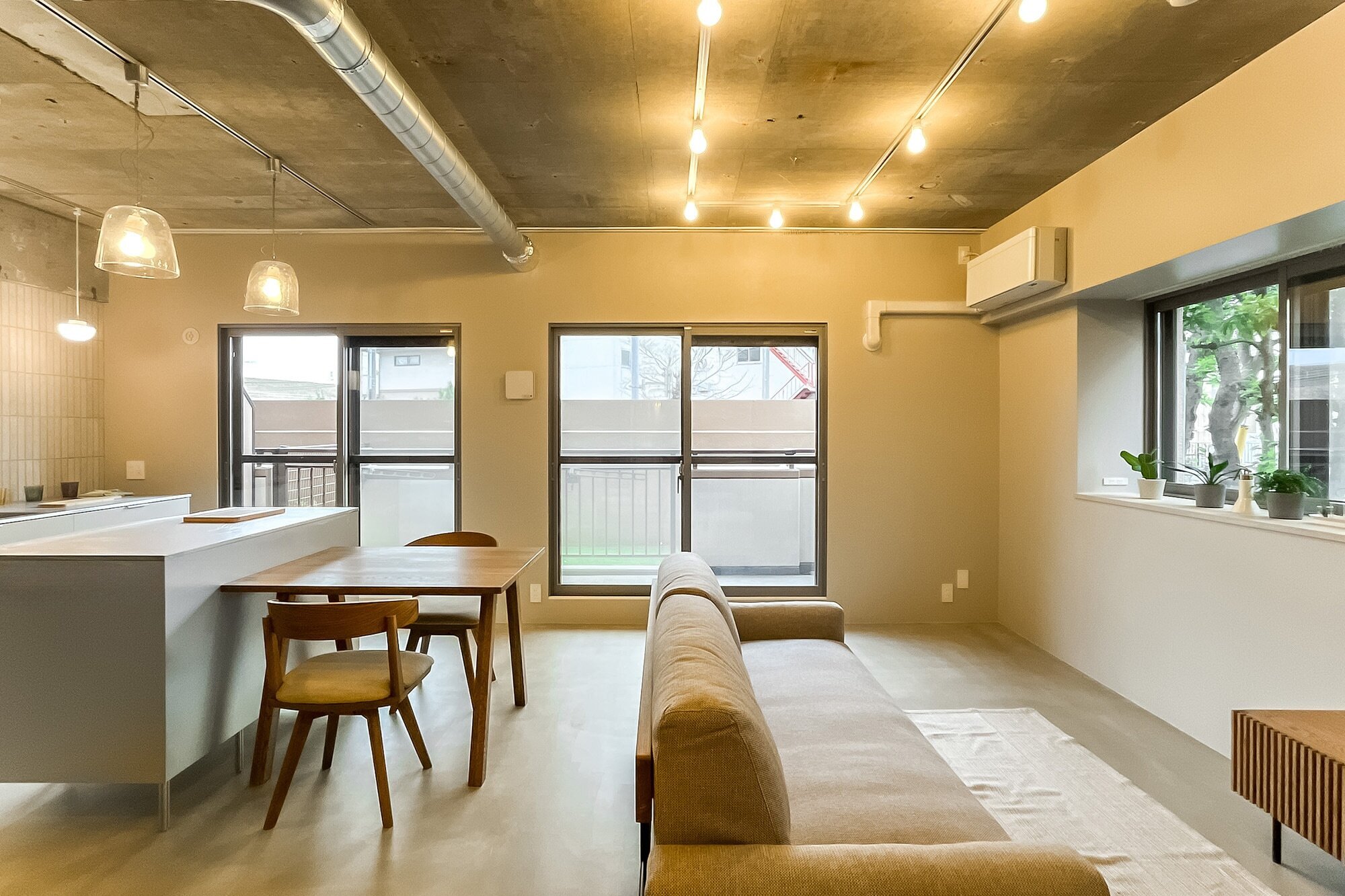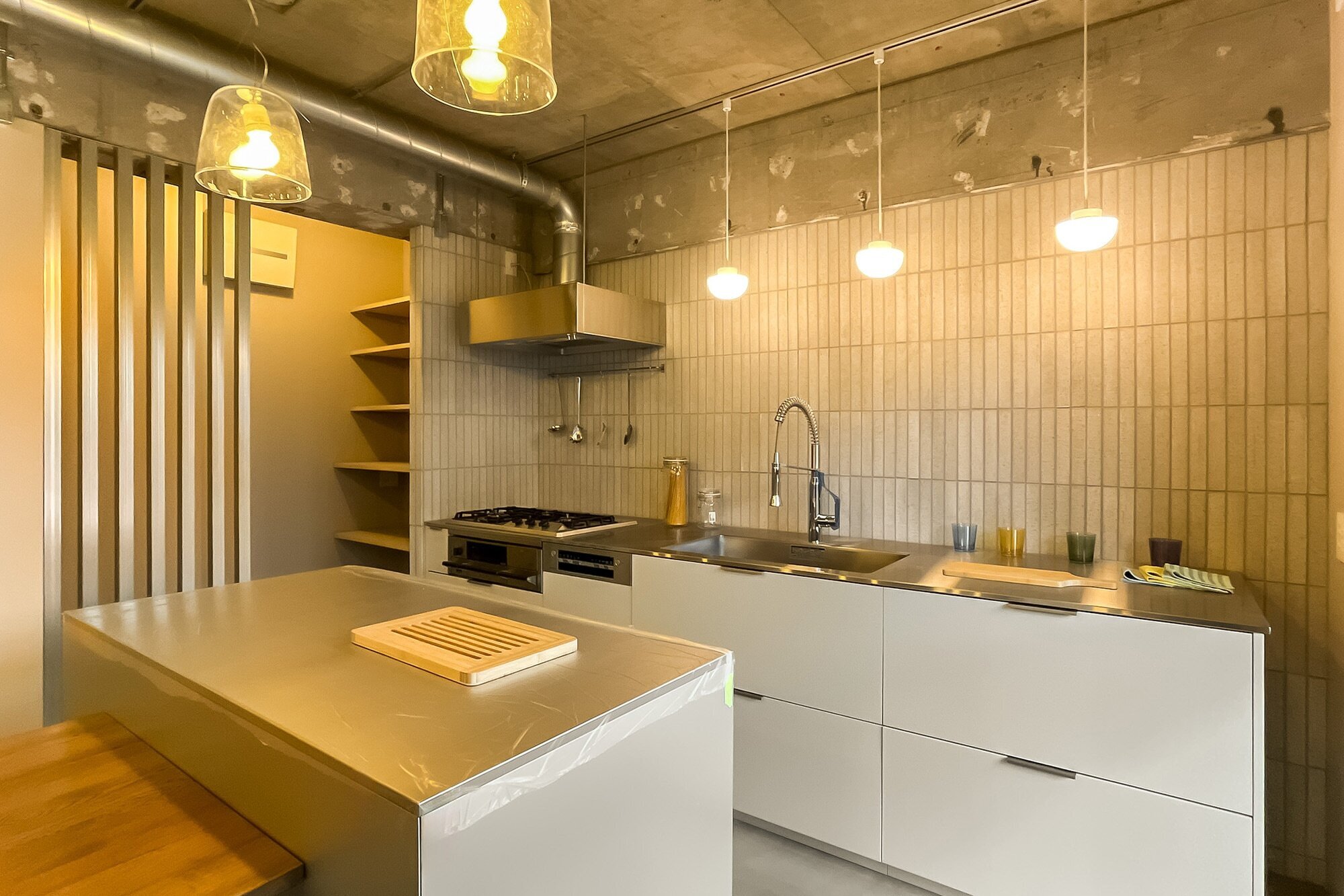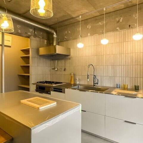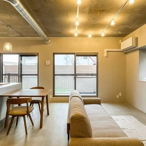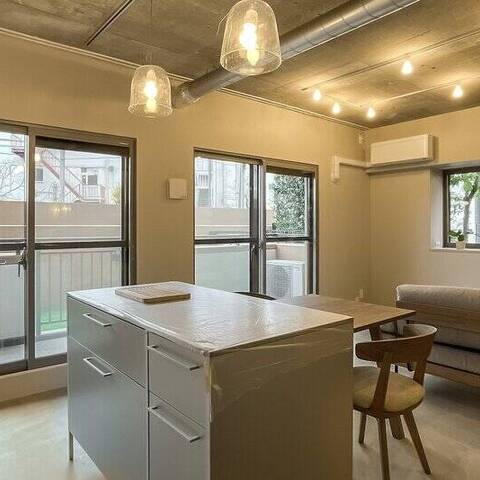 躯体現しのLDKにタイル貼りのキッチン、モルタル仕上げの床に室内窓、廊下沿いのスタイリッシュな洗面台。目の前には荒川が流れ、今日も子どもが元気いっぱい河川敷を駆ける。都心から少し距離を置いたら、理想の物件と巡り会えた。