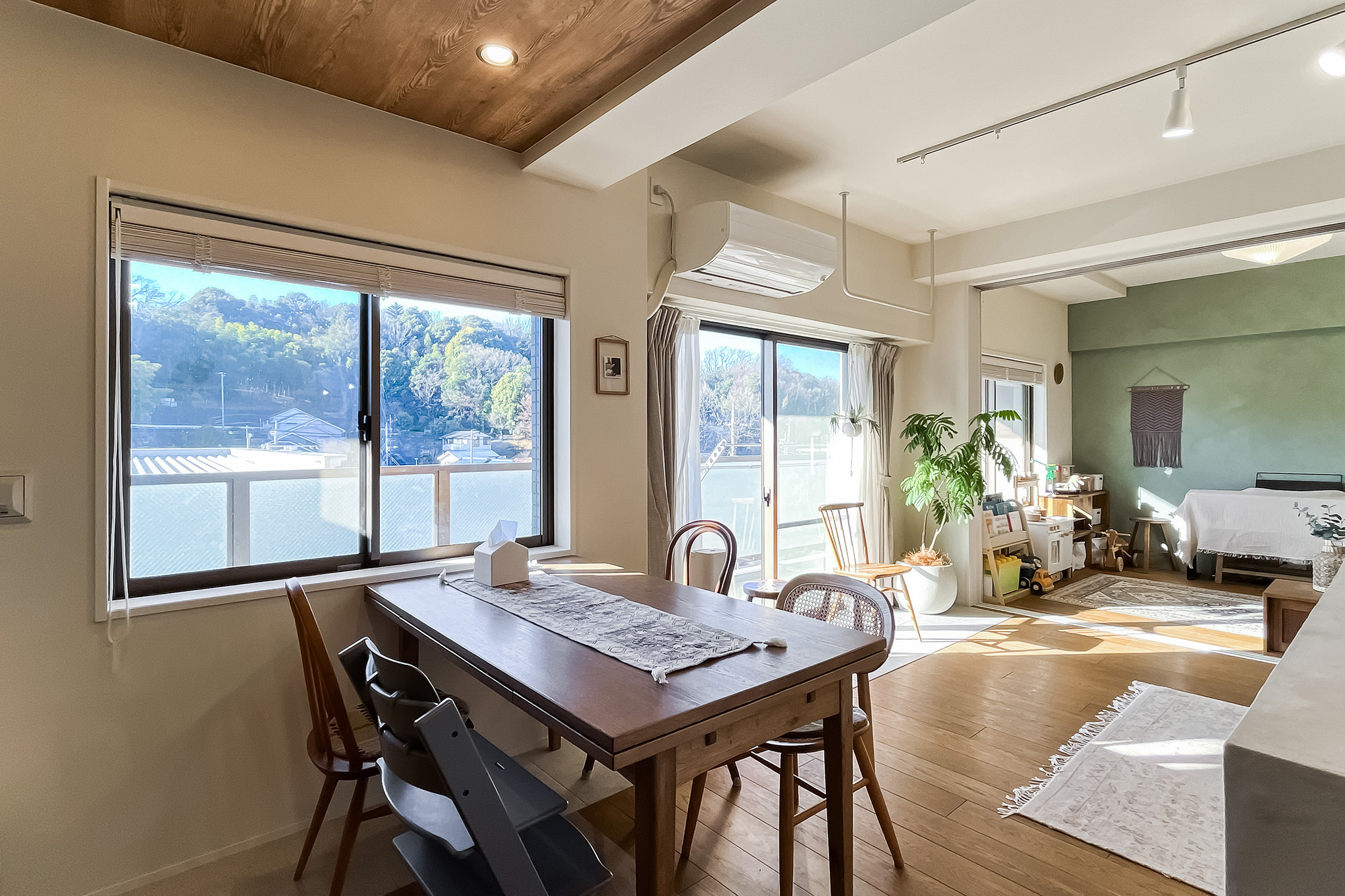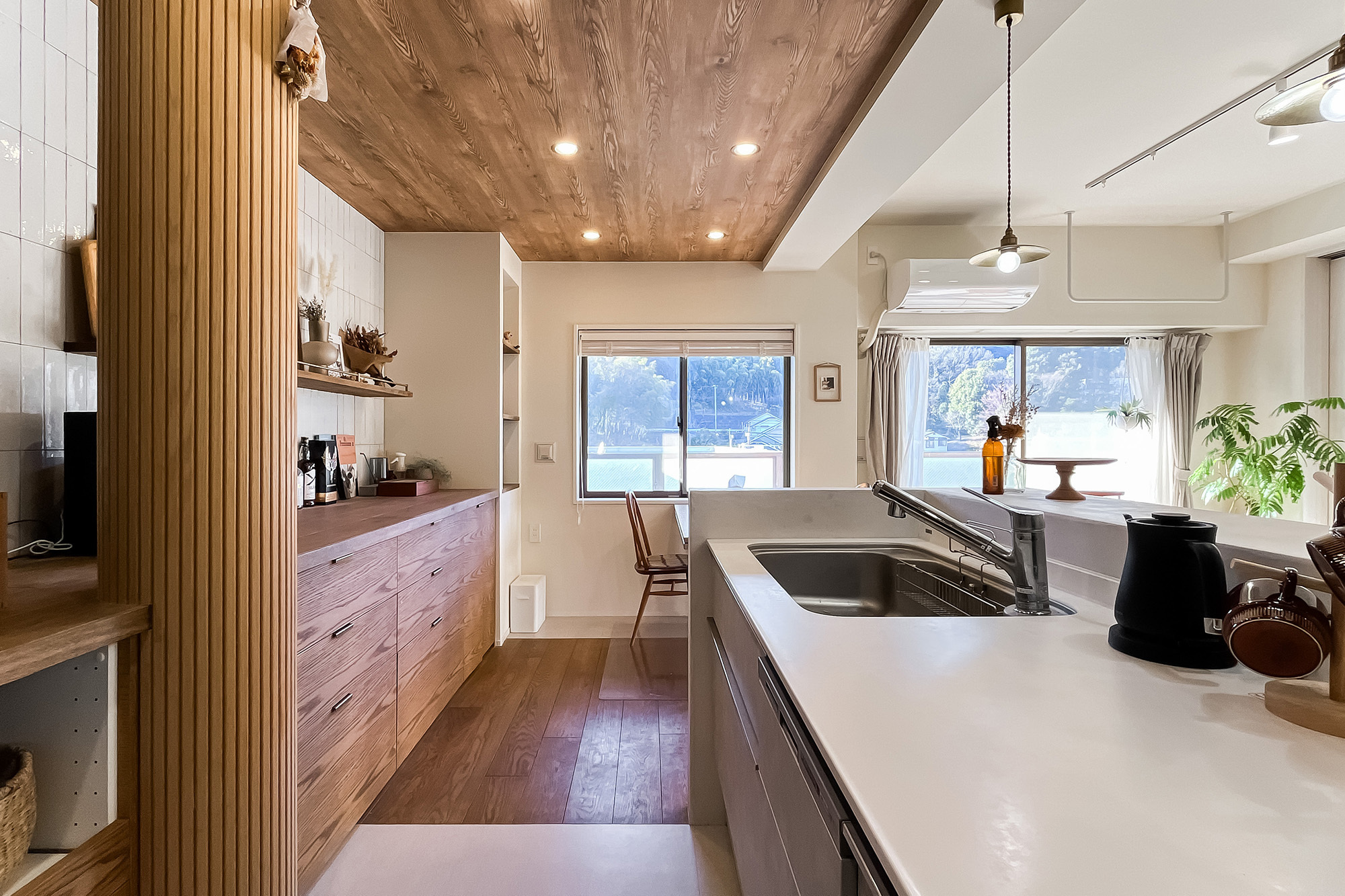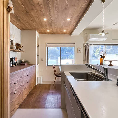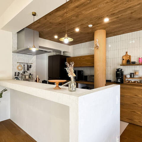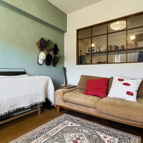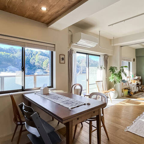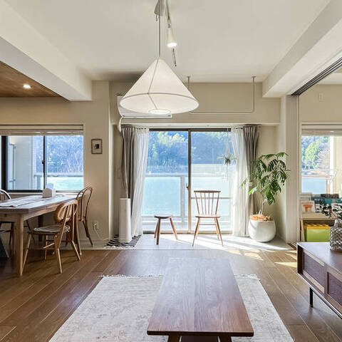 インテリアのプロである設計デザイナーのご夫婦が仕立てた住まいは、こんもりとした緑地を望む晴れやかな2LDK。白と木を基調にした内装は、金物のゴールドをアクセントにしたナチュラルヴィンテージなテイストです。塗装やタイルなど、異素材MIXの技にもご注目ください。