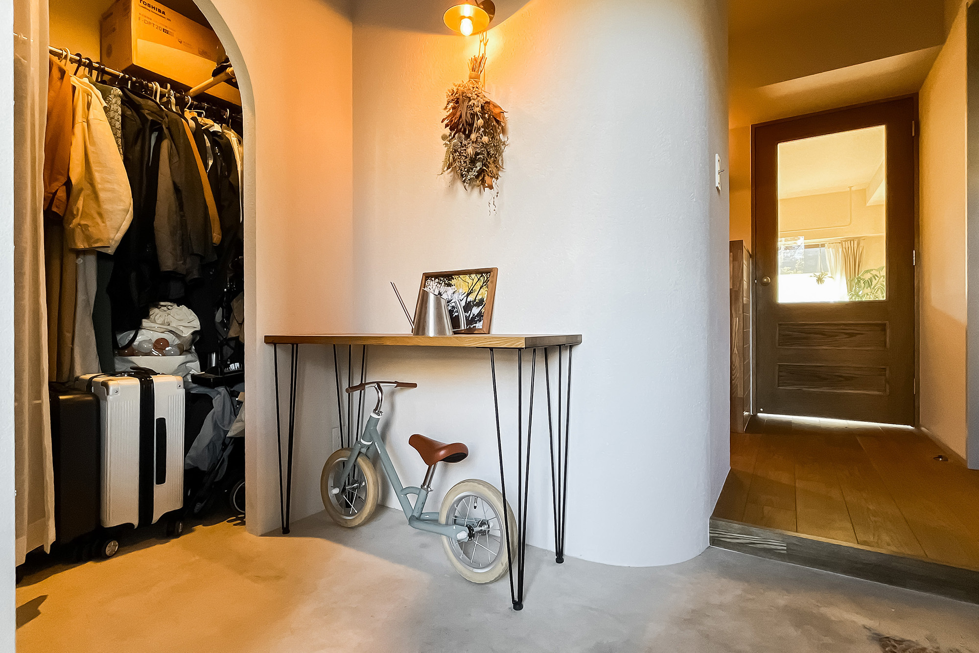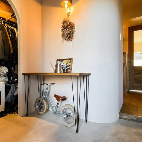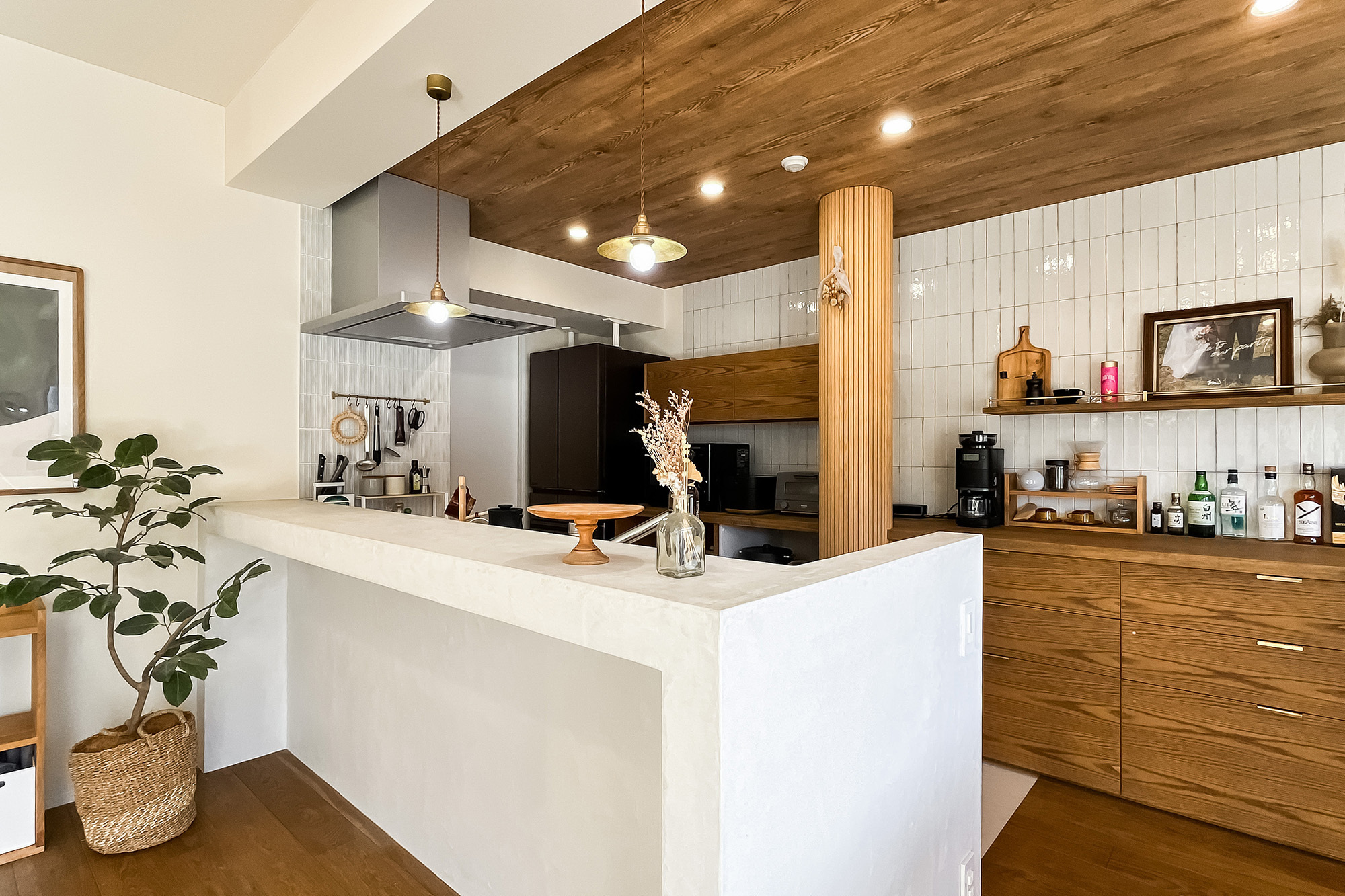 インテリアのプロである設計デザイナーのご夫婦が仕立てた住まいは、こんもりとした緑地を望む晴れやかな2LDK。白と木を基調にした内装は、金物のゴールドをアクセントにしたナチュラルヴィンテージなテイストです。塗装やタイルなど、異素材MIXの技にもご注目ください。