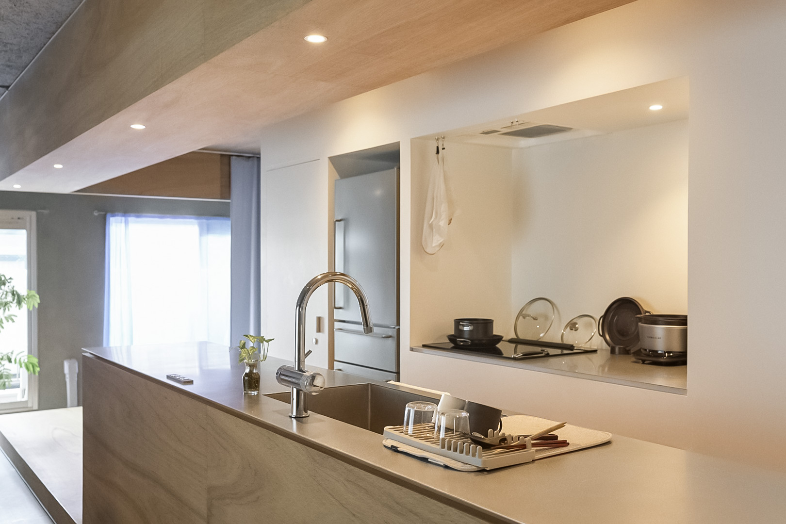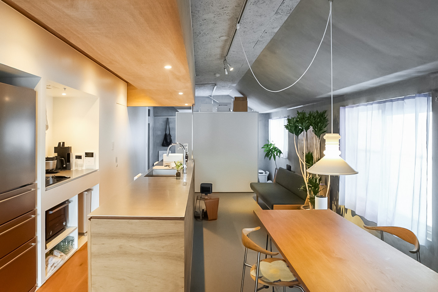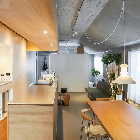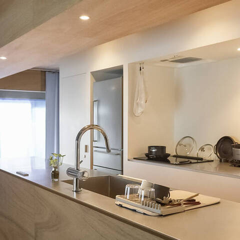洗面台とキッチン。洋室とベッドスペース。それらを隔てる “当たり前” の境界線を、一本の長いカウンターと可動式収納が心地よく溶かした空間です。ステンレスや塗装の無骨さと、木やマーモリウムが織りなす繊細な表情。自然豊かな小金井で、素材美が際立つ既存の枠組みに縛られない暮らしを。