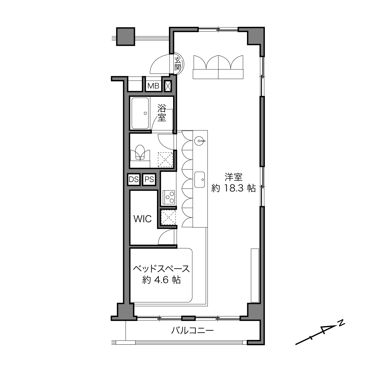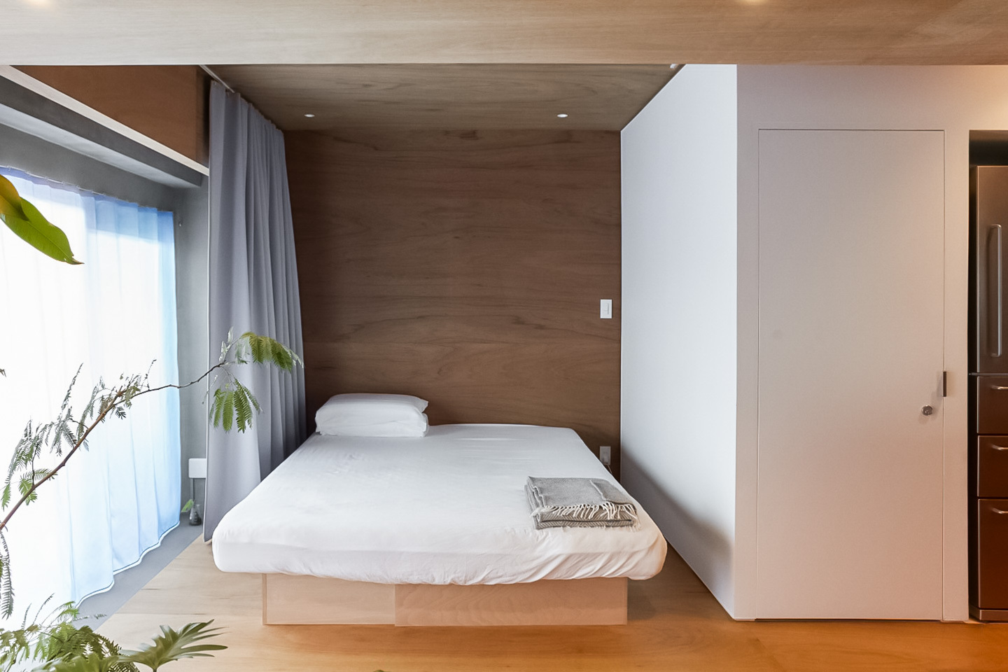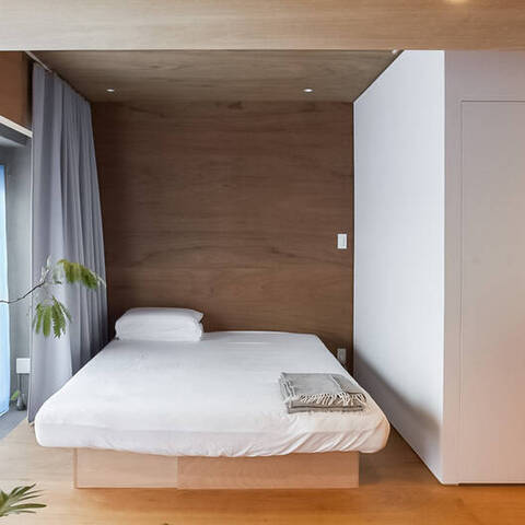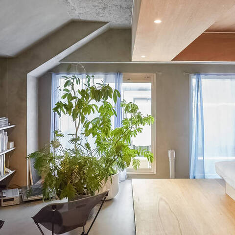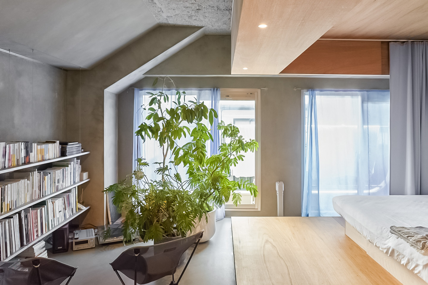 洗面台とキッチン。洋室とベッドスペース。それらを隔てる “当たり前” の境界線を、一本の長いカウンターと可動式収納が心地よく溶かした空間です。ステンレスや塗装の無骨さと、木やマーモリウムが織りなす繊細な表情。自然豊かな小金井で、素材美が際立つ既存の枠組みに縛られない暮らしを。