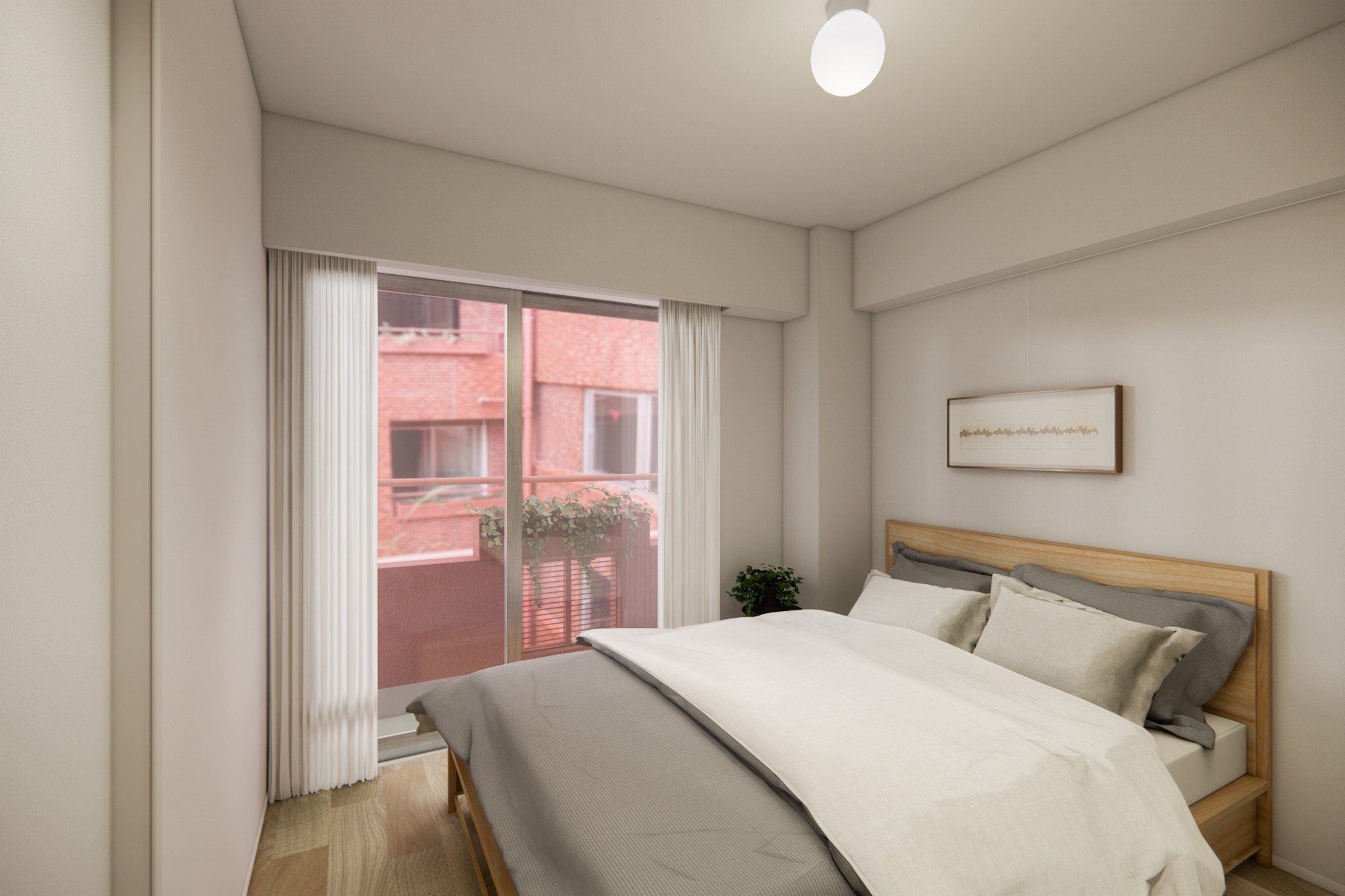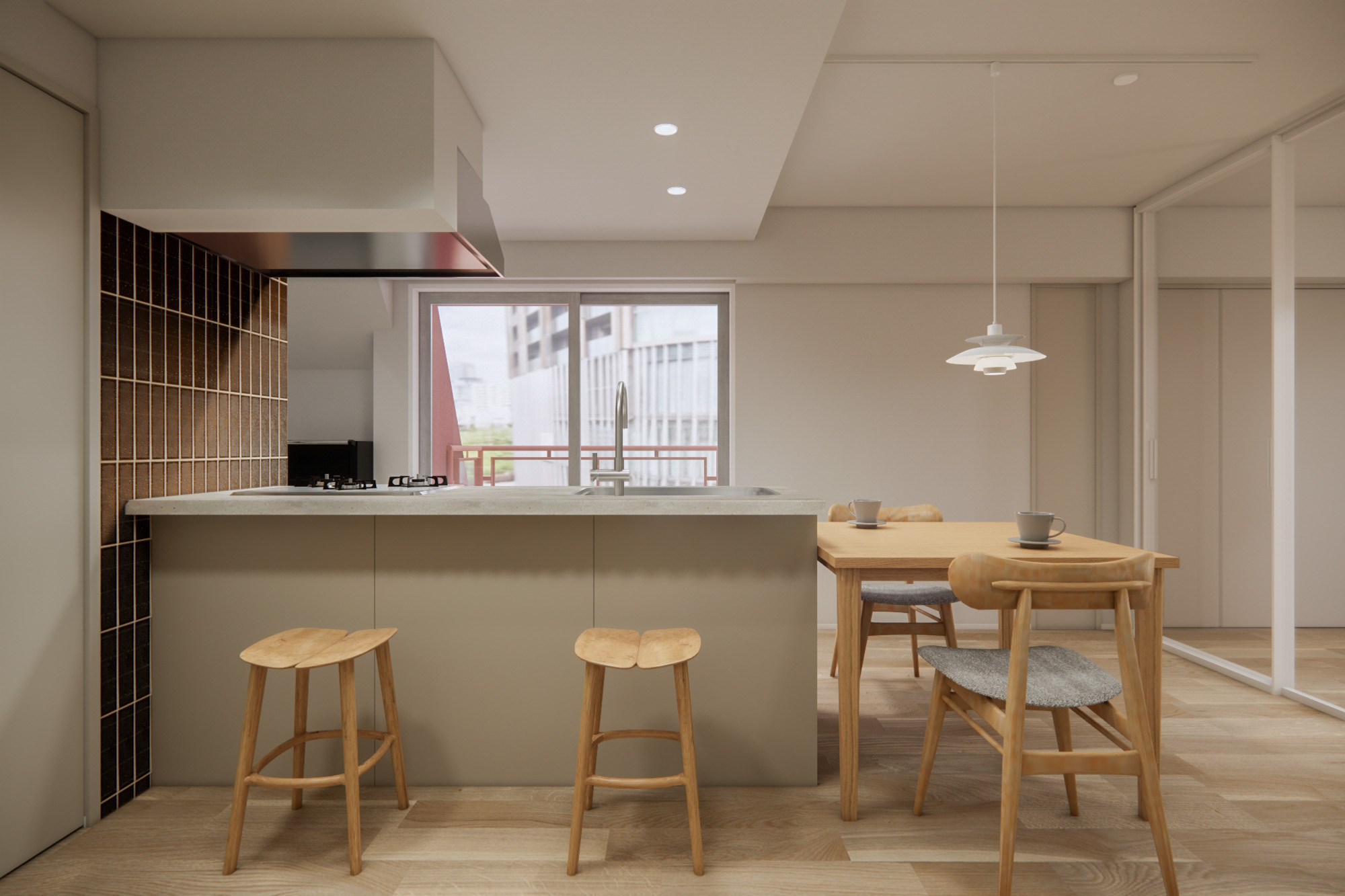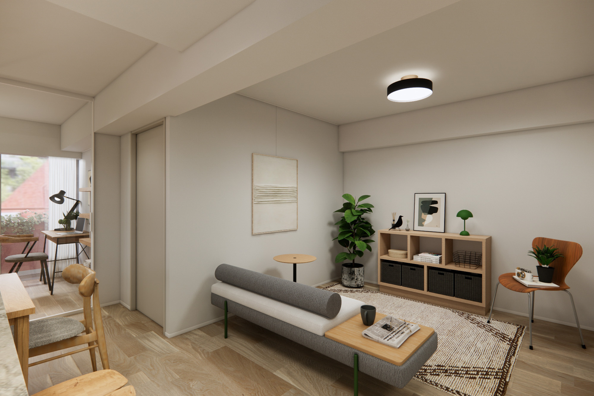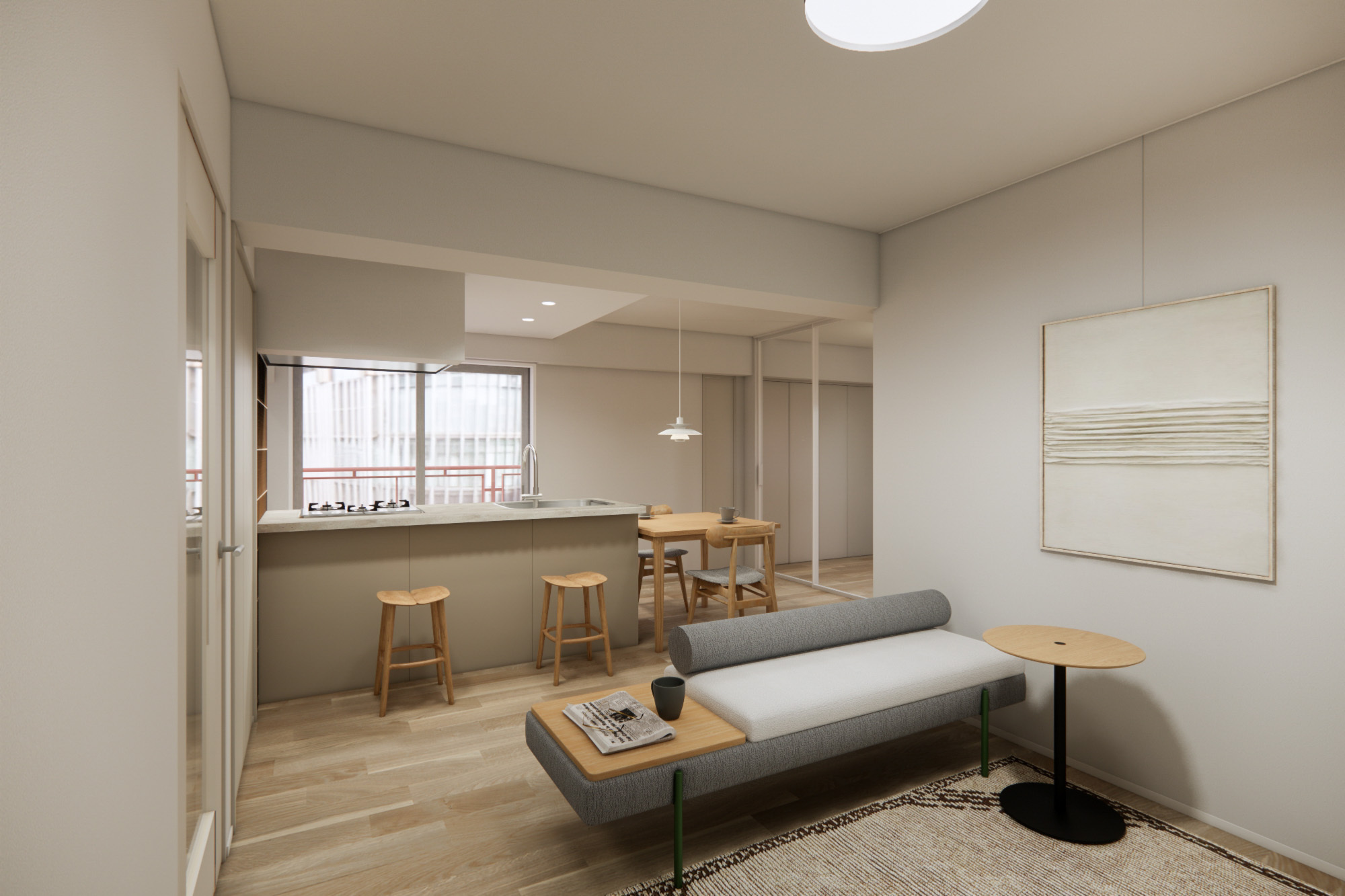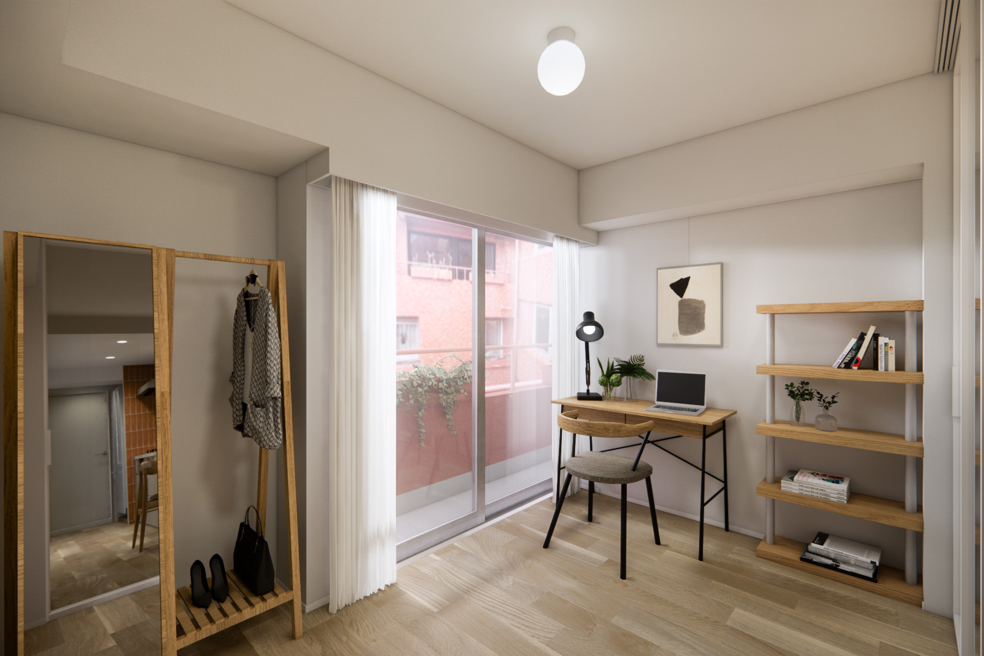 エリアの静謐な雰囲気に寄り添うように、ヴィンテージの余韻とモダンな印象が調和した2LDKの空間。やわらかなオークの床とガラスの透明感が、日々の暮らしを上質さで支えます。全室バルコニー付きの住まいで、お家時間に心地よい余白を。