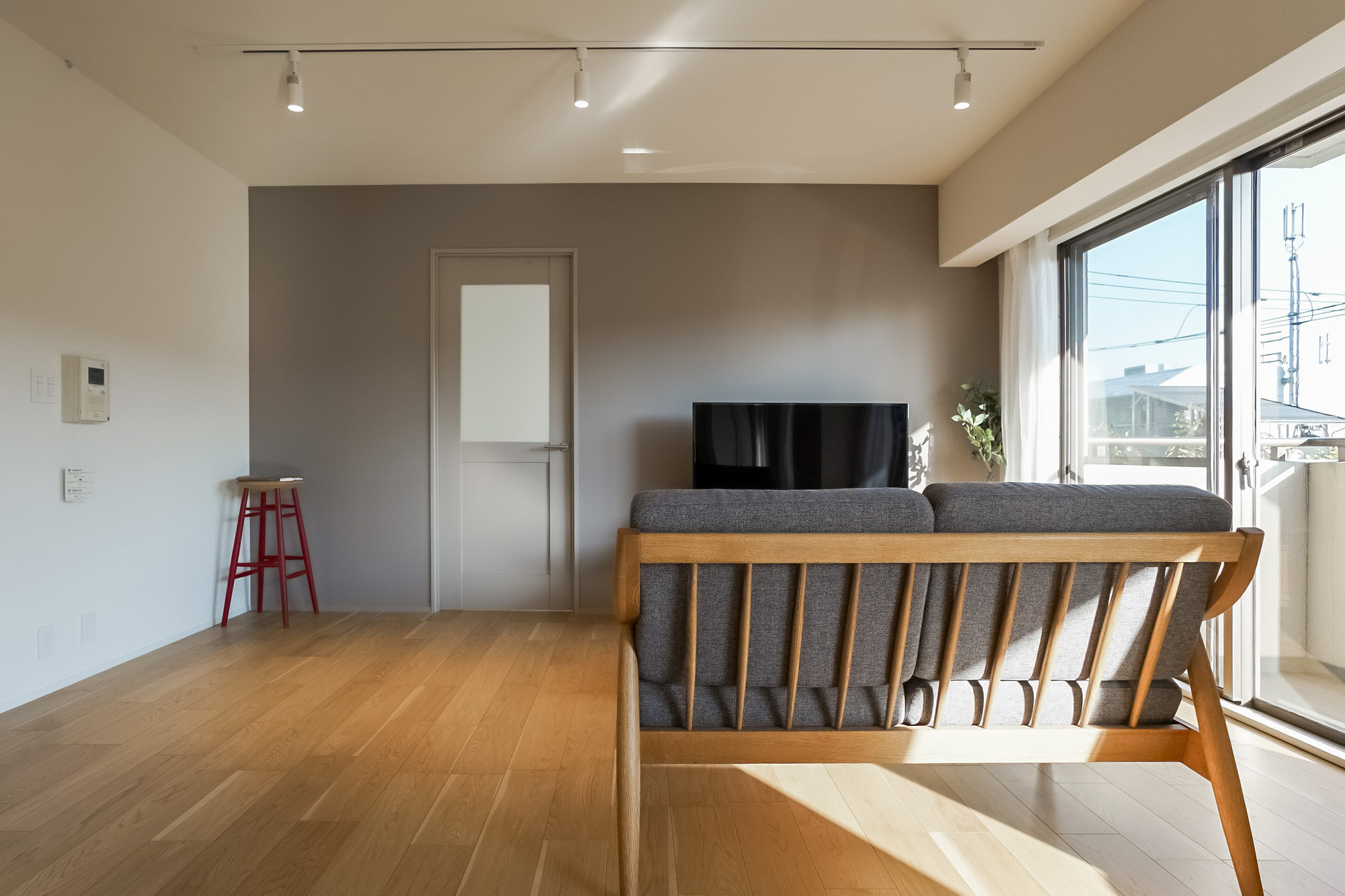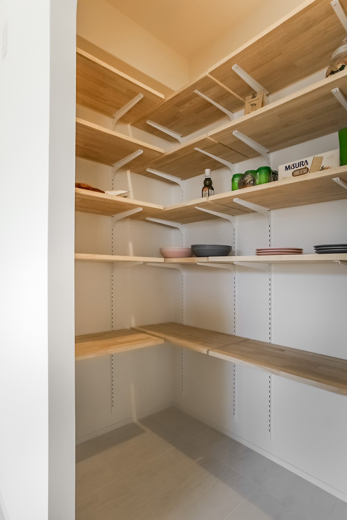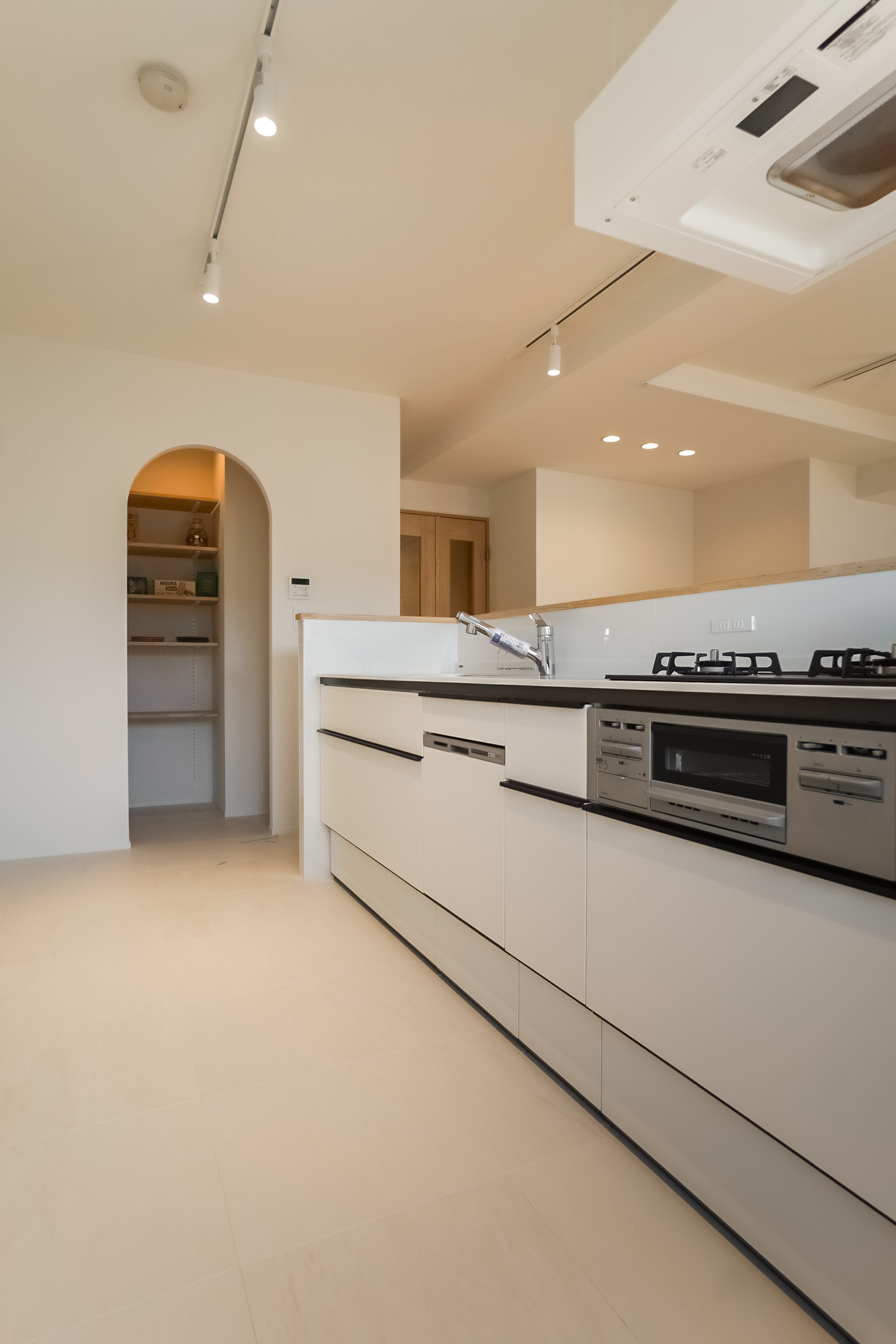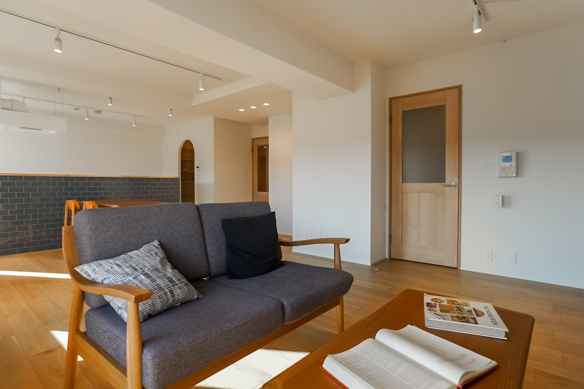 ブルーグレーのタイルがアクセントのアイランドキッチン、明るく広いLDK、暮らしに寄り添う収納、生活感をやわらかく包む内装デザイン。専用の駐車場も添えて、家族の暮らしにゆとりが生まれる陽だまりの角部屋です。