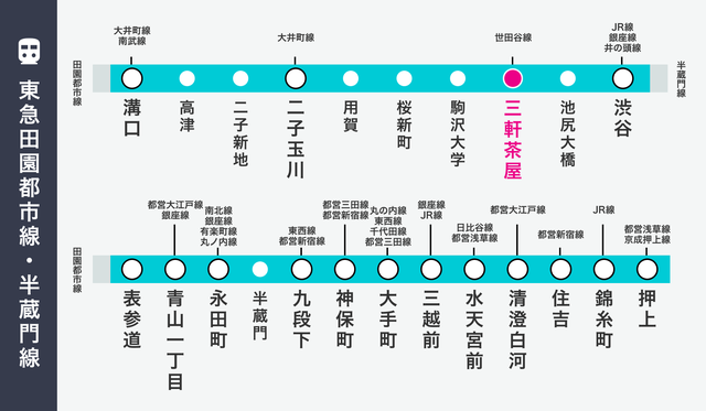 三軒茶屋は世田谷区の東側に位置し、東急田園都市線で二子玉川まで10分、渋谷まで約5分、そのまま半蔵門線直通で表参道や大手町など都心主要エリアへもアクセス出来ます。