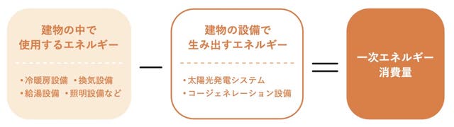 ・一次エネルギー消費量=建物のエネルギー消費量から創出するエネルギー量を差し引いたもの