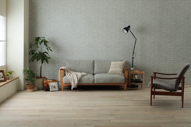 床材は中間色や濃色の木目を選ぶと落ち着いた印象に。照明や壁材も無彩色で統一すると空間全体に統一感が生まれます。