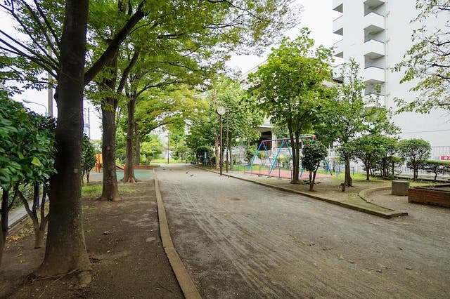 小名木川沿いに位置する高森公園は、滑り台やブランコなどの遊具と、休憩用のベンチが設けられた、地域の子どもたちや住民の憩いの場となっています。