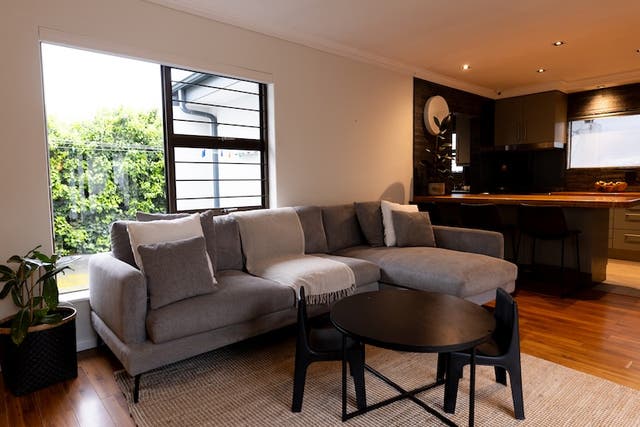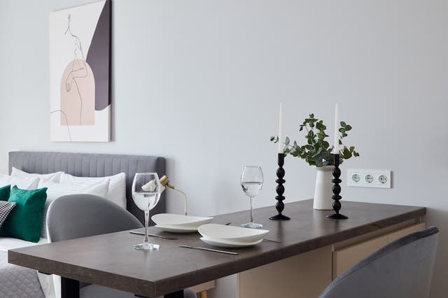 ダークブラウンやグレーのソファとダイニングセットは、空間に落ち着きと上質感を与えやすくなります。家具は装飾の少ないシンプルなデザインを選ぶと、シックなトーンになじみやすくなります。