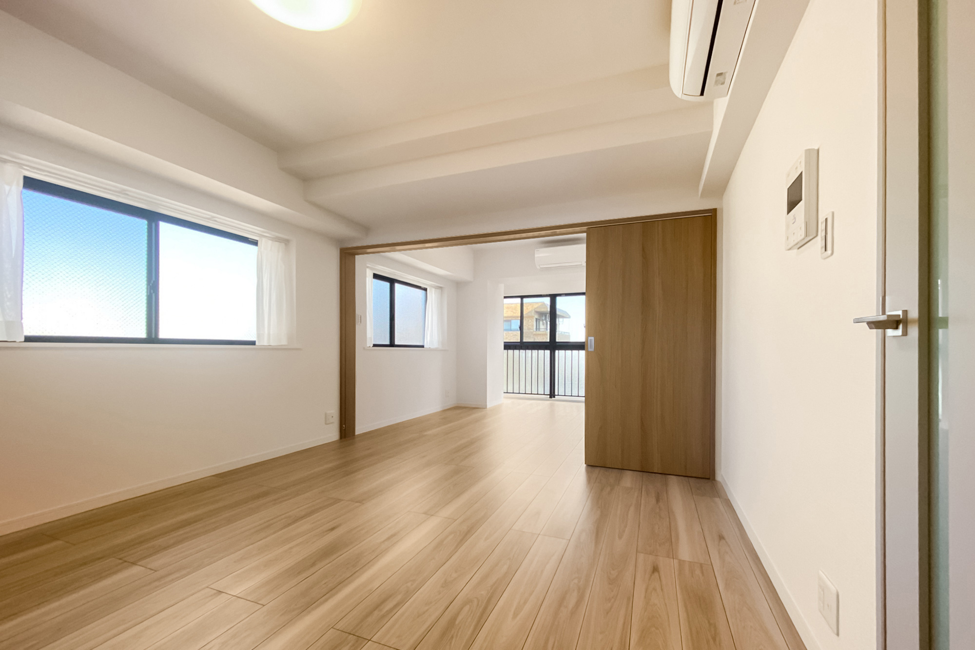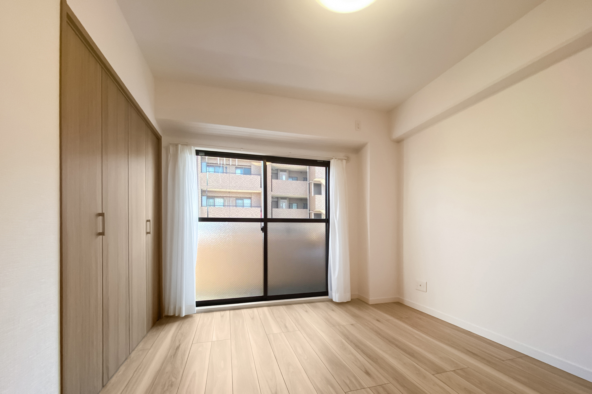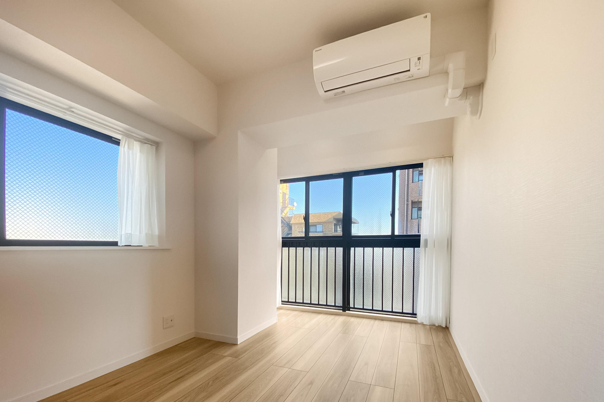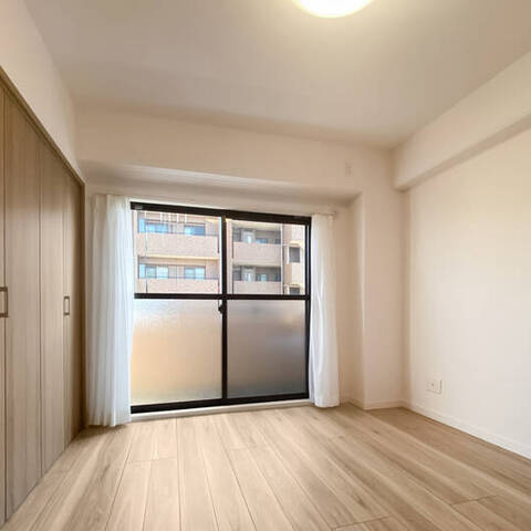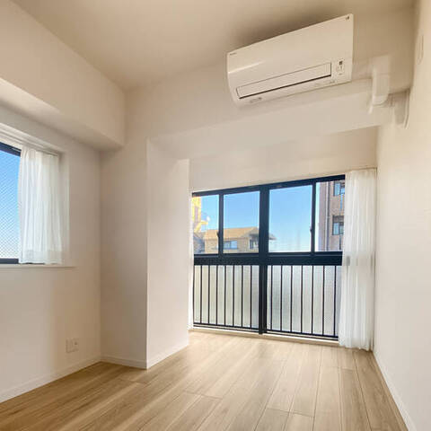 - 8階に所在する角住戸。窓が多く、風通しがよさそうです。専有面積約55㎡を2LDKにした間取りで、LDKは約11帖。お部屋数が足りていれば、約6.4帖の洋室をLDKの拡張スペースとしてご利用いただくのもおすすめですよ。
