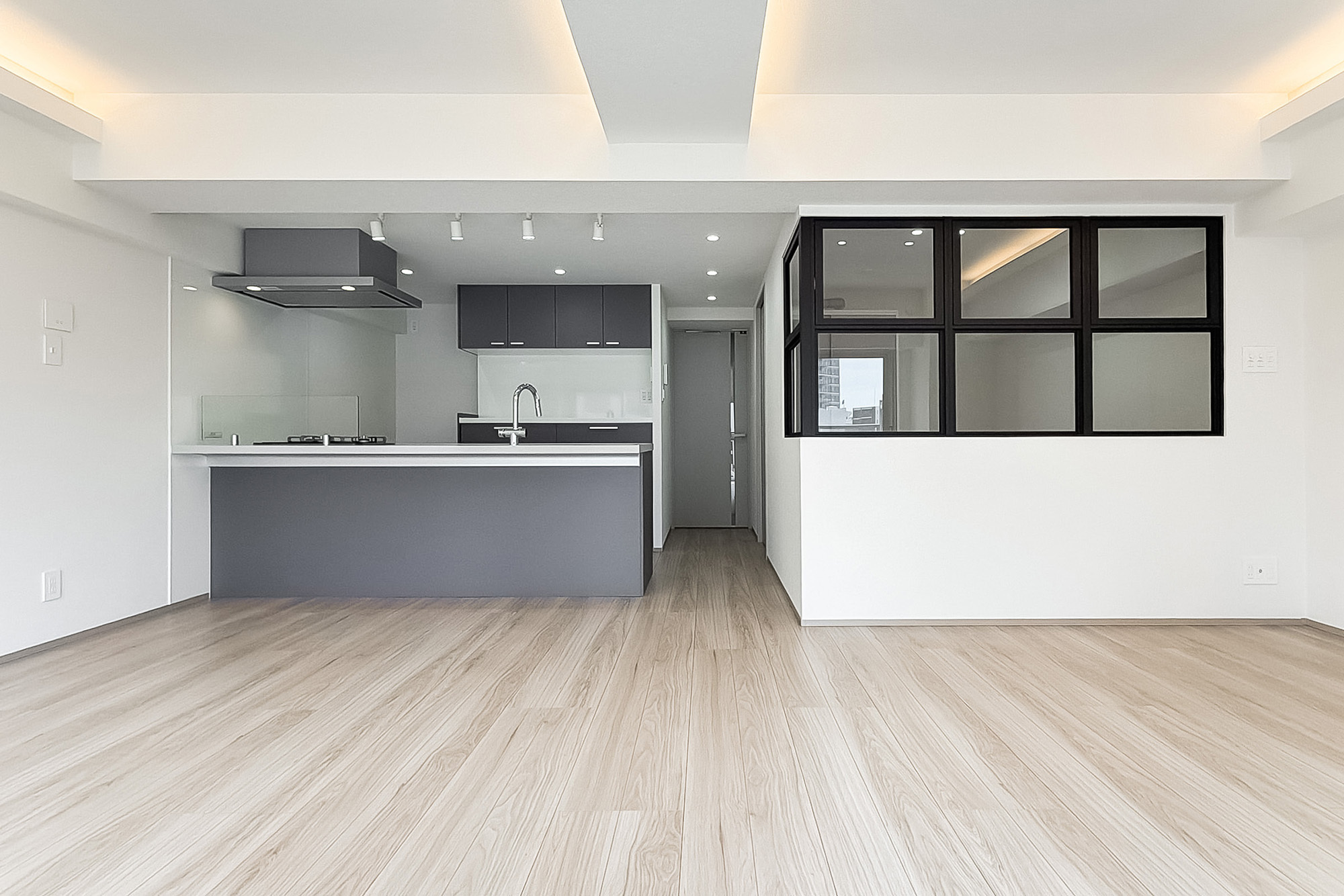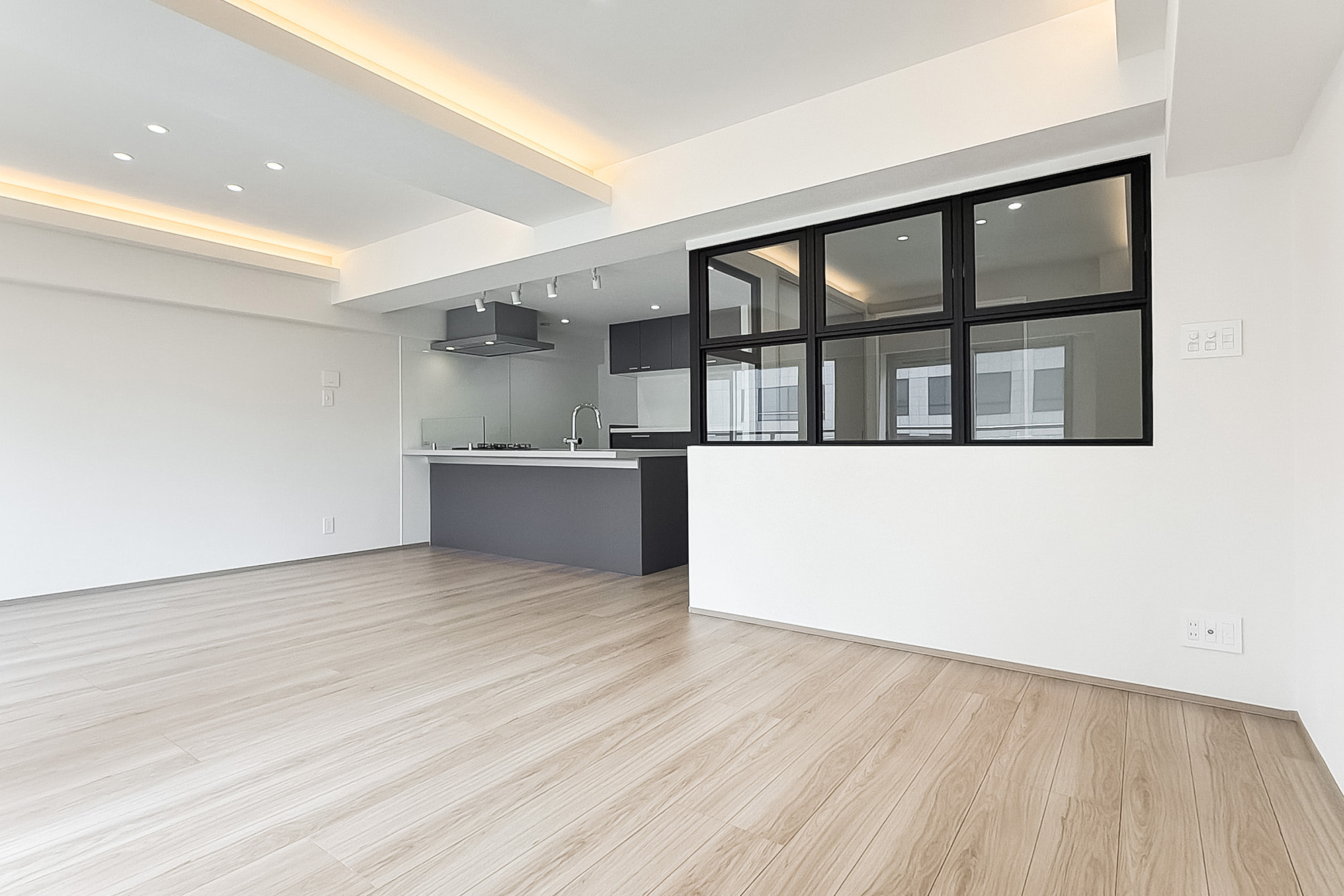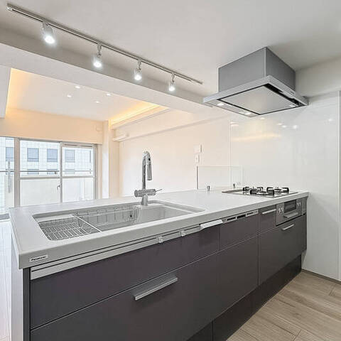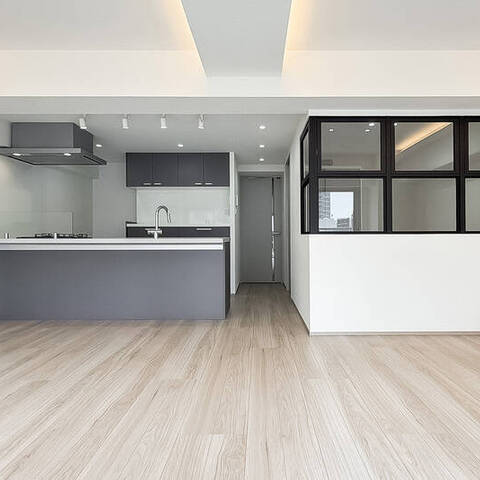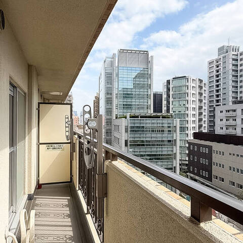 - 住戸の所在階は9階。バルコニーは明治通りの反対側に位置します。専有面積約63㎡を1SLDKにした間取り。洋室には室内窓があり、こちらをワークスペースとしてお使いいただくのもおすすめですよ。