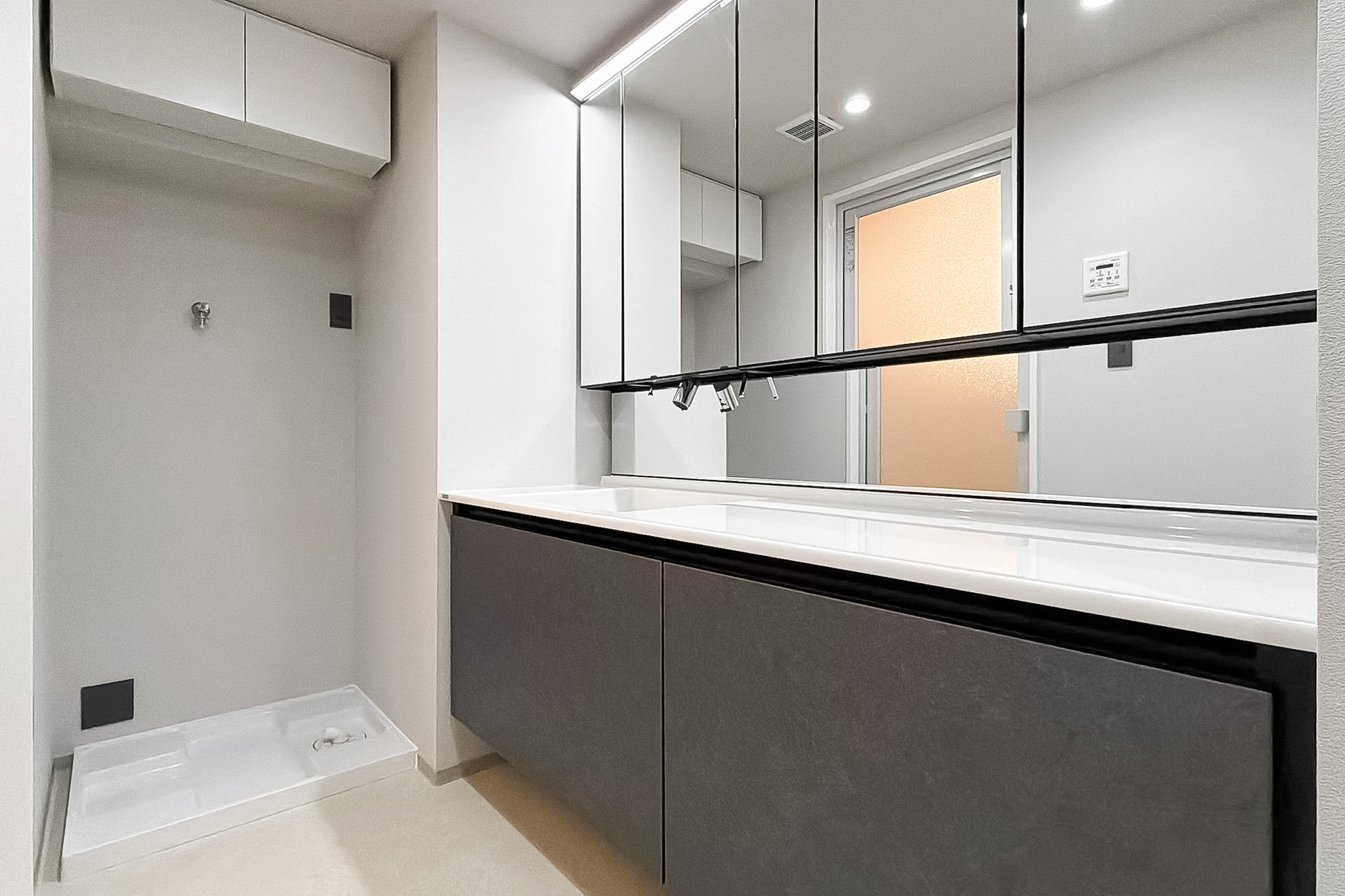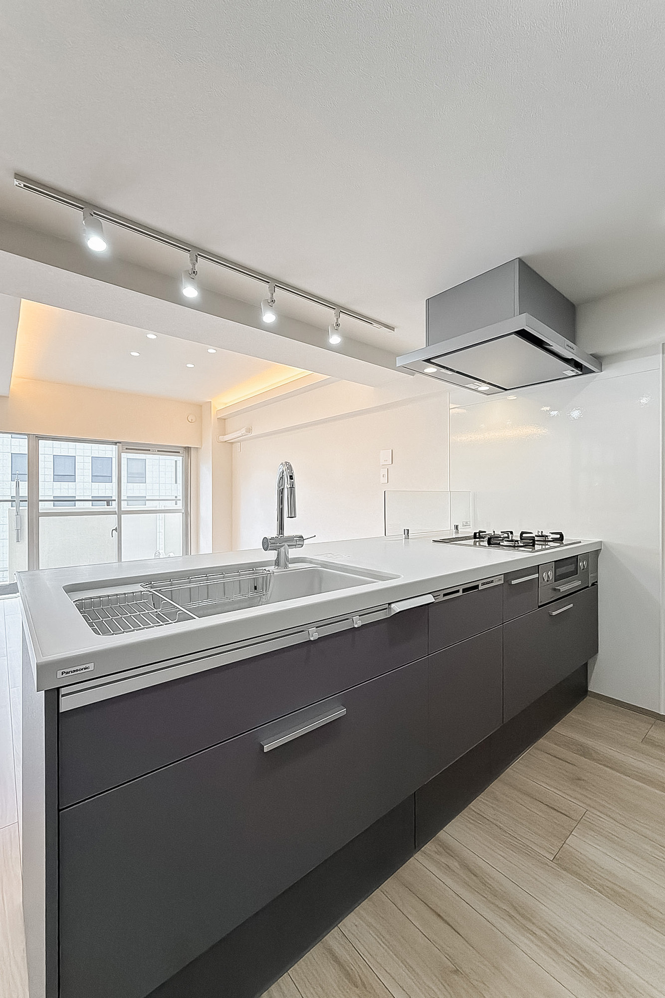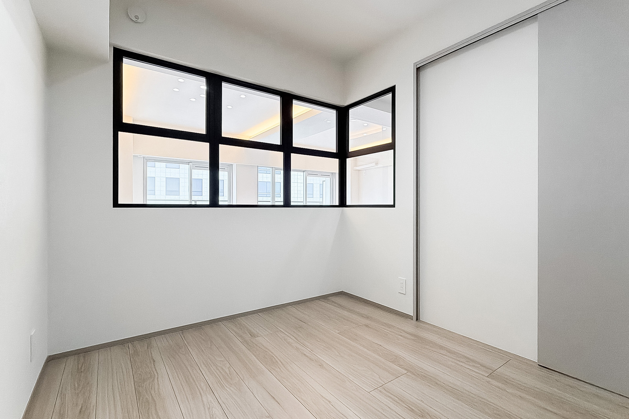 - 住戸の所在階は9階。バルコニーは明治通りの反対側に位置します。専有面積約63㎡を1SLDKにした間取り。洋室には室内窓があり、こちらをワークスペースとしてお使いいただくのもおすすめですよ。