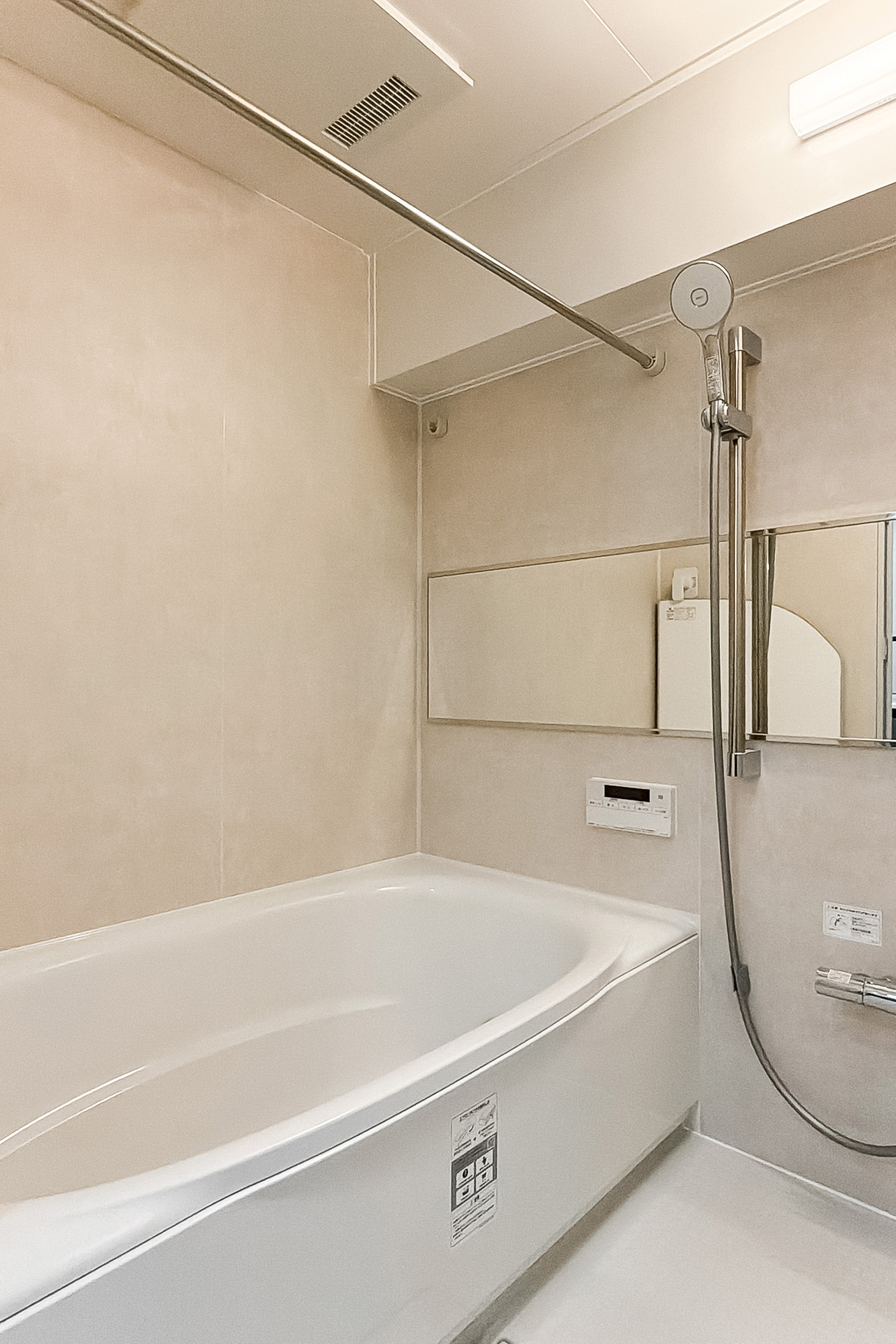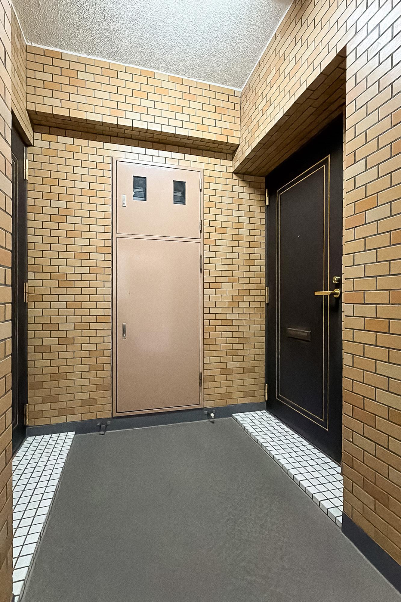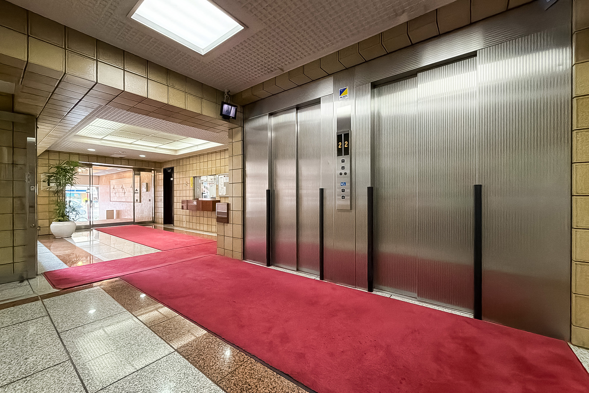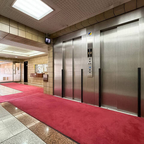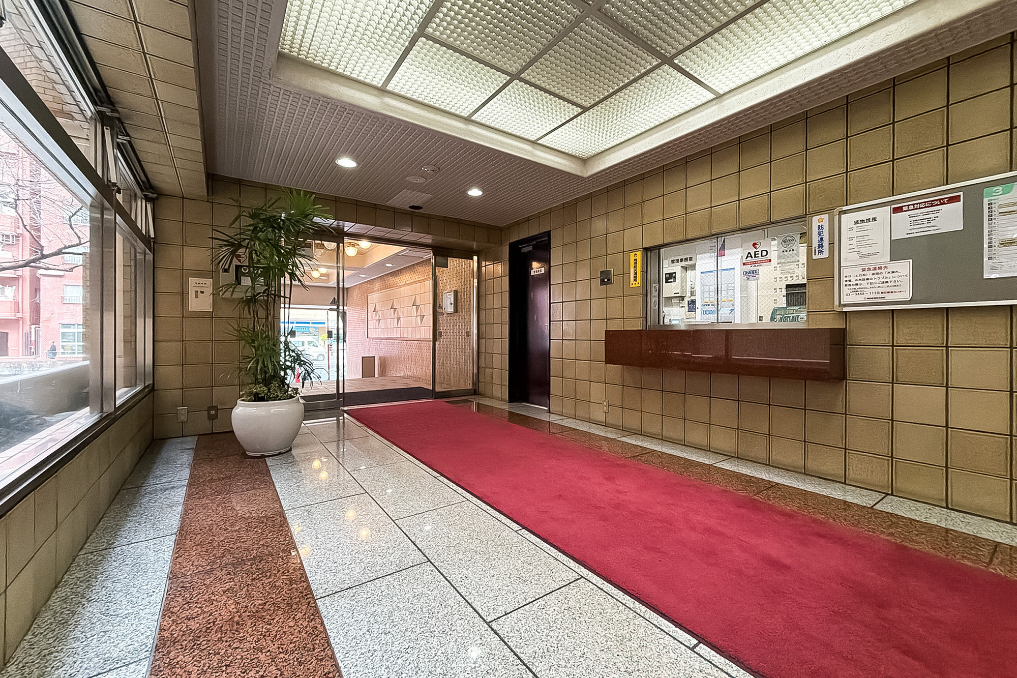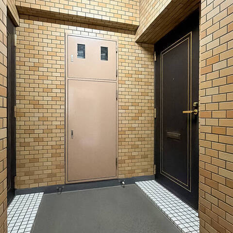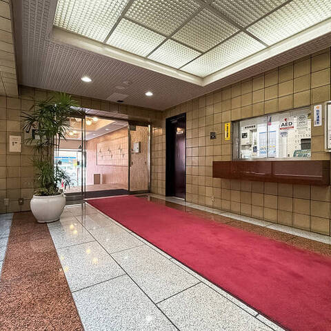 - 明治通り沿いに建つ、1987年竣工の建物。ベージュのタイルをまとった、品のある佇まいです。共用部には夜間オートロックが備わっています。