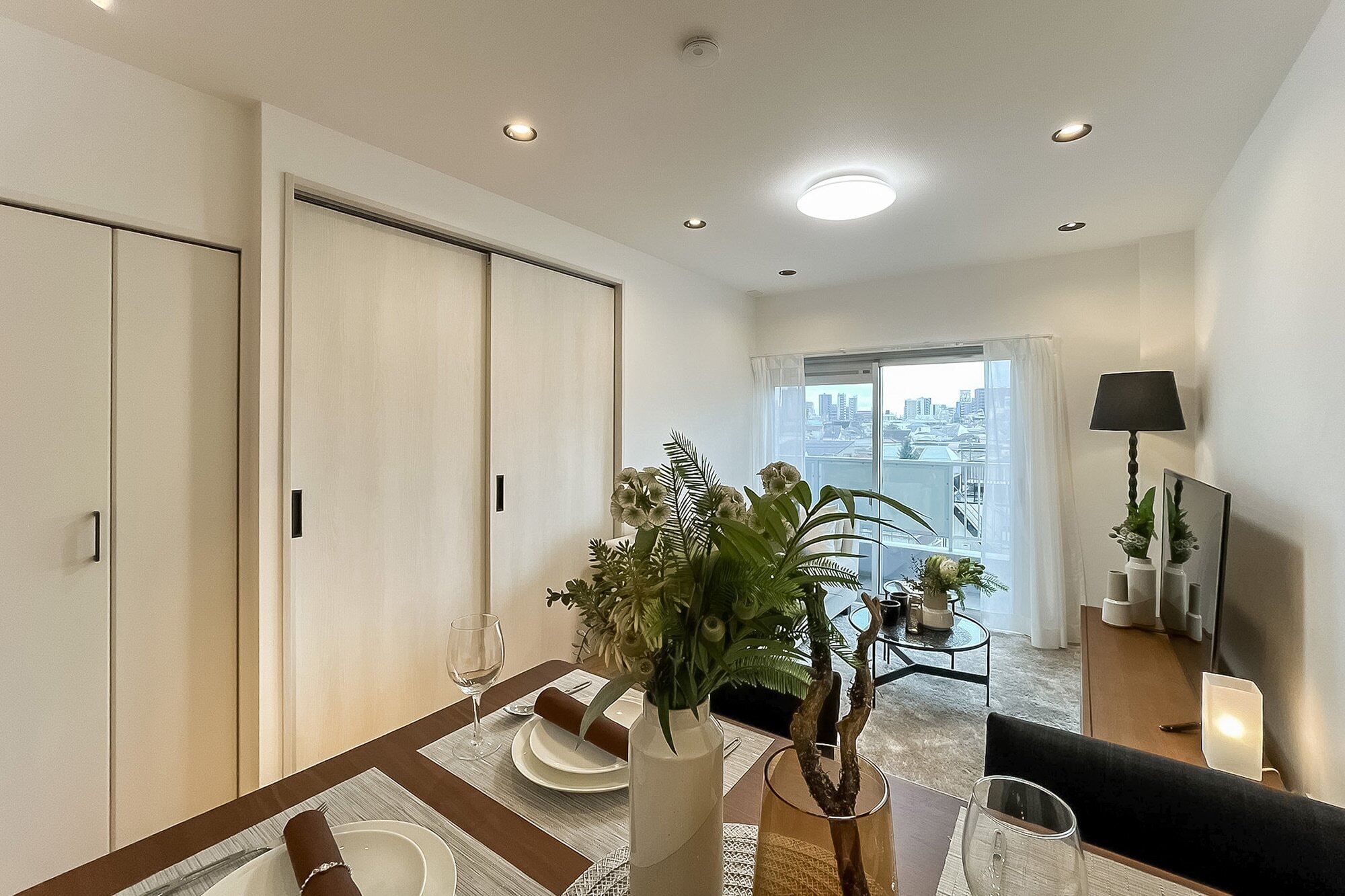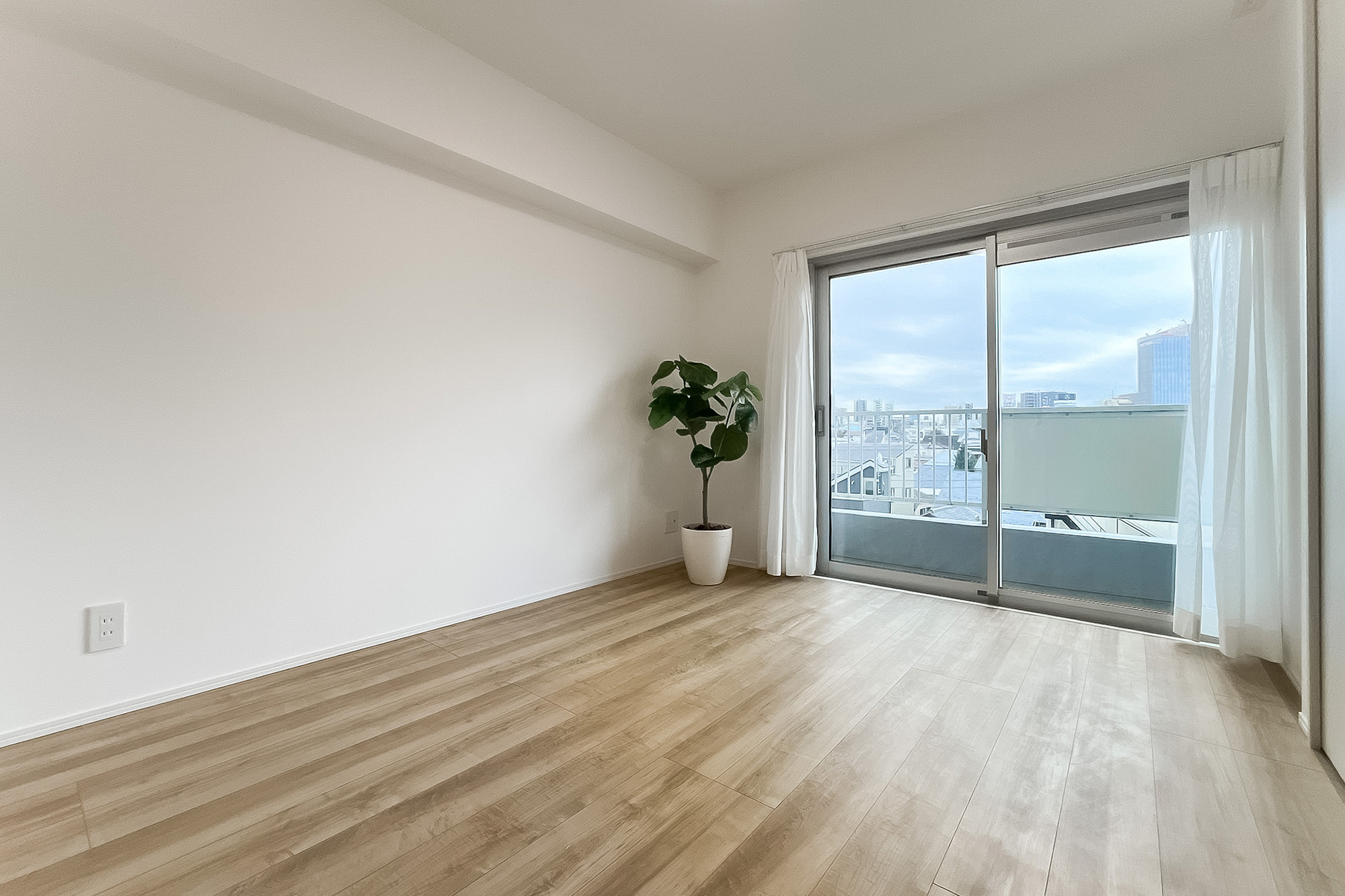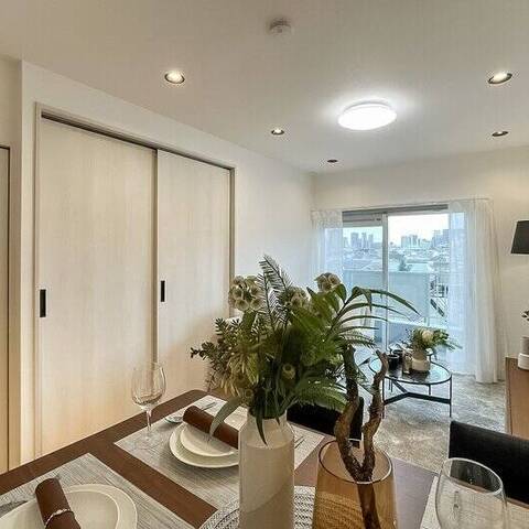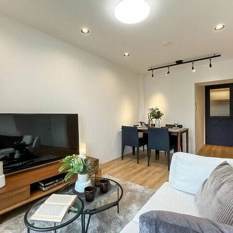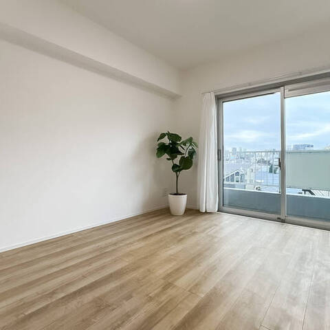 - ご紹介するのは5階に所在する住戸。バルコニーからの眺望には抜けがあり、南向きで日当たりもよさそうです。LDKは約11.4帖。キッチンが奥まった場所に位置する生活感の出にくいつくりです。約3.8帖の洋室は、ワークスペースや趣味の部屋としてご利用いただくのもおすすめですよ。
