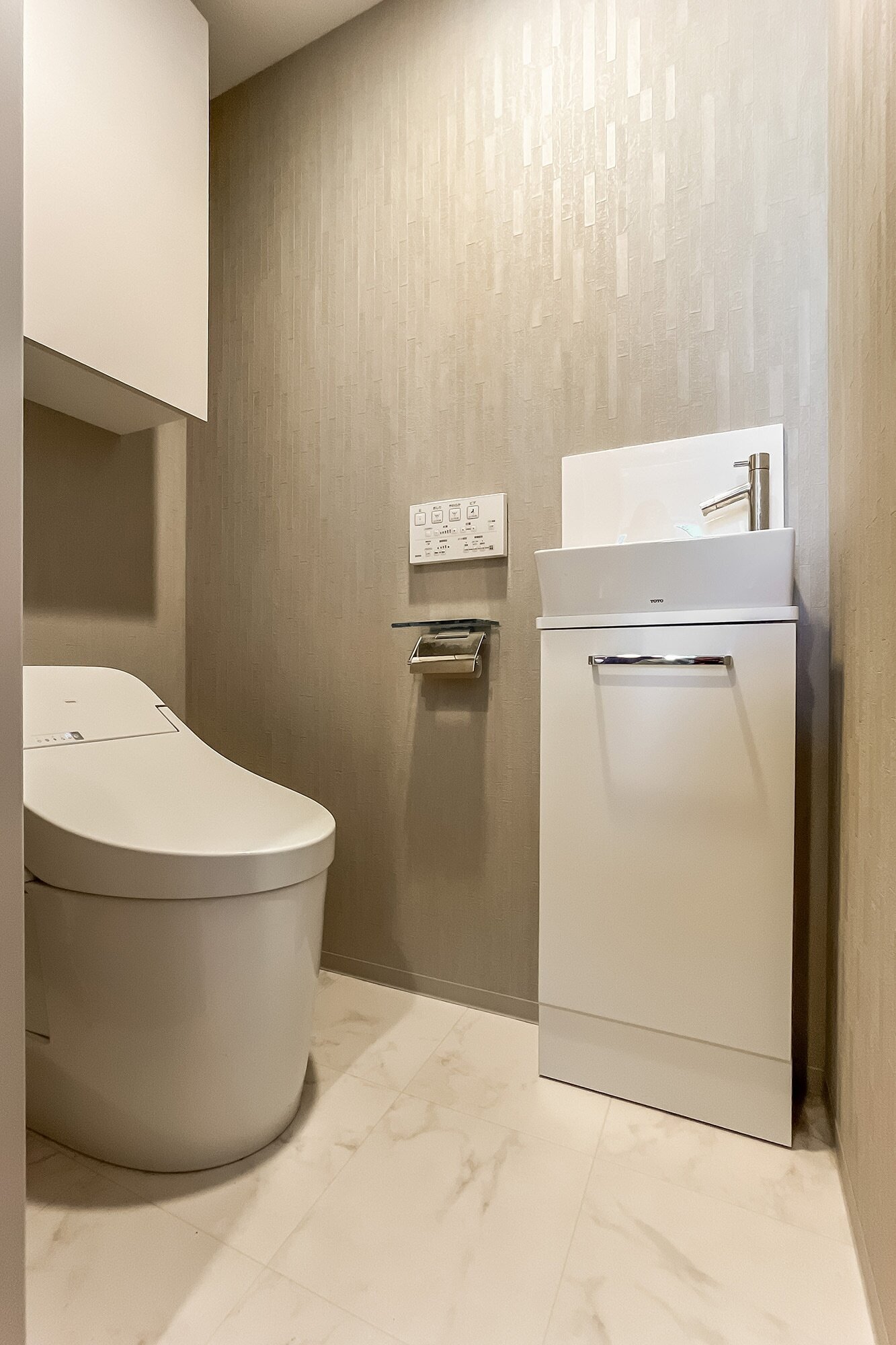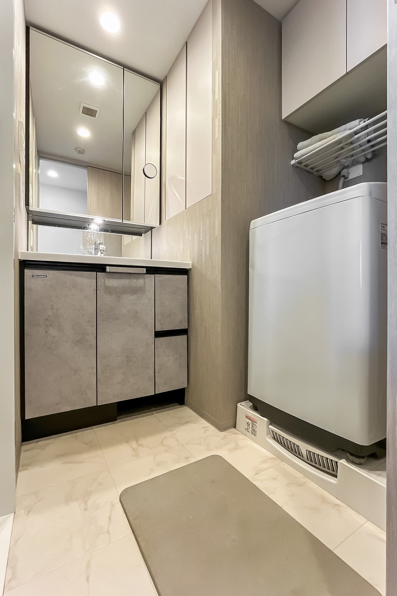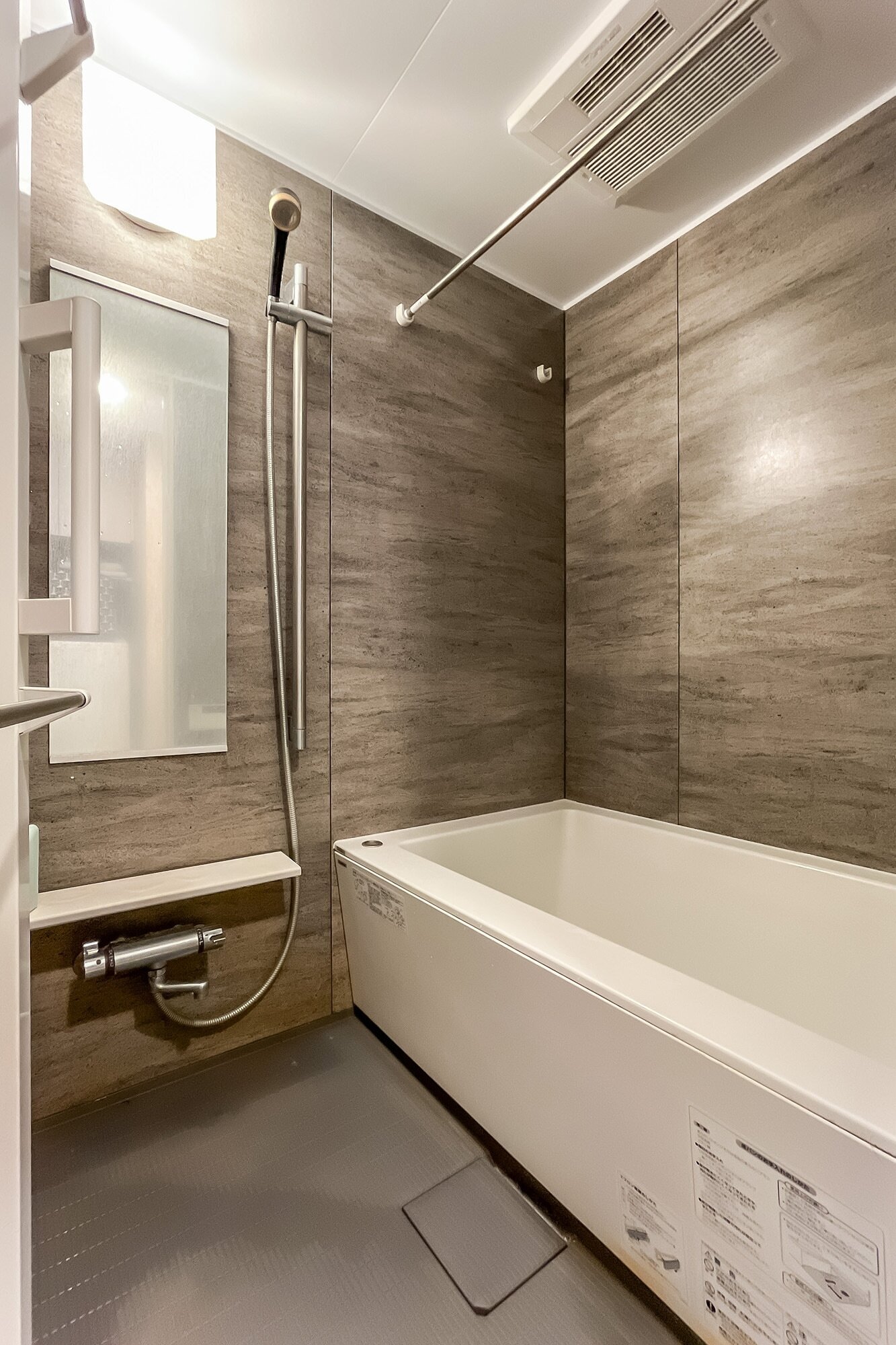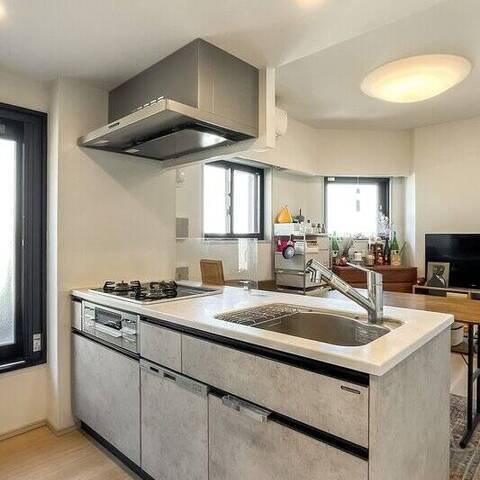 - 水まわりはグレーのトーンで統一されていてスタイリッシュな印象。浴室には浴室換気暖房乾燥機が付いています。雨の日も洗濯物を干せるので安心です。