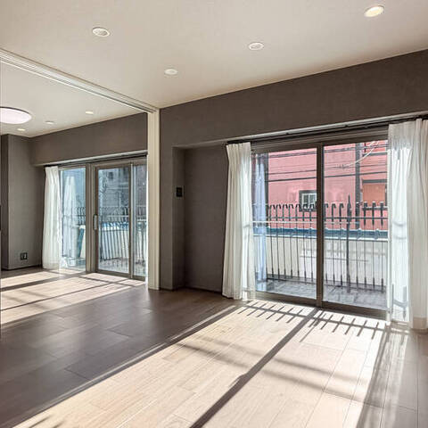 - 住戸は2階の南東角に所在します。バルコニーにぐるりと囲まれ、窓がたっぷり。風が気持ちよく通り抜けてくれそうですね。すべての居室がバルコニーに面しているのも◎ 専有面積約84㎡を4LDKにした、お部屋数が欲しいファミリーさんにフィットしそうな間取りです。LDKは約14.7帖、洋室はそれぞれ5帖以上の広さを確保していますよ。