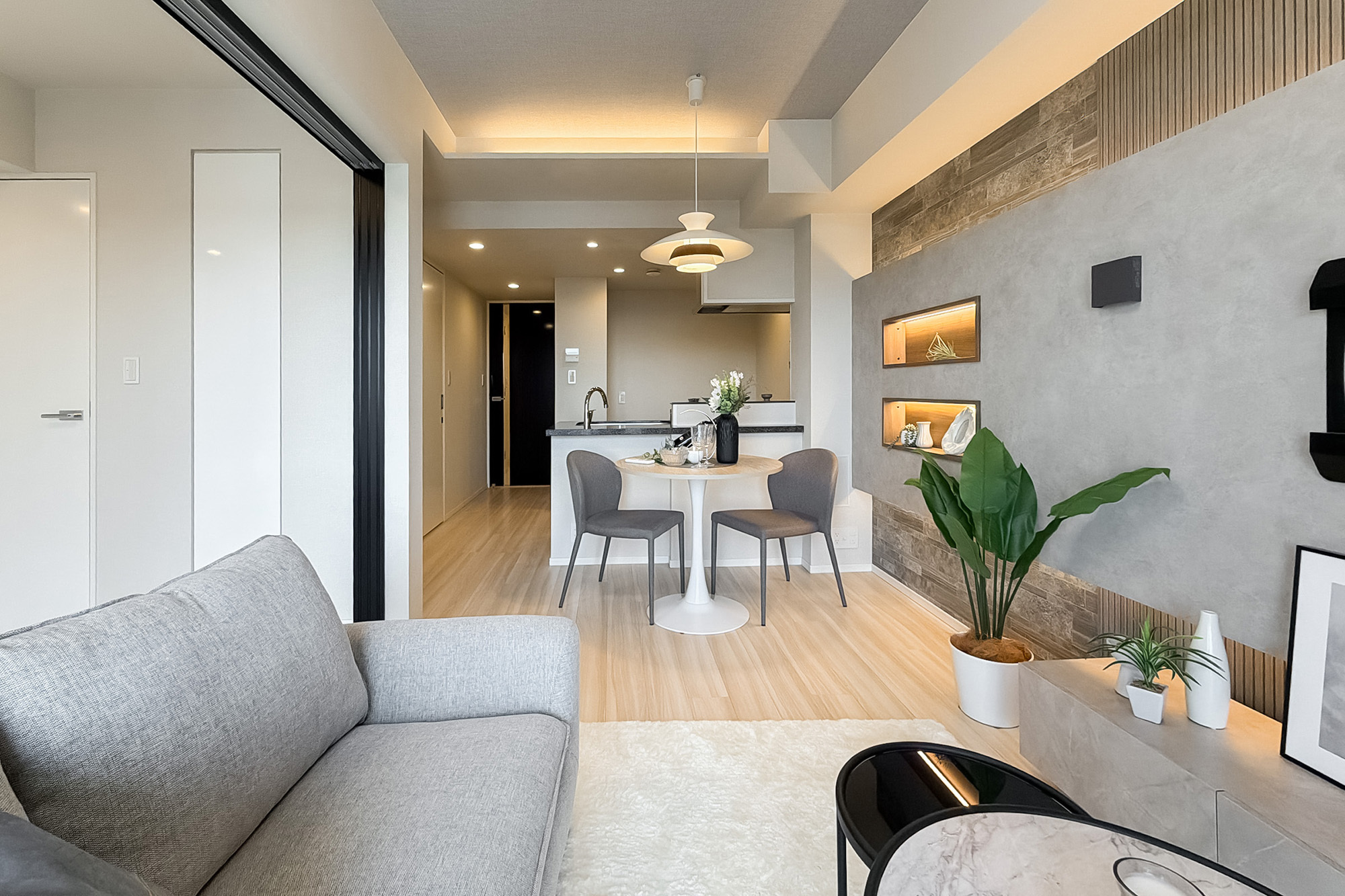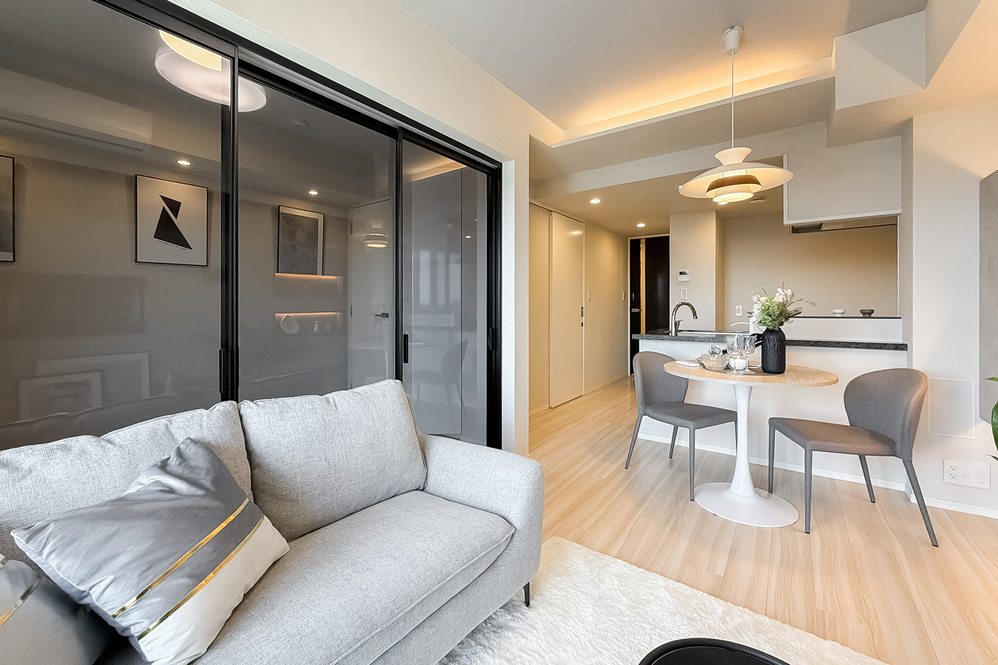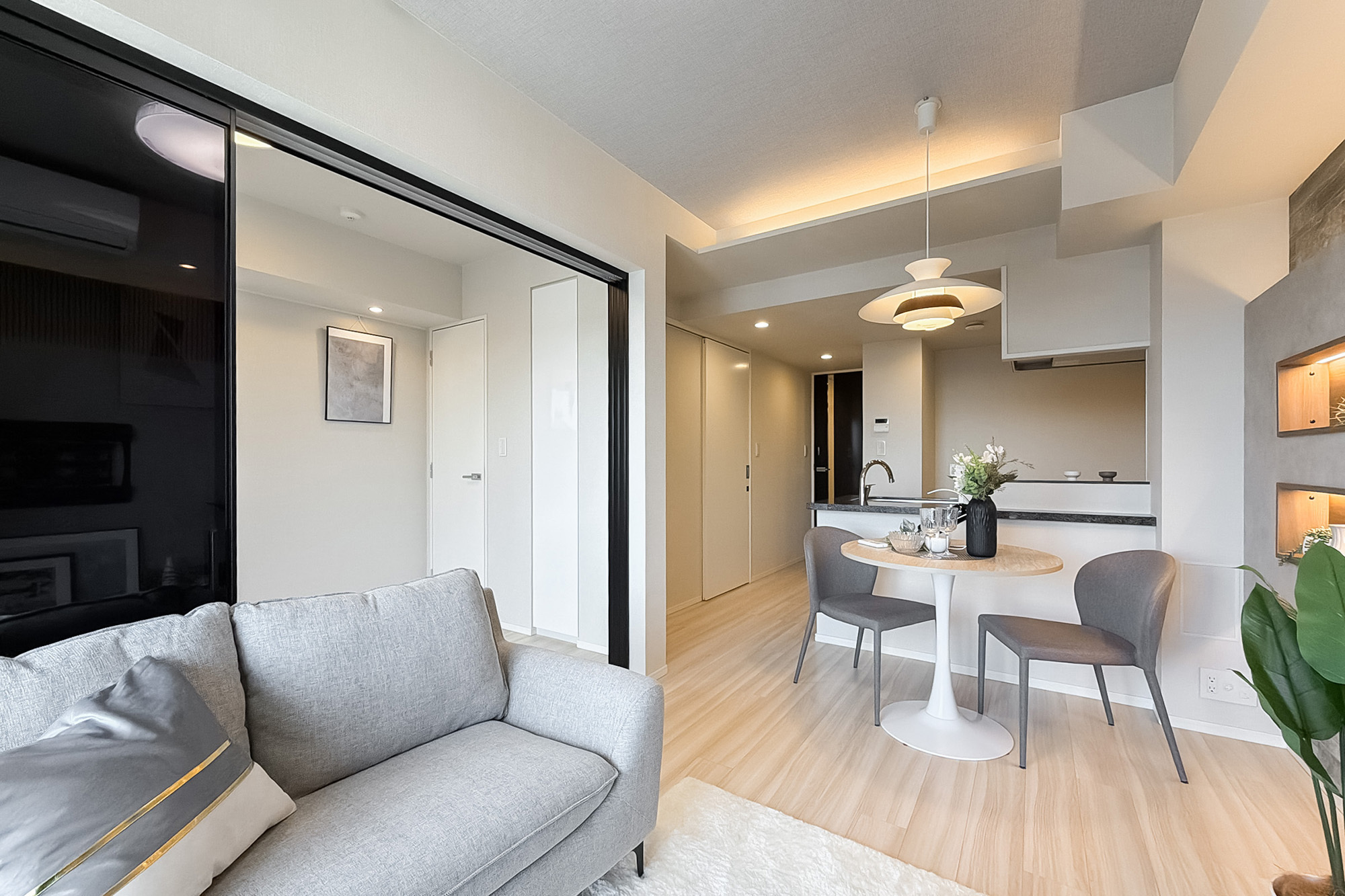 リノベーション内容:レンジフード交換/トイレ交換/クロス張替え/建具一部交換/各所水栓・一部アクセサリー交換/新規意匠造作 他