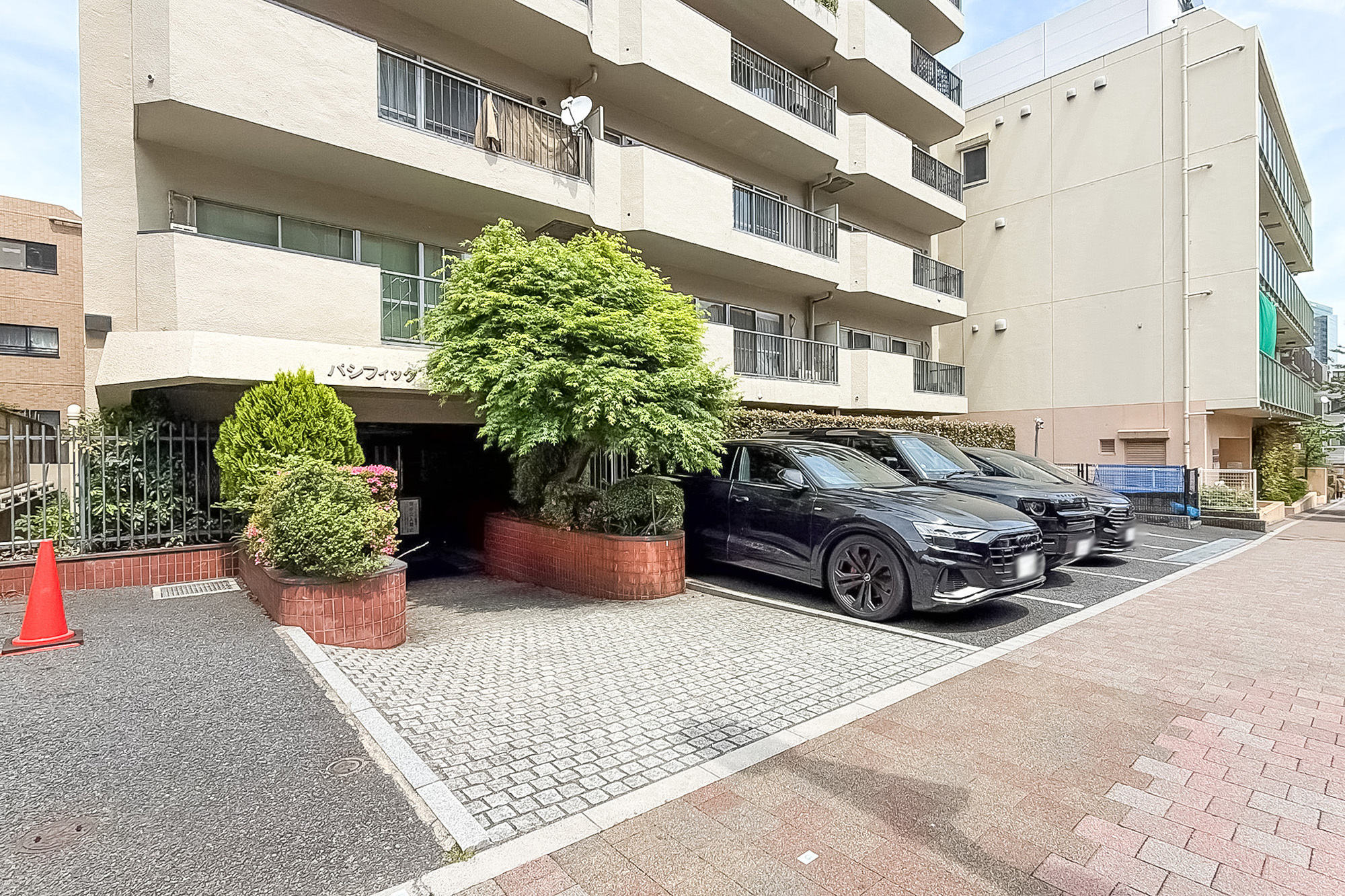 - レンガ調の花壇や少し変わった形のバルコニーなど雰囲気のある建物。総戸数は26戸と小規模で、共益費は一般的な相場と比べお高めに設定されています。
