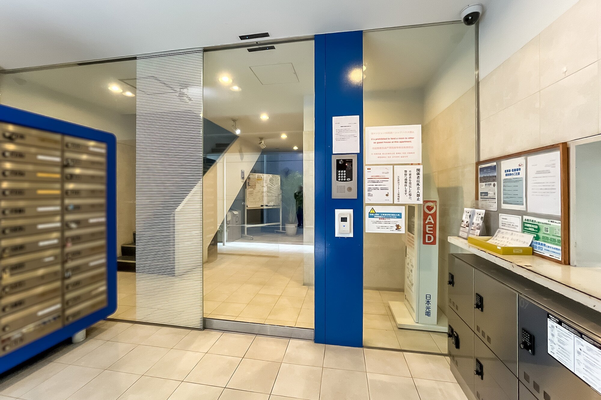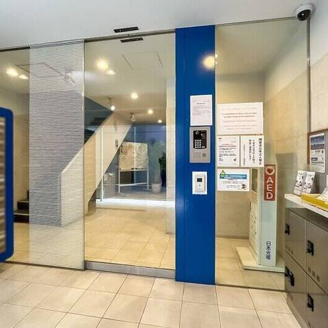 - 1968年竣工の建物。年月を経てもなお外観はくたびれた印象はなく、鮮やかなインディゴブルーのタイルが貼られレトロな雰囲気。それでいてエントランスはきれいに改修され、オートロック・宅配ボックスも備わっています◎ また、細則に基づいてペットの飼育も可能ですよ。