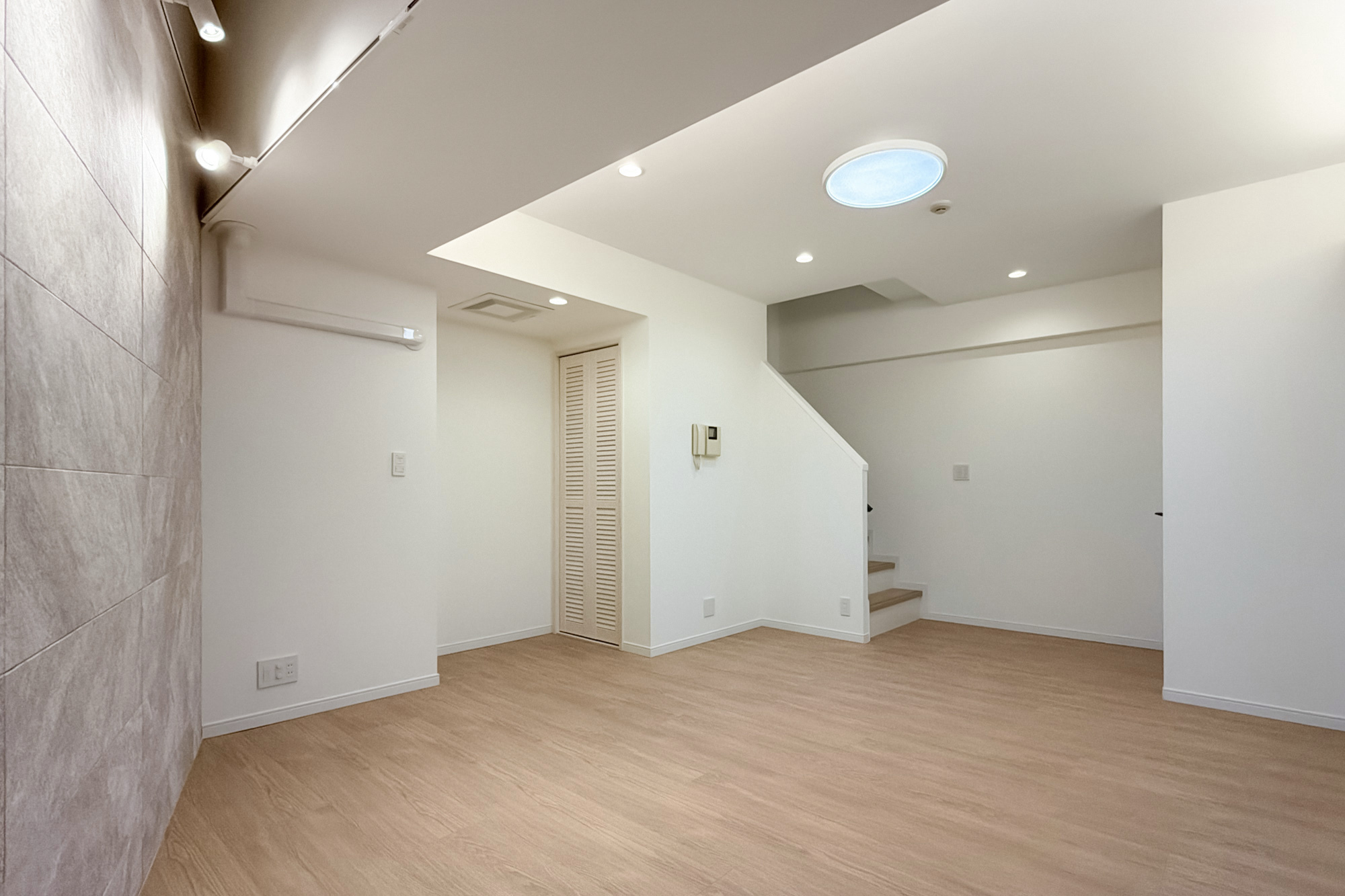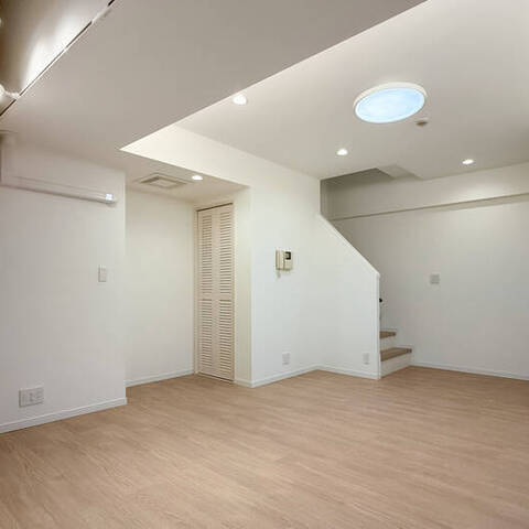 - ご紹介するのは、地下1階・1階に所在するメゾネットタイプの住戸。専有面積約54㎡を1DKにした間取りです。地下1階に所在するゆとりある洋室をリビングスペース兼ベッドルームとしてご利用いただくとよさそうですね。
