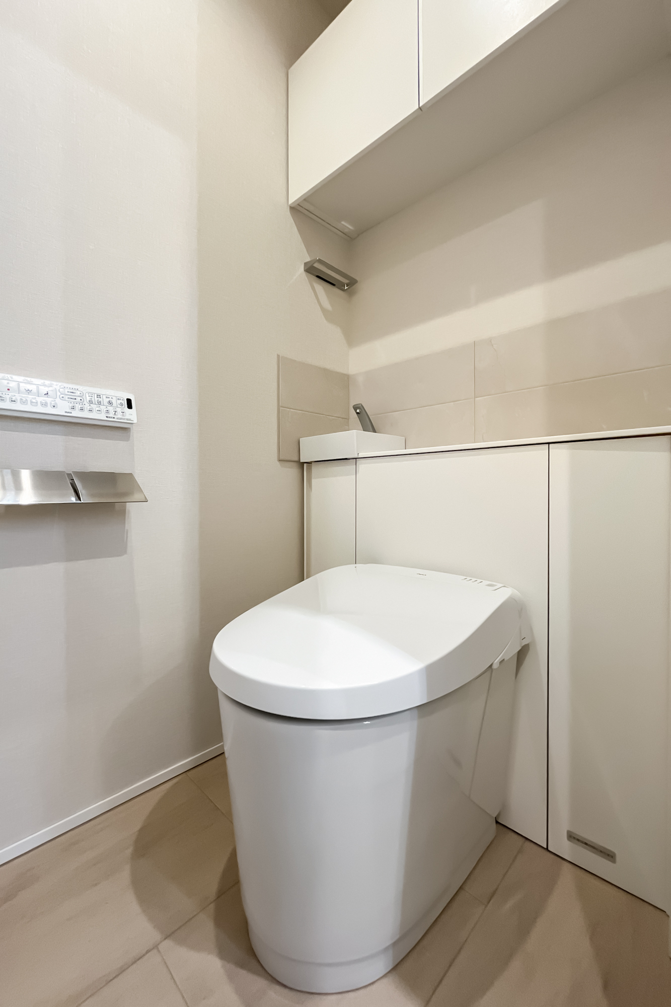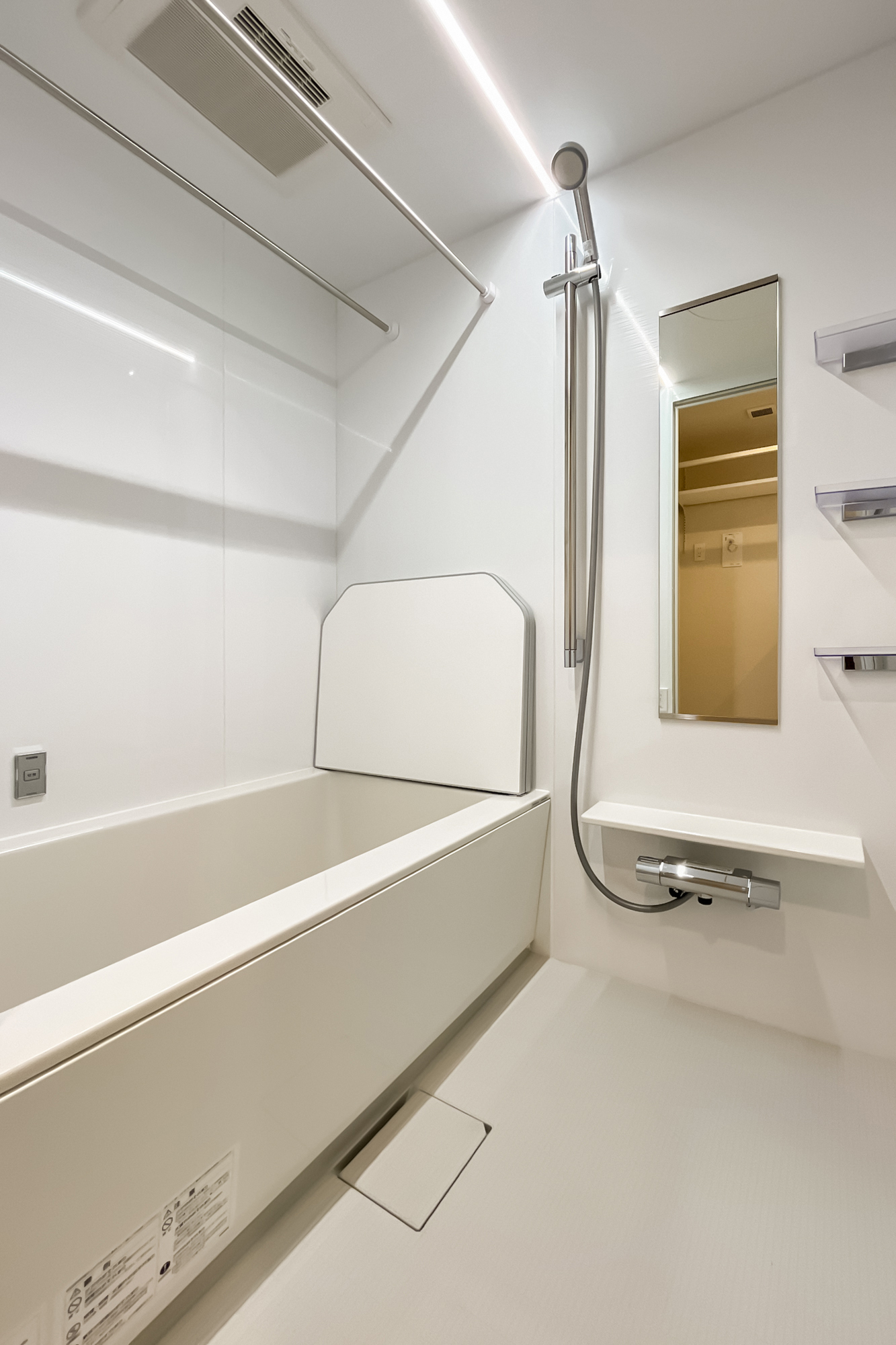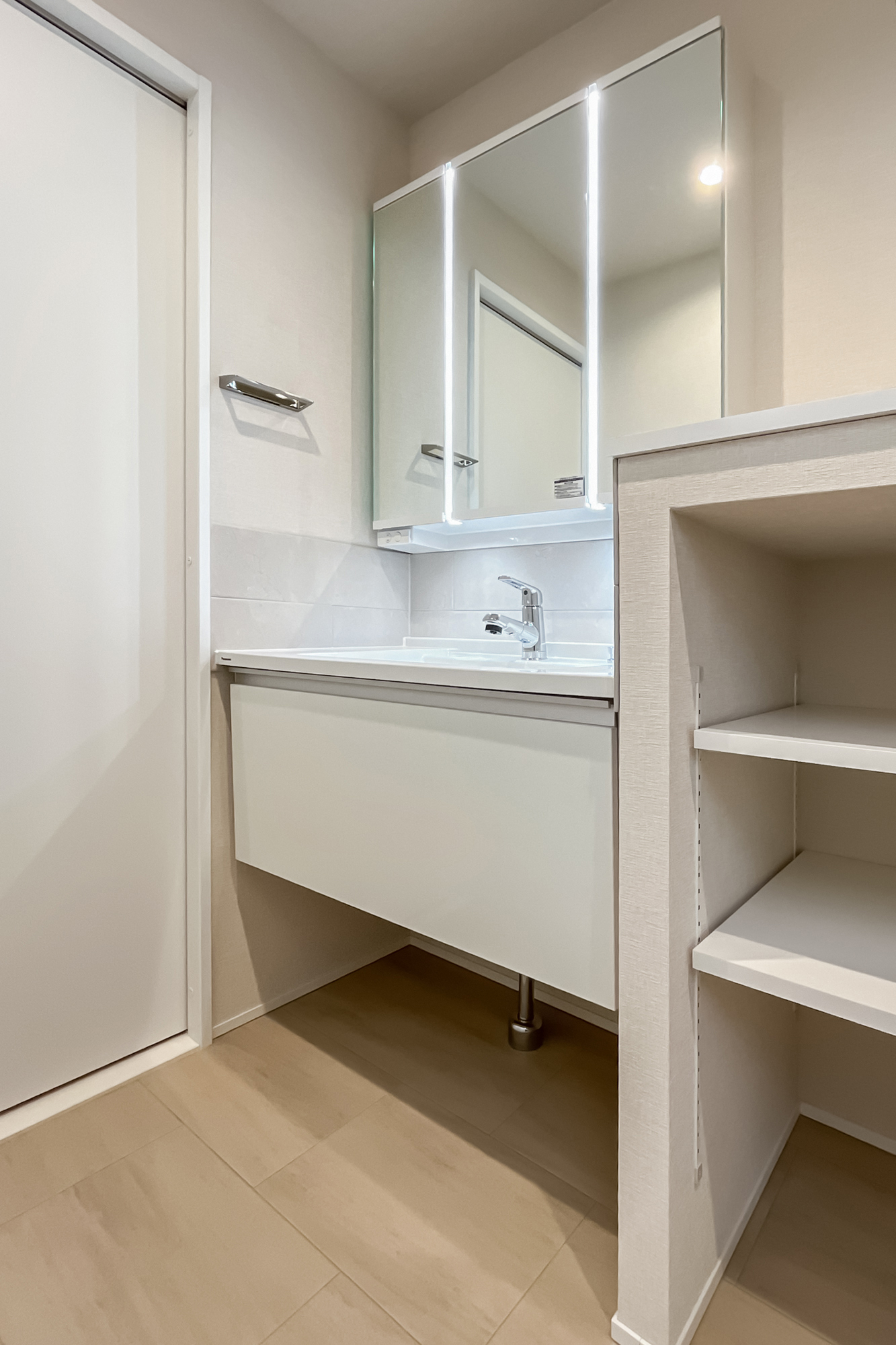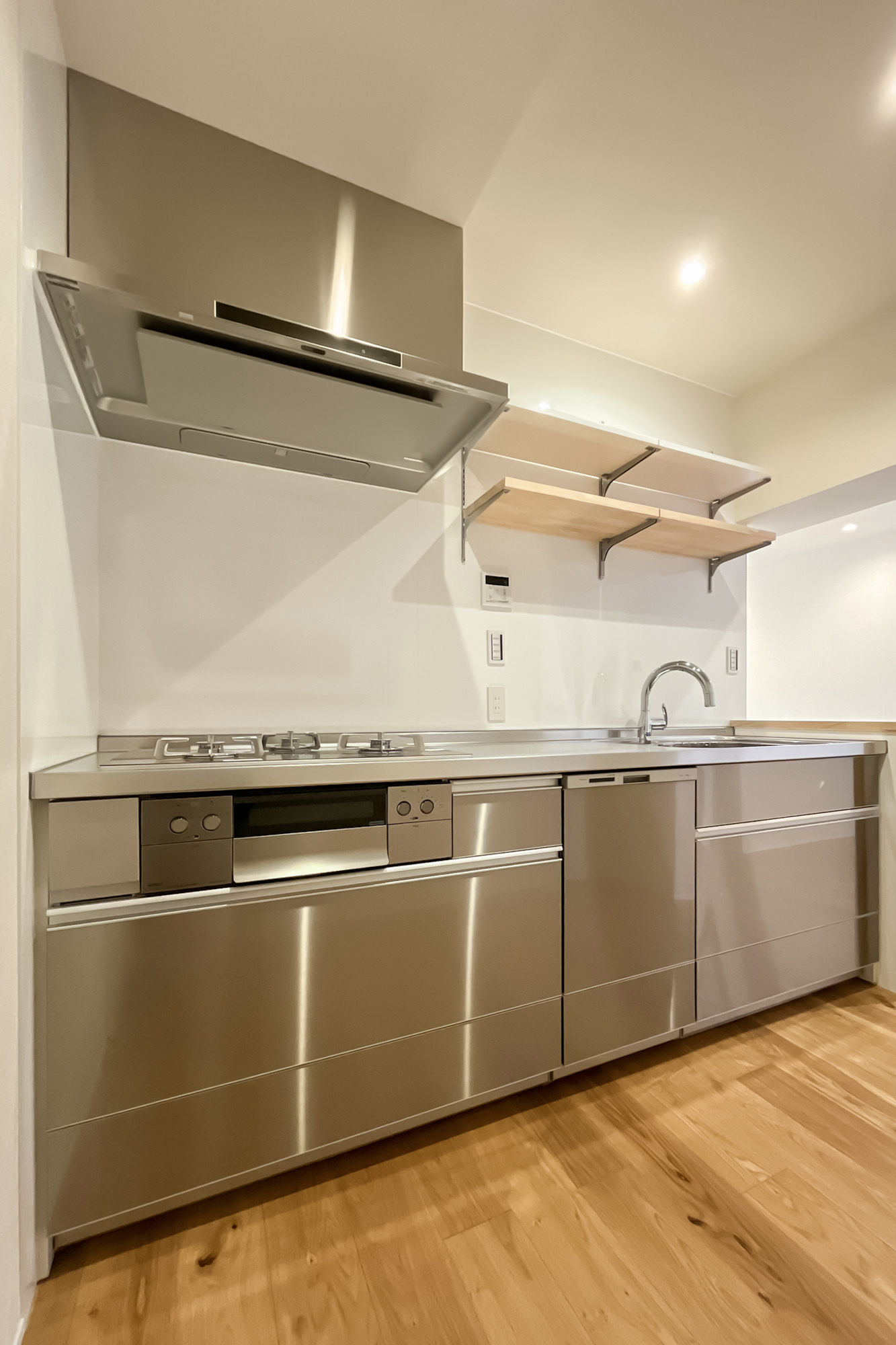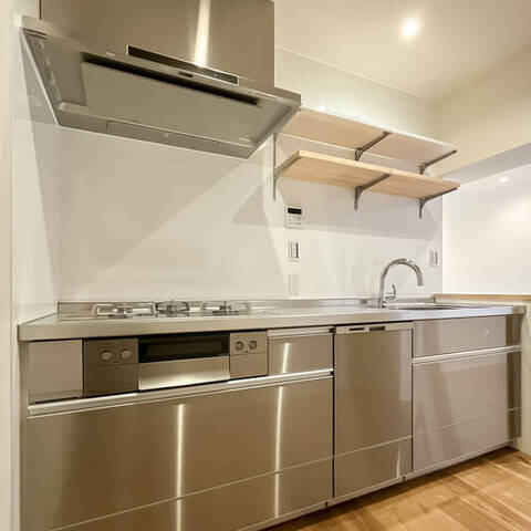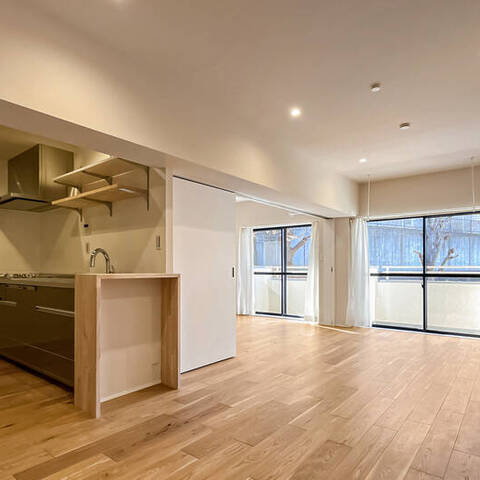リノベーション内容:ステンレスシステムキッチン(ステンレスフード、ガラストップコンロ、浄水器一体型水栓、深型食洗機)/ユニットバス(スゴピカ浴槽、保温浴槽、換気乾燥暖房機、調色フラットラインLED照明)/フロートキャビネット洗面化粧台(収納付3面鏡、ツインラインLED照明、シャワー水栓)/キャビネット付きフルオートシャワートイレ/オーク柄突板フローリング、モルタル土間(玄関)、クッションフロア(洗面室・トイレ)/ビニールクロス(壁・天井)、巾木、エコカラット(洗面室・トイレ・玄関)/ハンドルメッキ鍵付ドア 他