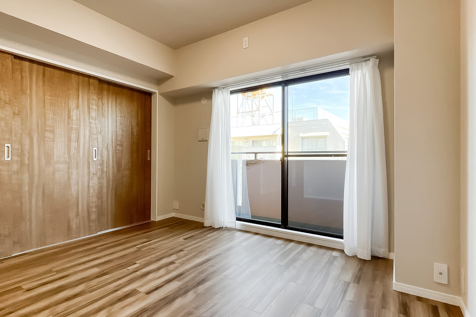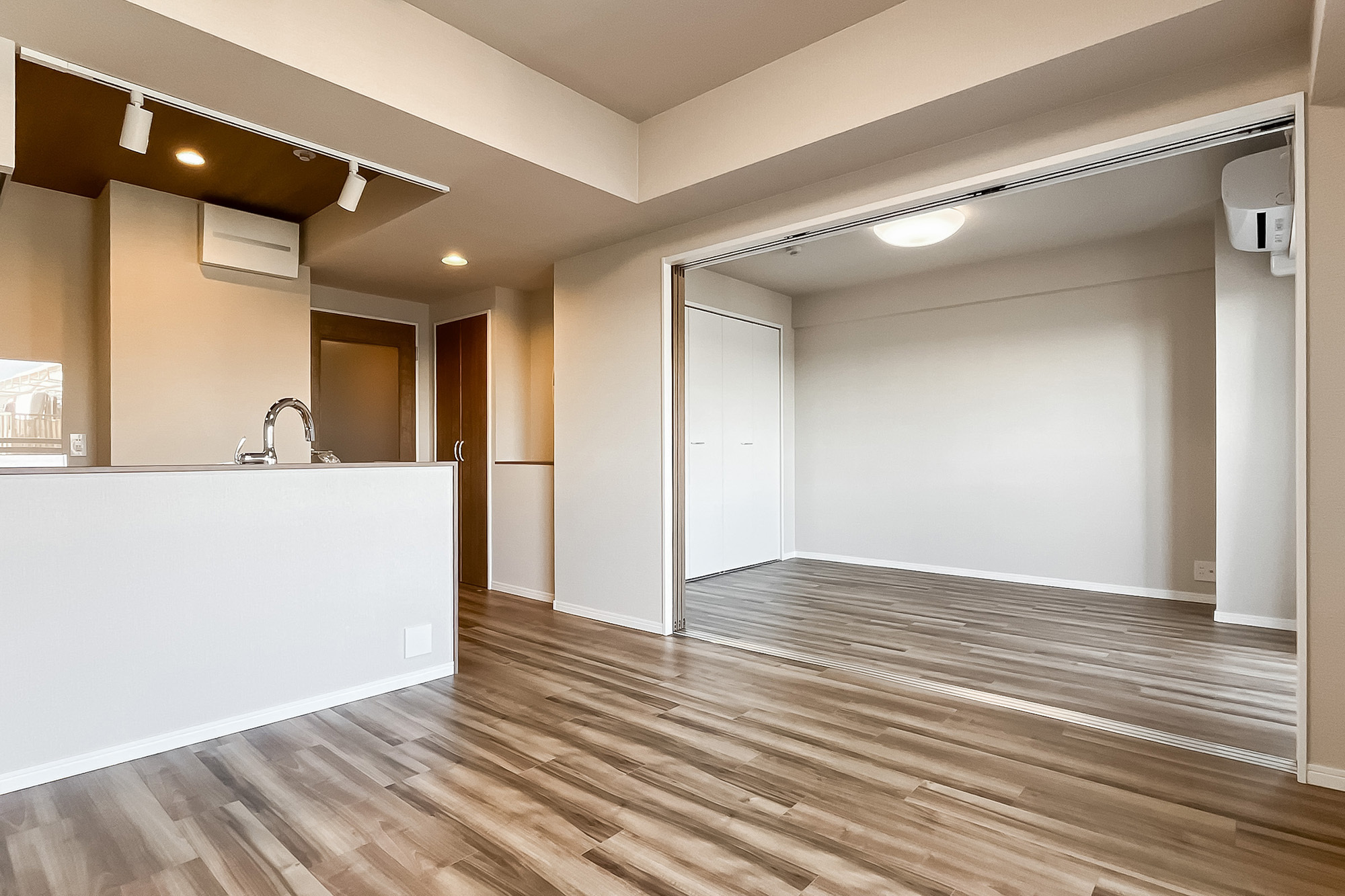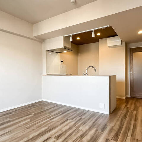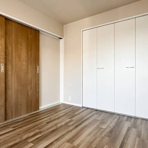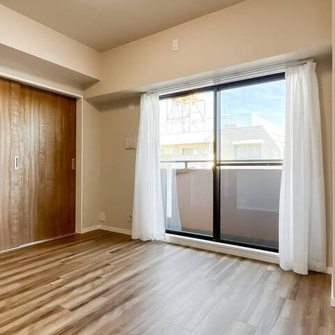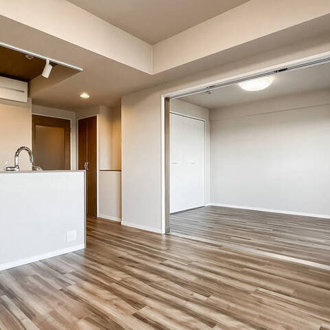 - 5階に所在する住戸。専有面積約55㎡を2LDKにした間取りです。お部屋数が足りていれば、約5.8帖の洋室の引き戸を開放し、1LDKのようにお使いいただくのもおすすめです。