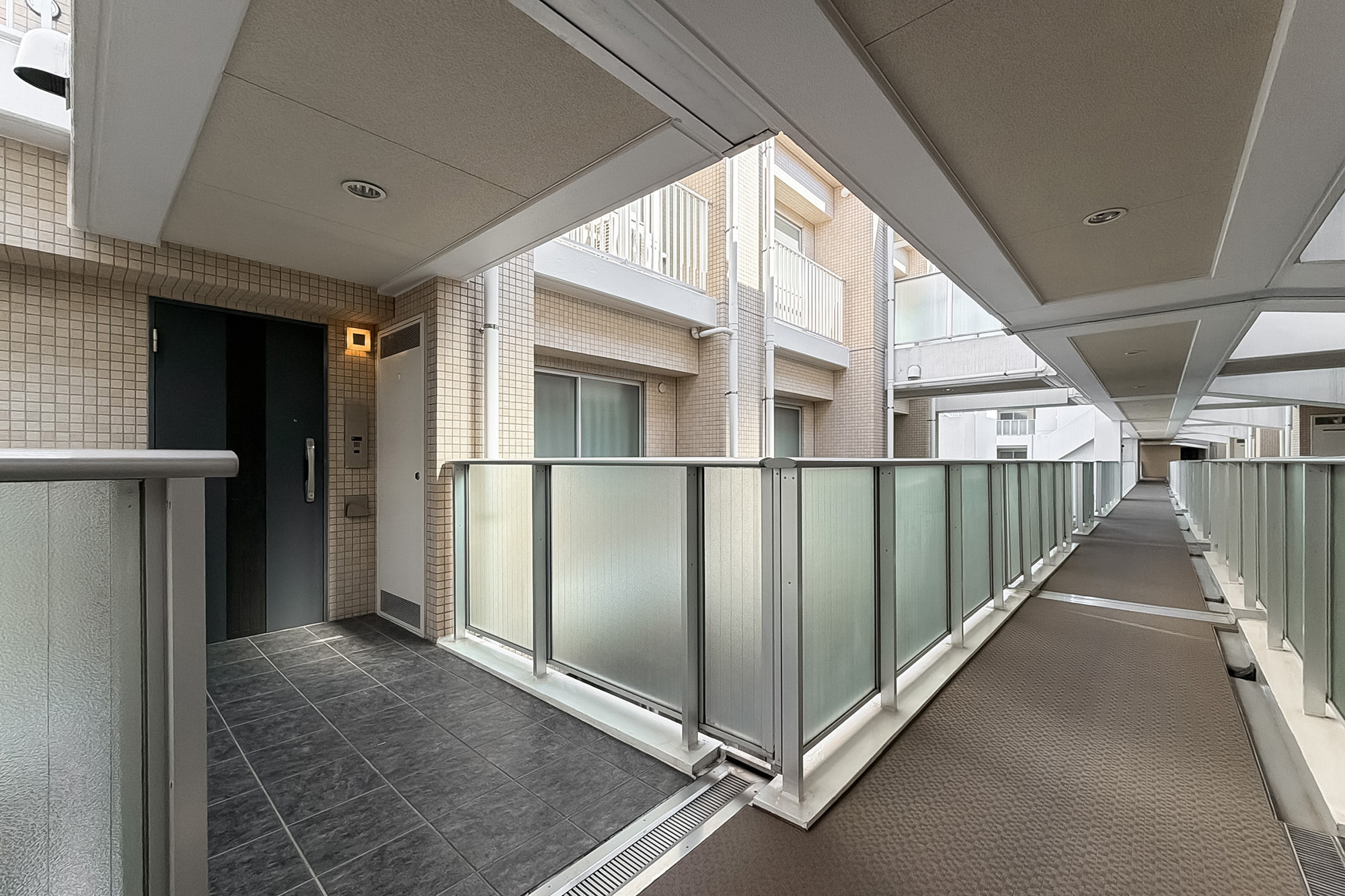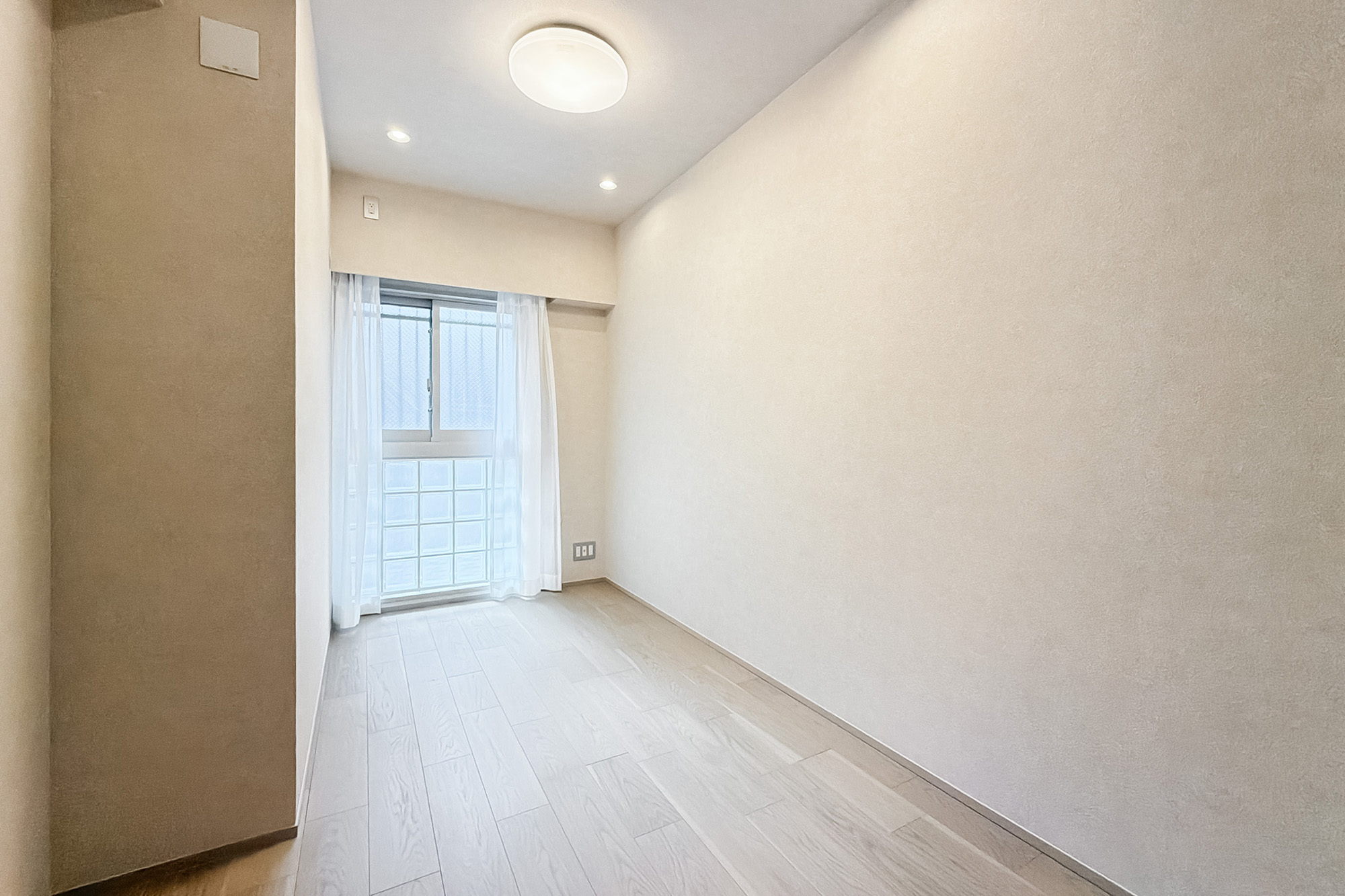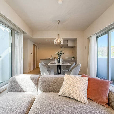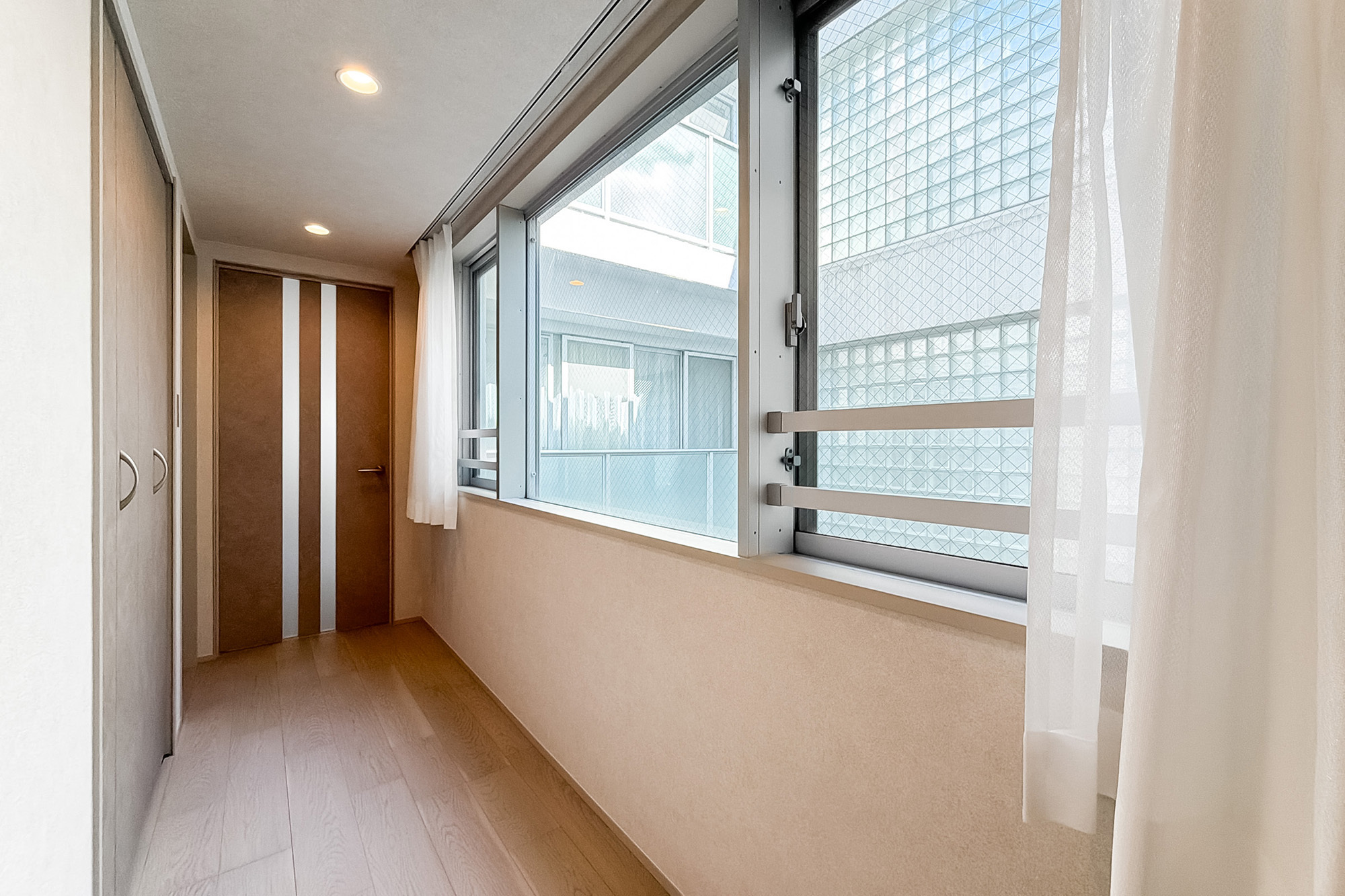 - 住戸は5階に所在します。専有面積約72㎡を2LDKにした間取りで、LDKと約7帖の洋室、廊下がライトコートに面した少し変わったつくり。窓がたっぷりとあるのがうれしいですね。