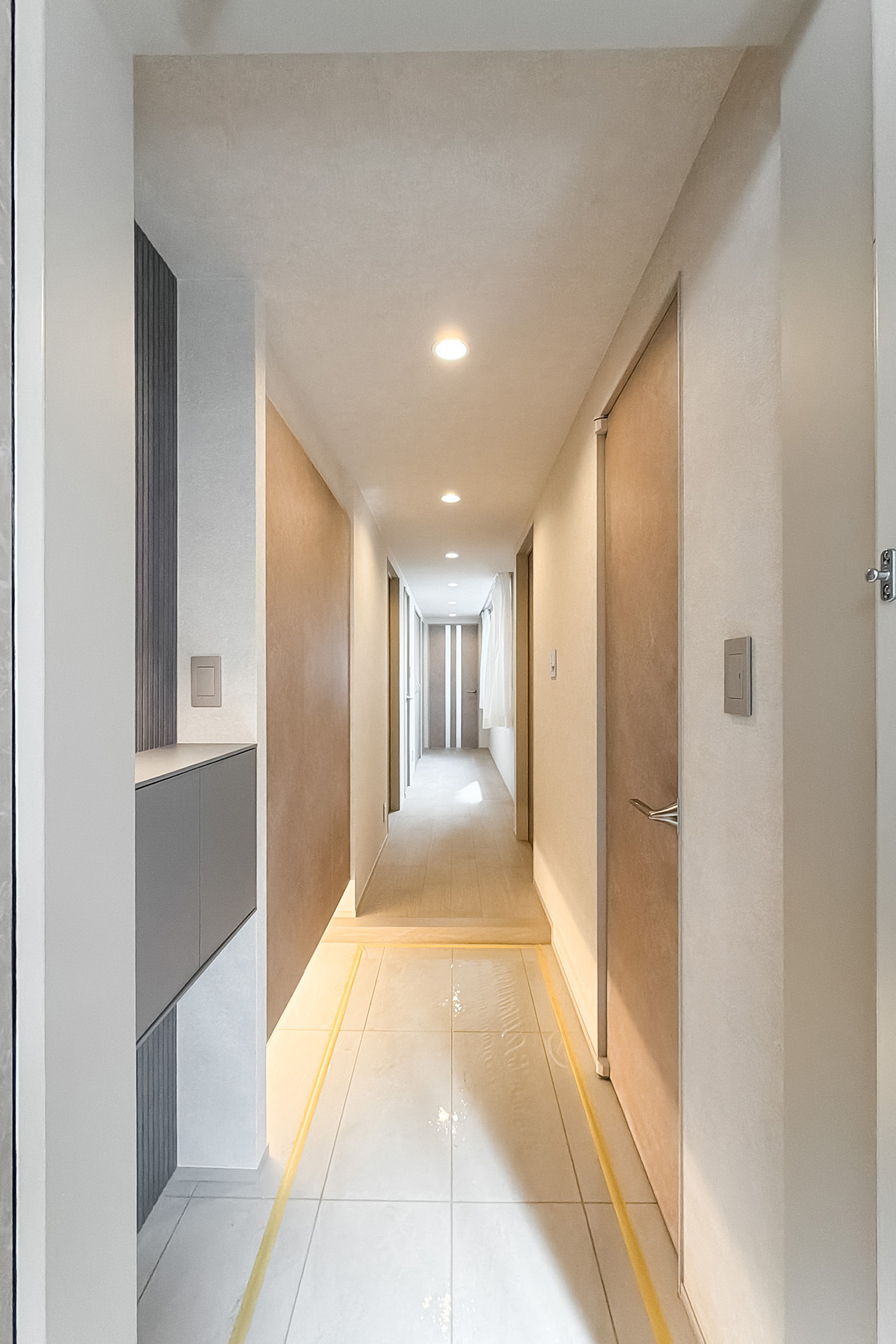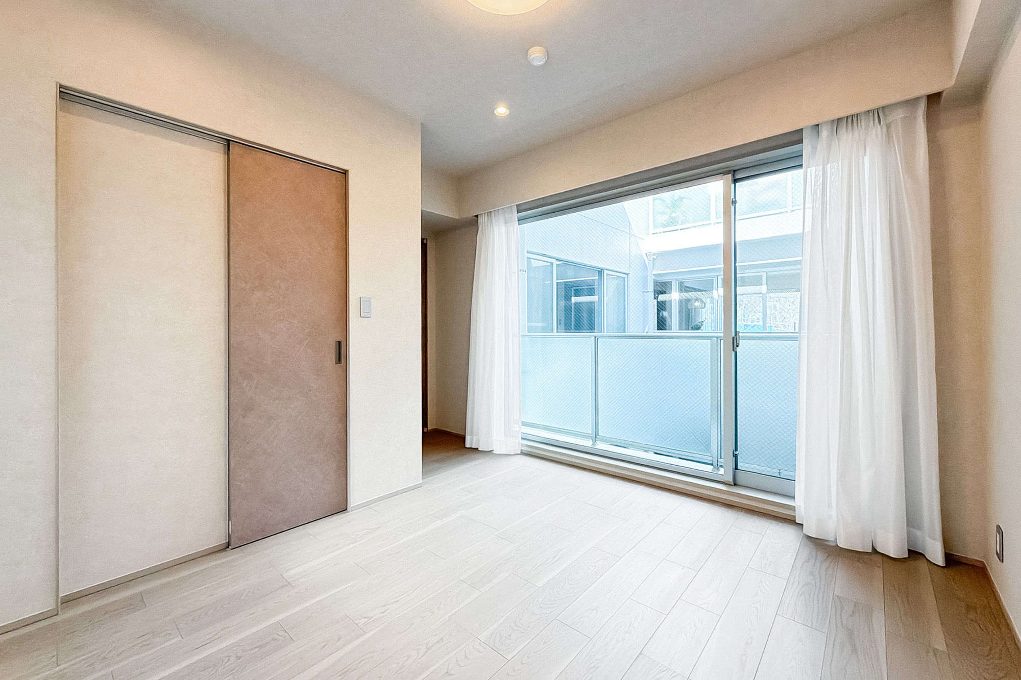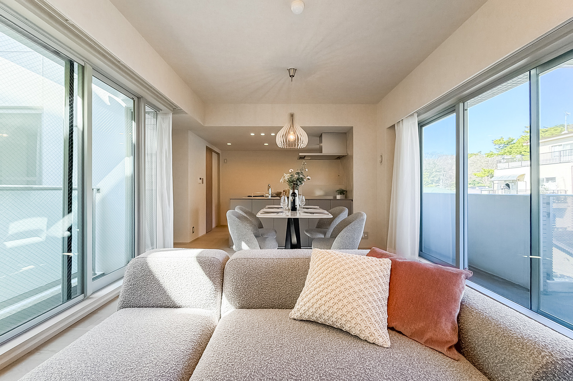 - 住戸は5階に所在します。専有面積約72㎡を2LDKにした間取りで、LDKと約7帖の洋室、廊下がライトコートに面した少し変わったつくり。窓がたっぷりとあるのがうれしいですね。