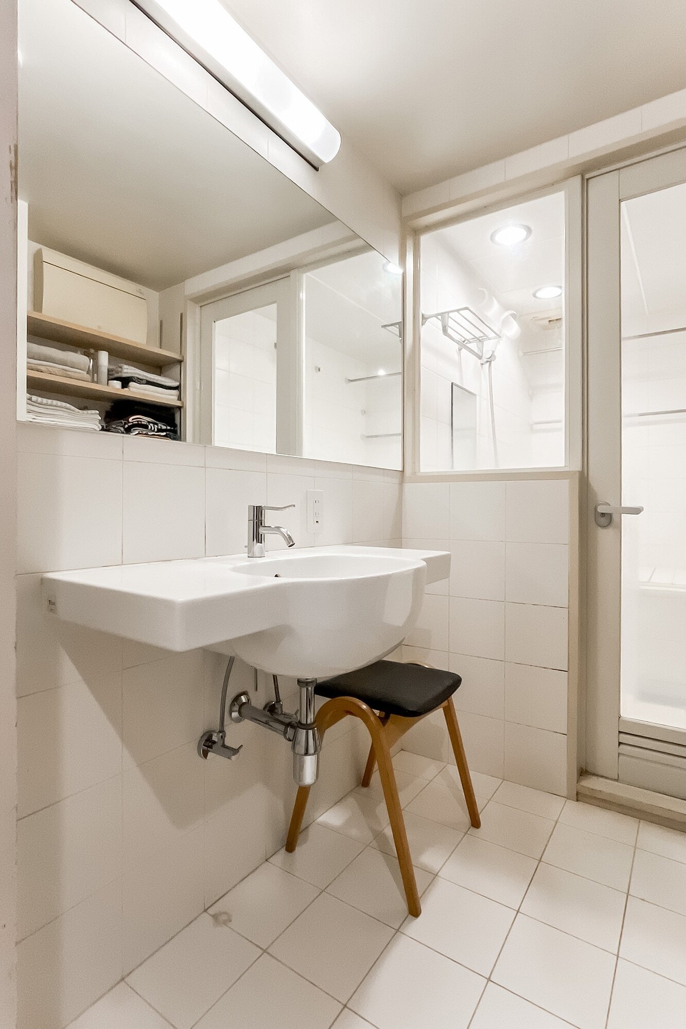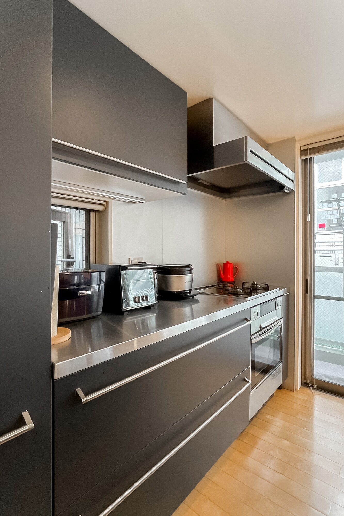 - 水まわりにもご注目を。システムキッチンはイタリア・varenna(バレンナ)製。シックなグレートーンのII型で、家電を置いたり調理したりするスペースもたっぷり。また、洗面室・浴室は白いタイルと素敵な装いです。