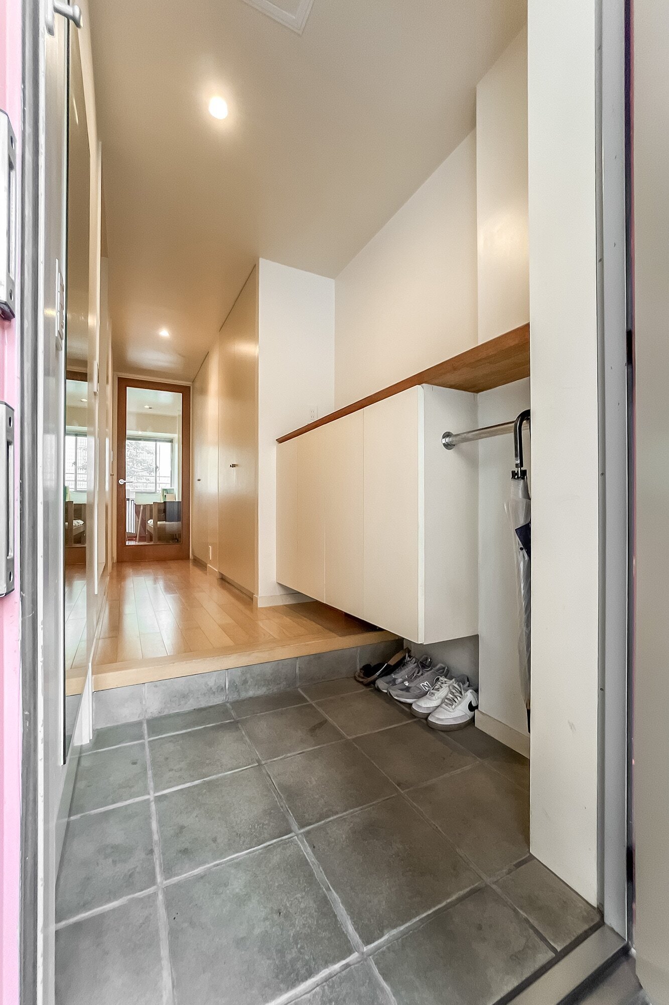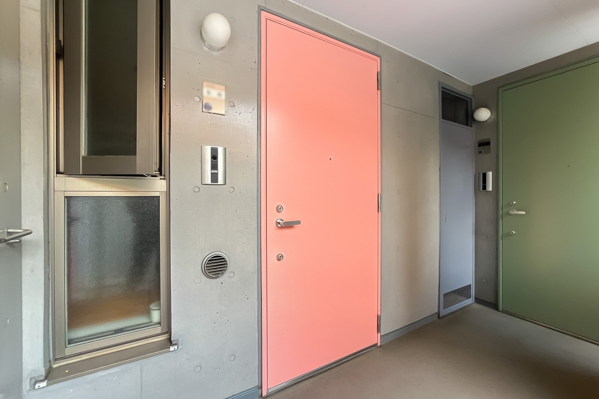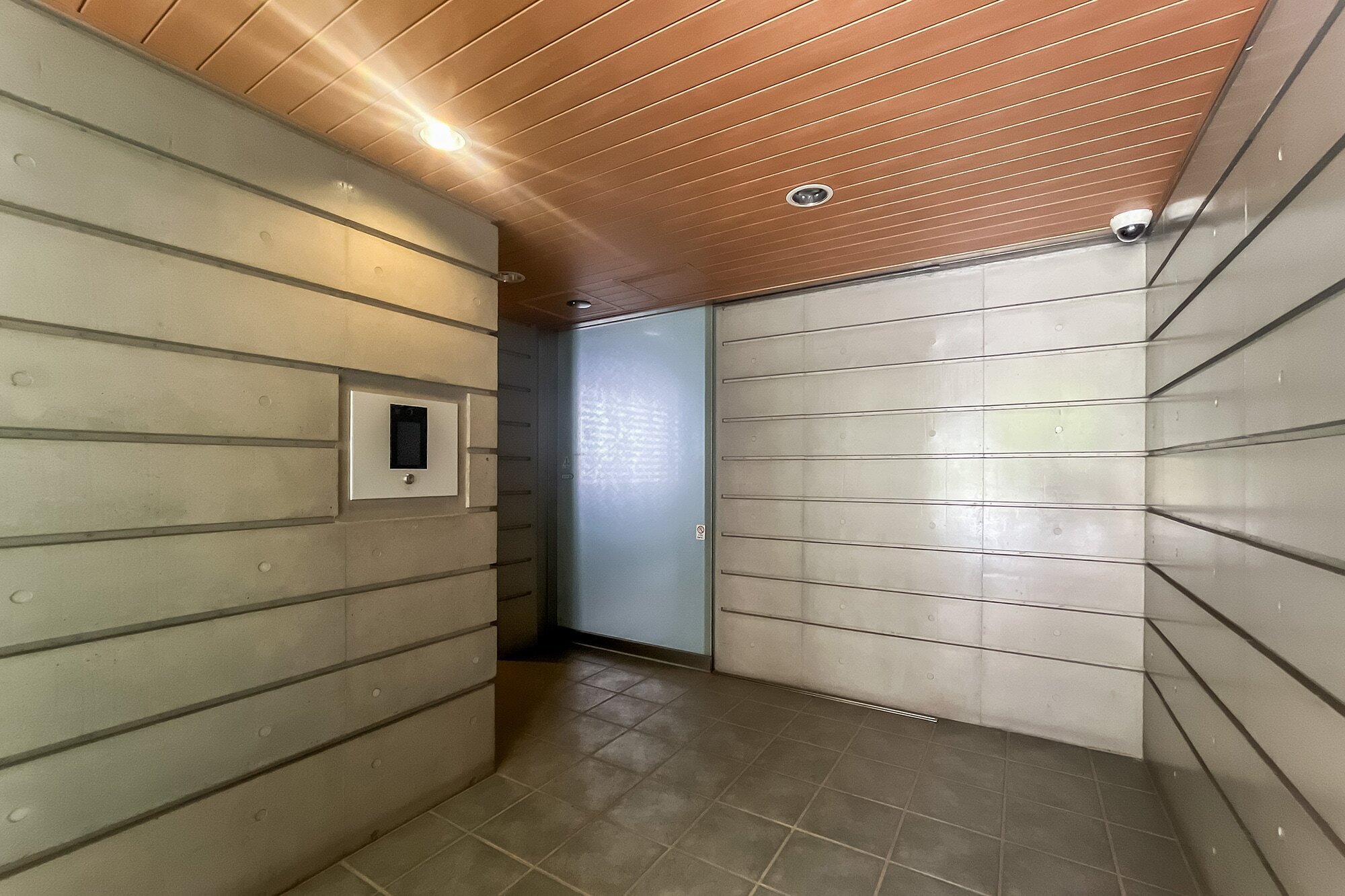 - 物件は2003年竣工のコーポラティブハウス。コンクリートを使ったスタイリッシュな印象のエントランスまわりで、共用部にはオートロック・宅配ボックスを備えています。