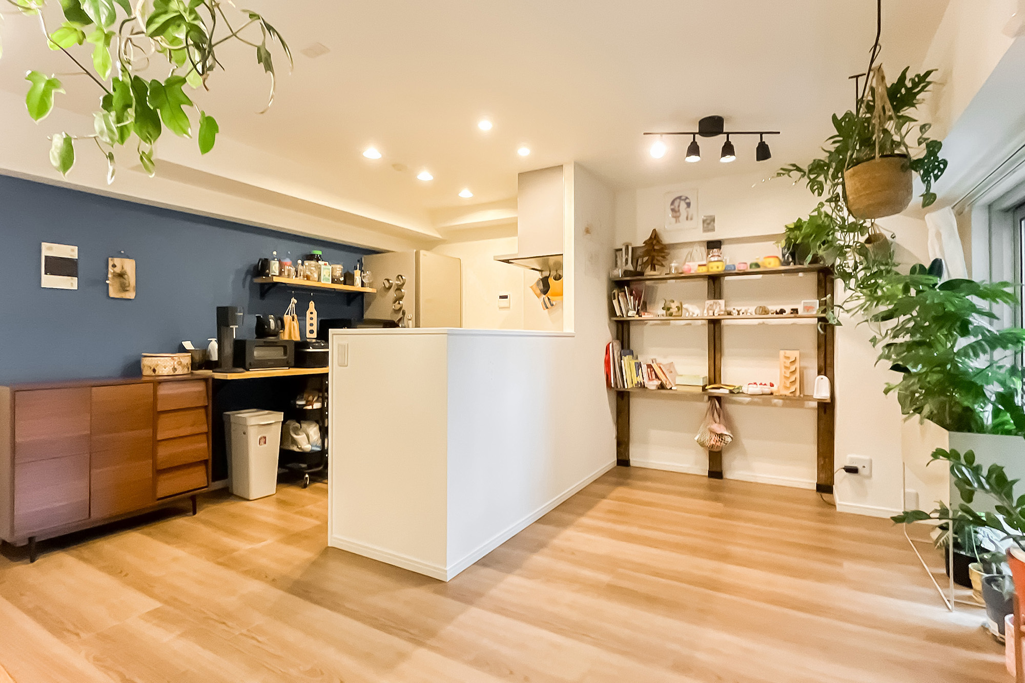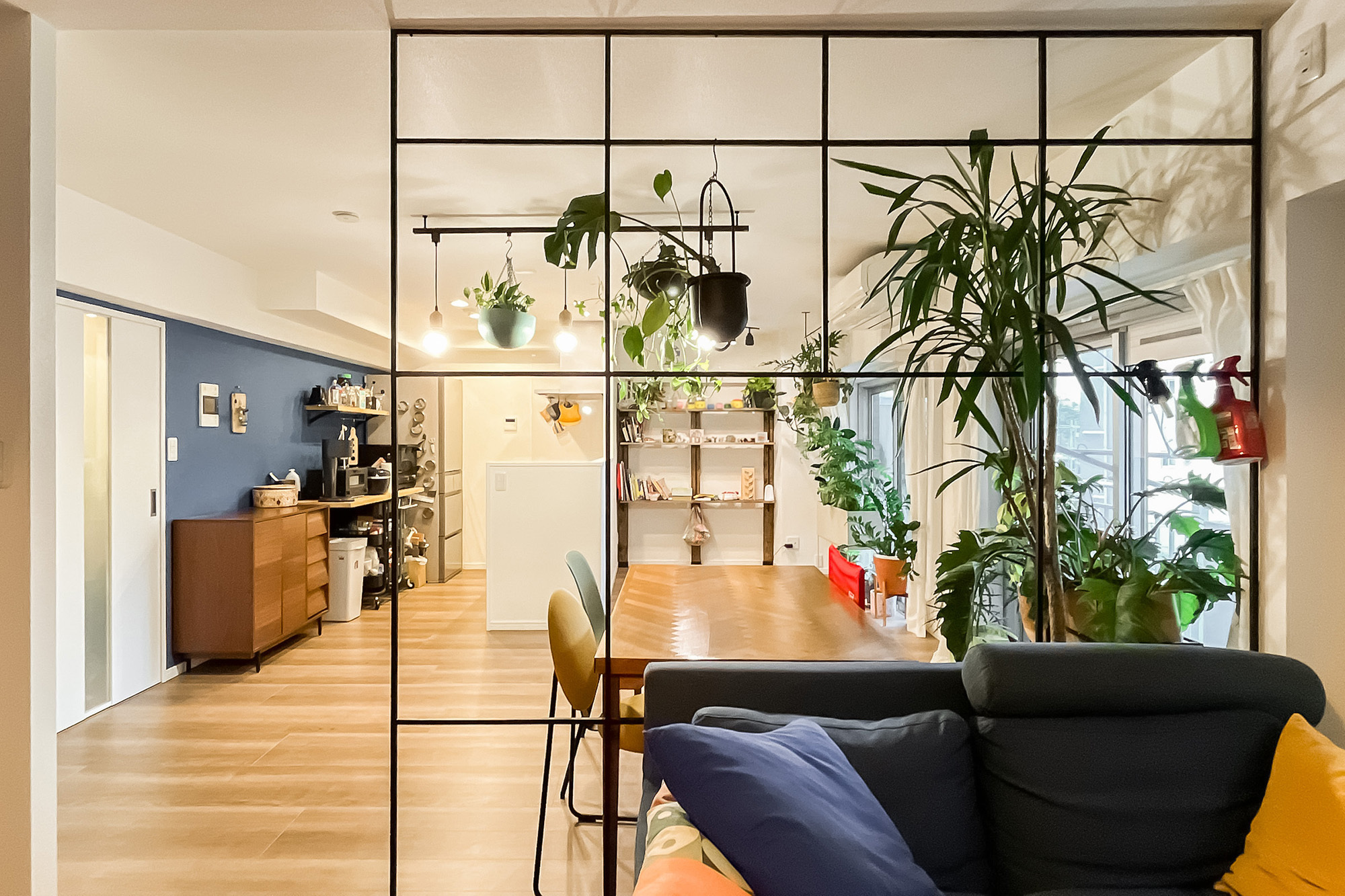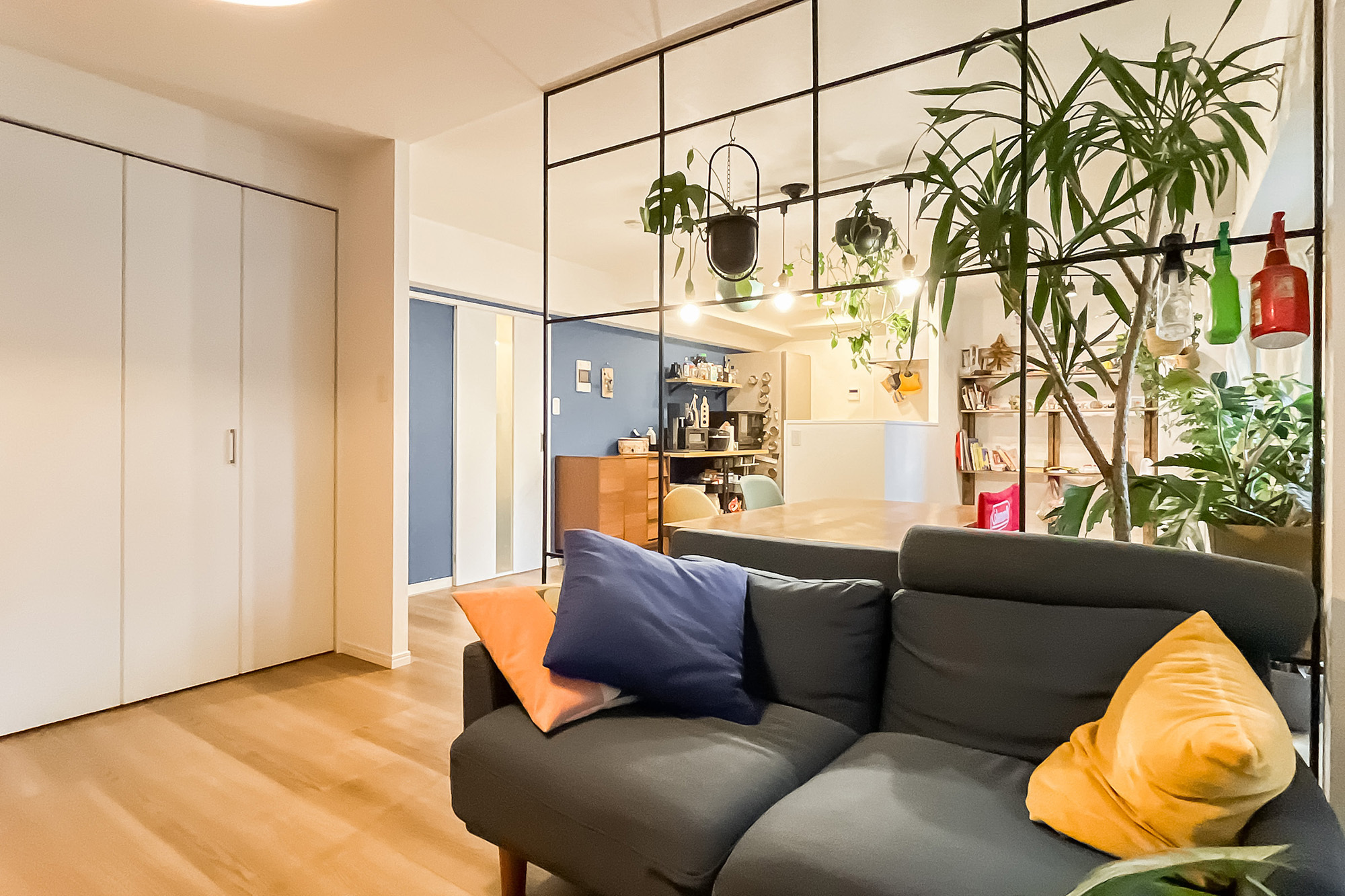 - 専有面積約60㎡を1LDKにした間取り。各居室窓があるのはうれしいポイントです。内装は、LDKのブルーのクロスや格子の仕切りが特徴的。窓際天井にバーもあり、植物を吊るして飾ったりするのも◎
