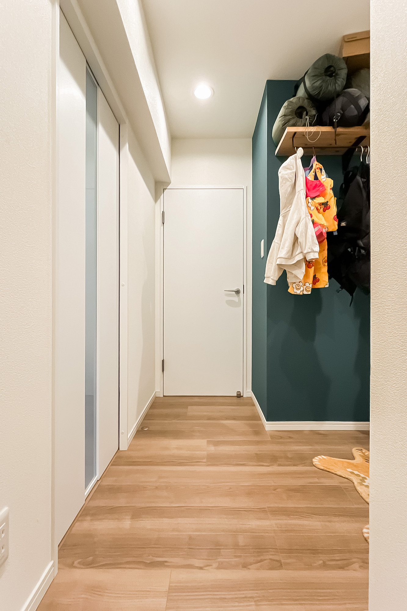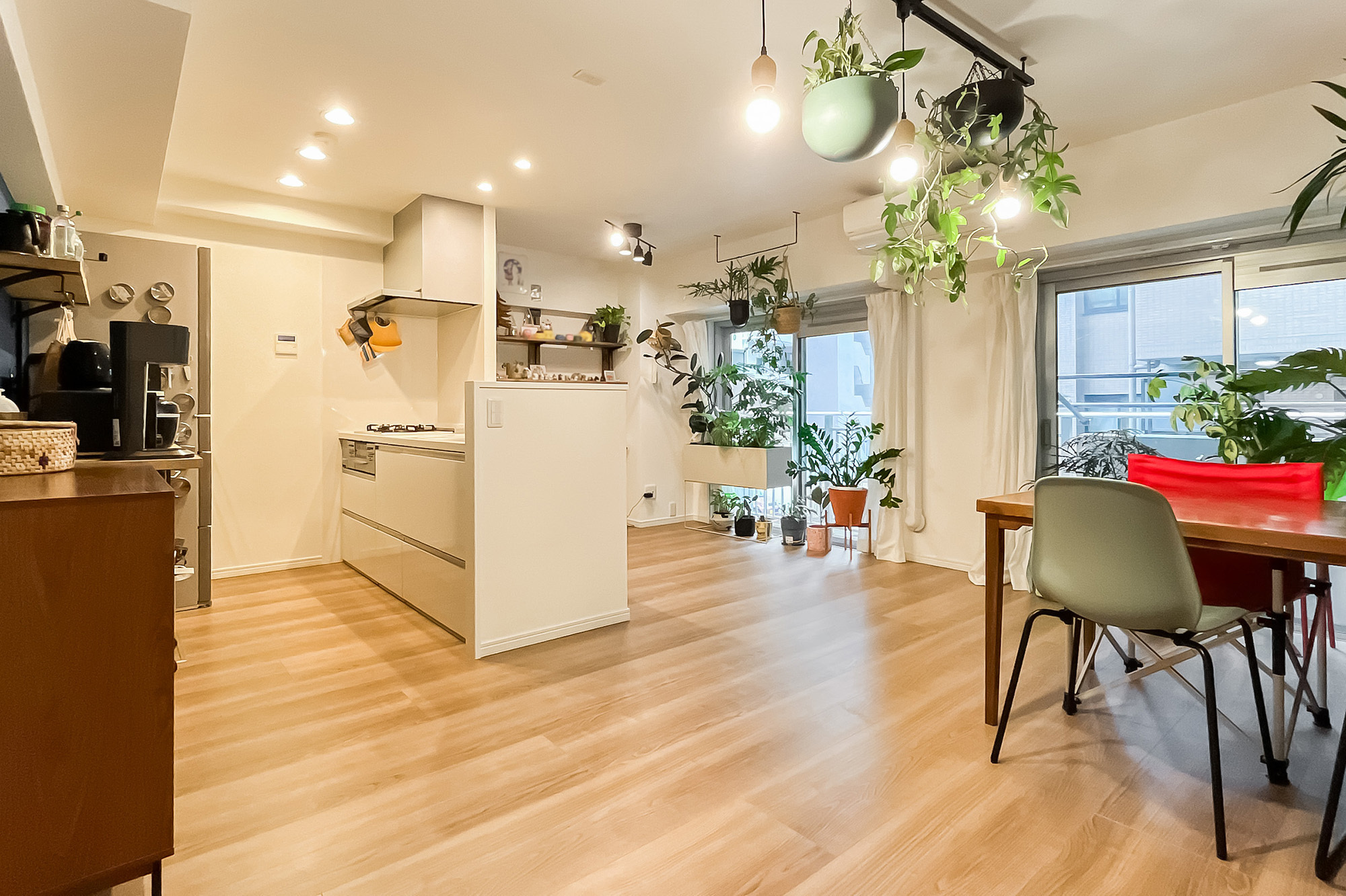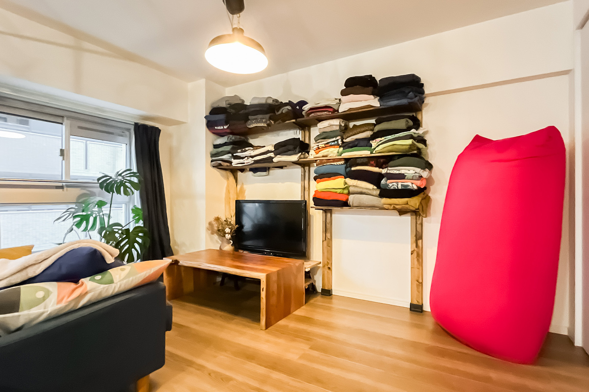 - 専有面積約60㎡を1LDKにした間取り。各居室窓があるのはうれしいポイントです。内装は、LDKのブルーのクロスや格子の仕切りが特徴的。窓際天井にバーもあり、植物を吊るして飾ったりするのも◎