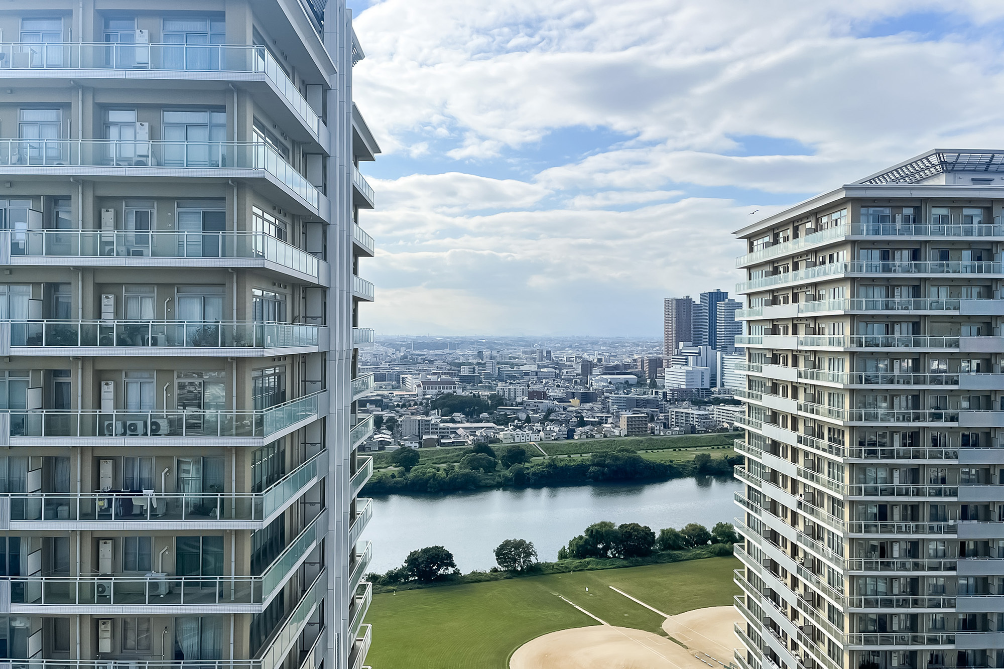 - 東急多摩川線「下丸子」駅より徒歩8分。多摩川のすぐそば、広々とした敷地に建つタワーマンションです。