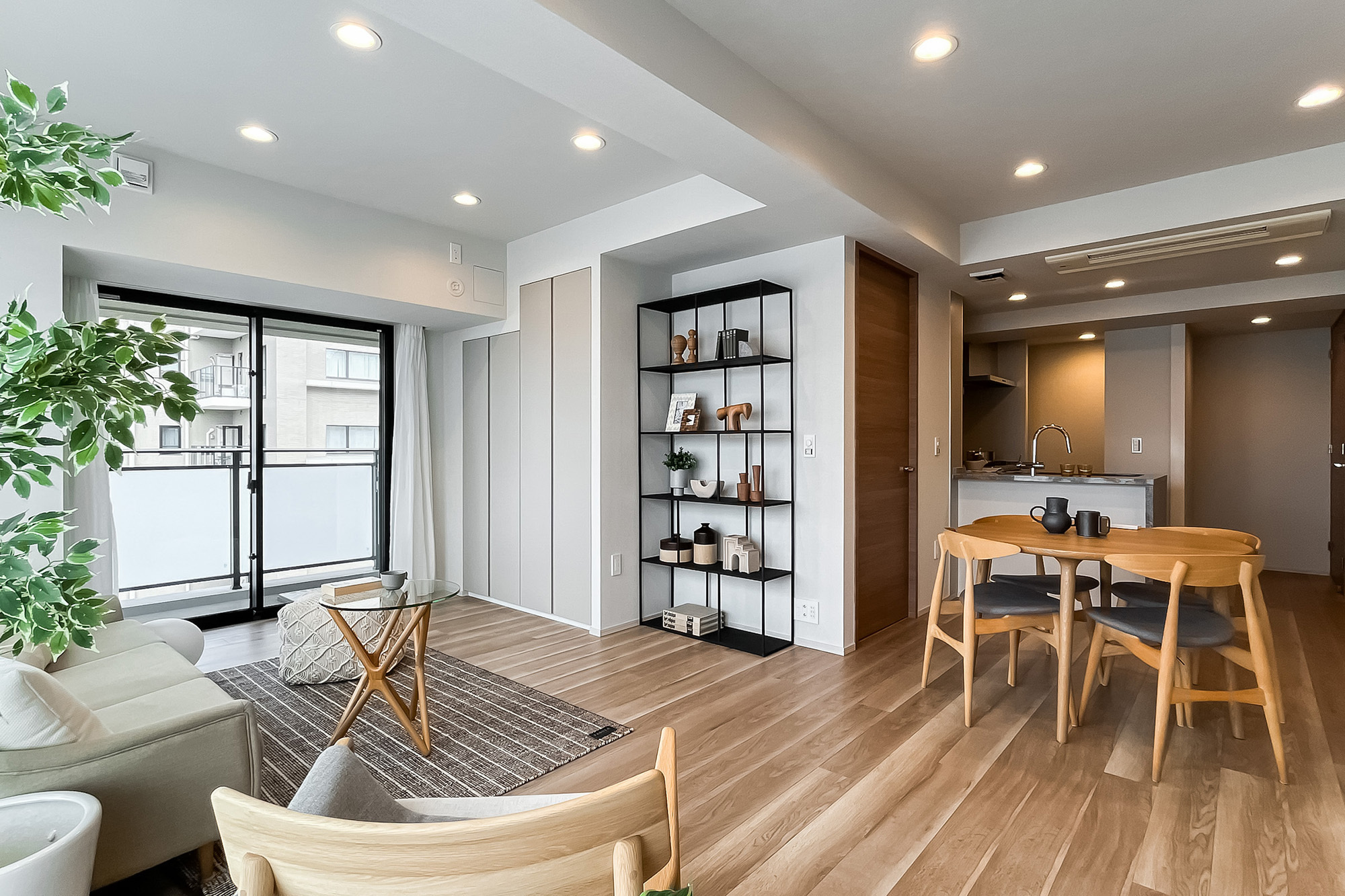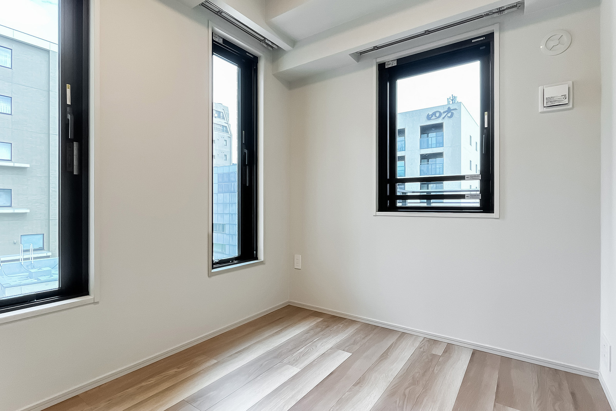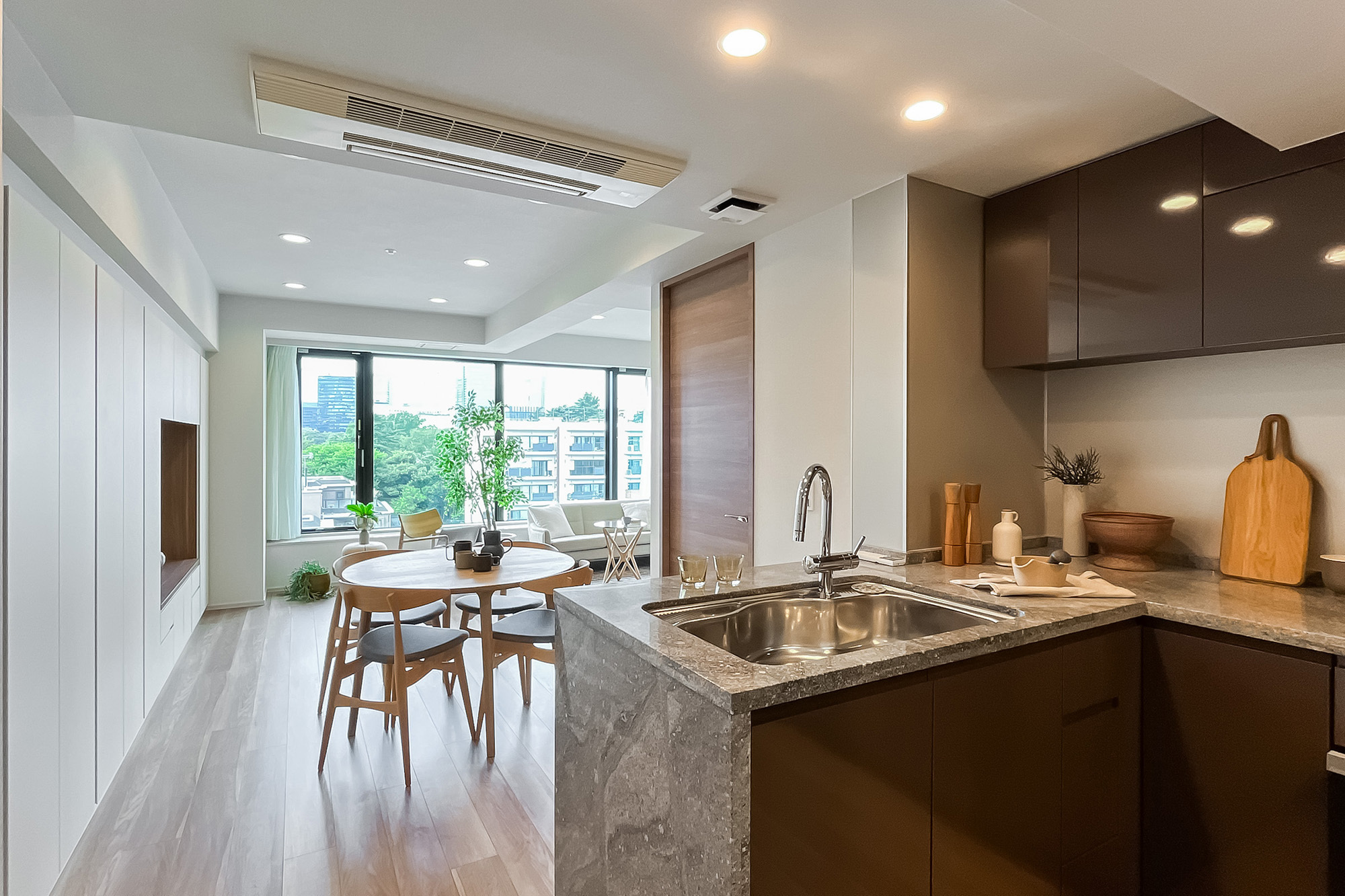 - 住戸の所在階は7階。三方角部屋で窓が多く、風通しがよさそうです。LDK西側の窓からは空を大きく仰げ、「新宿御苑」のグリーンを望みます。専有面積約79㎡を2LDKにした間取り。LDKは約19.4帖の広さがあり、一面に収納が設けられているのもうれしいポイントです。