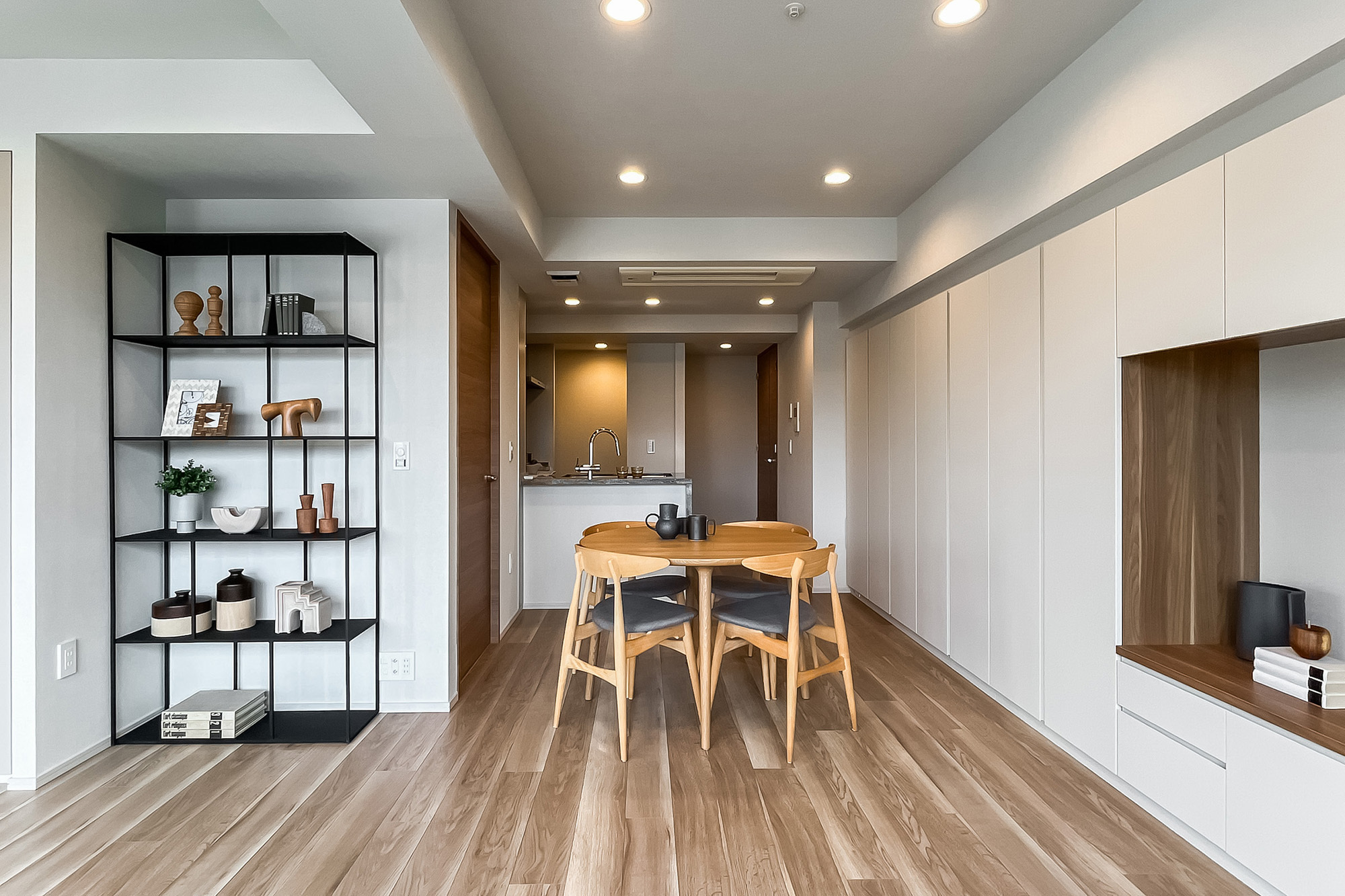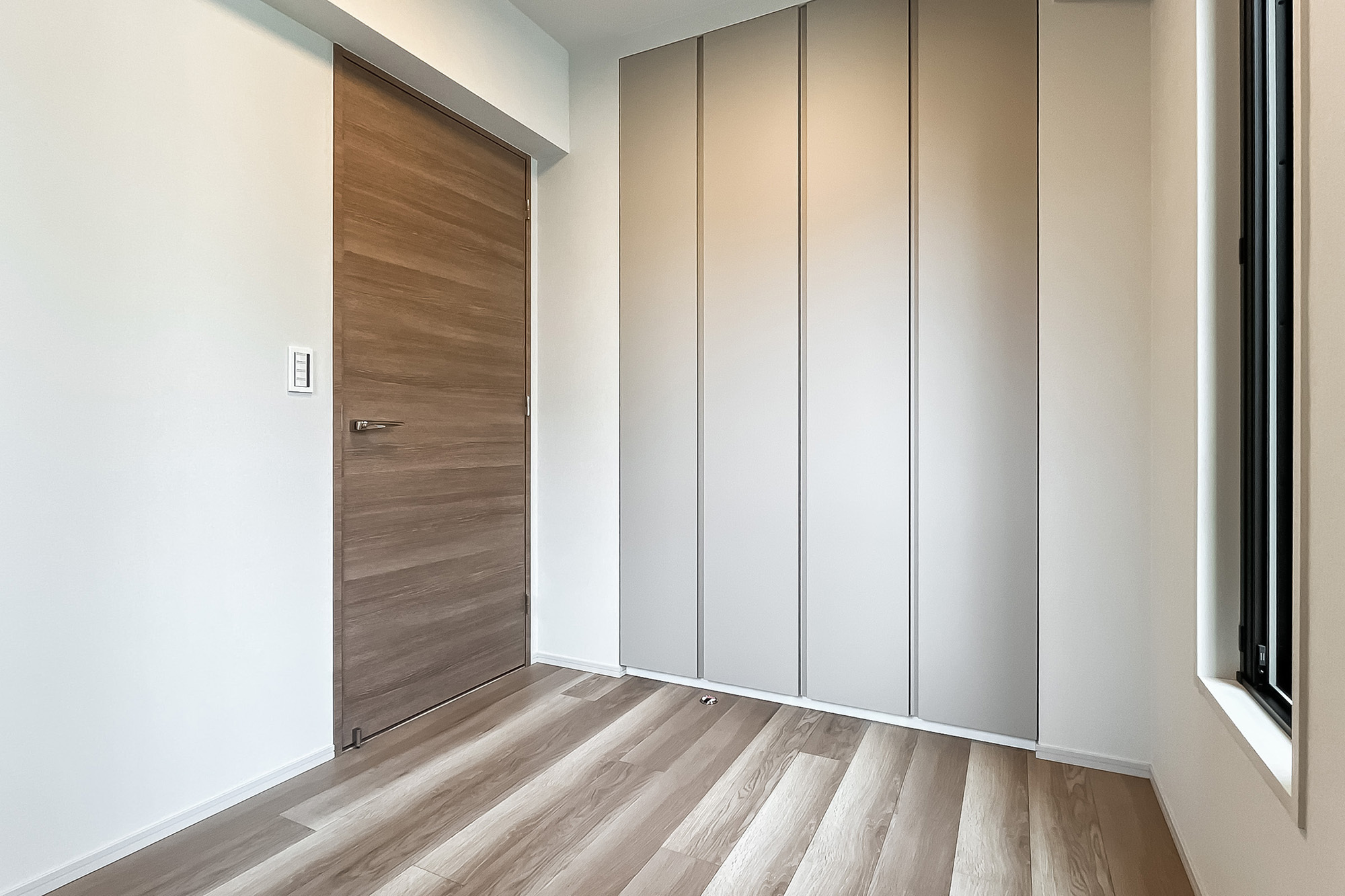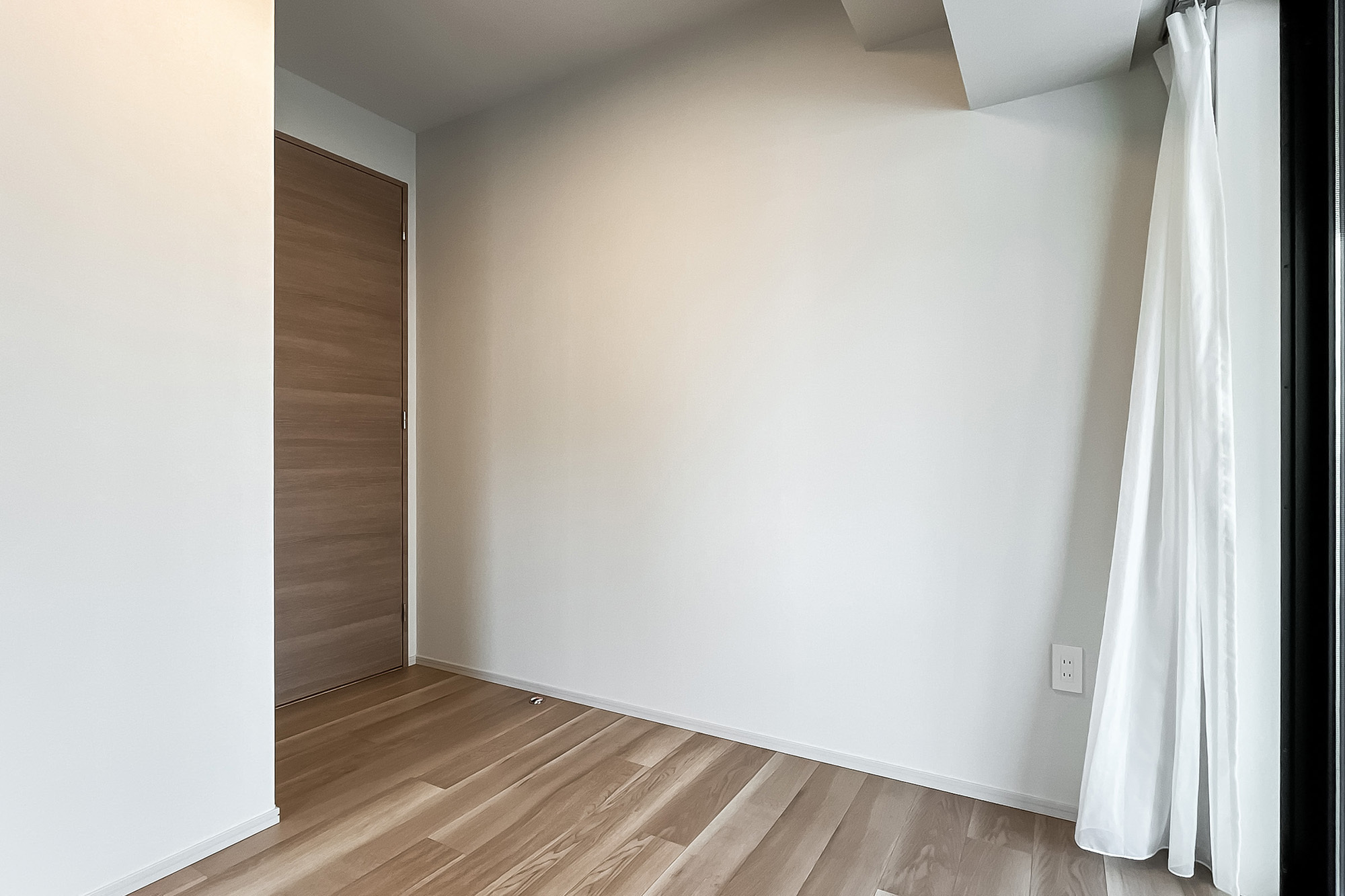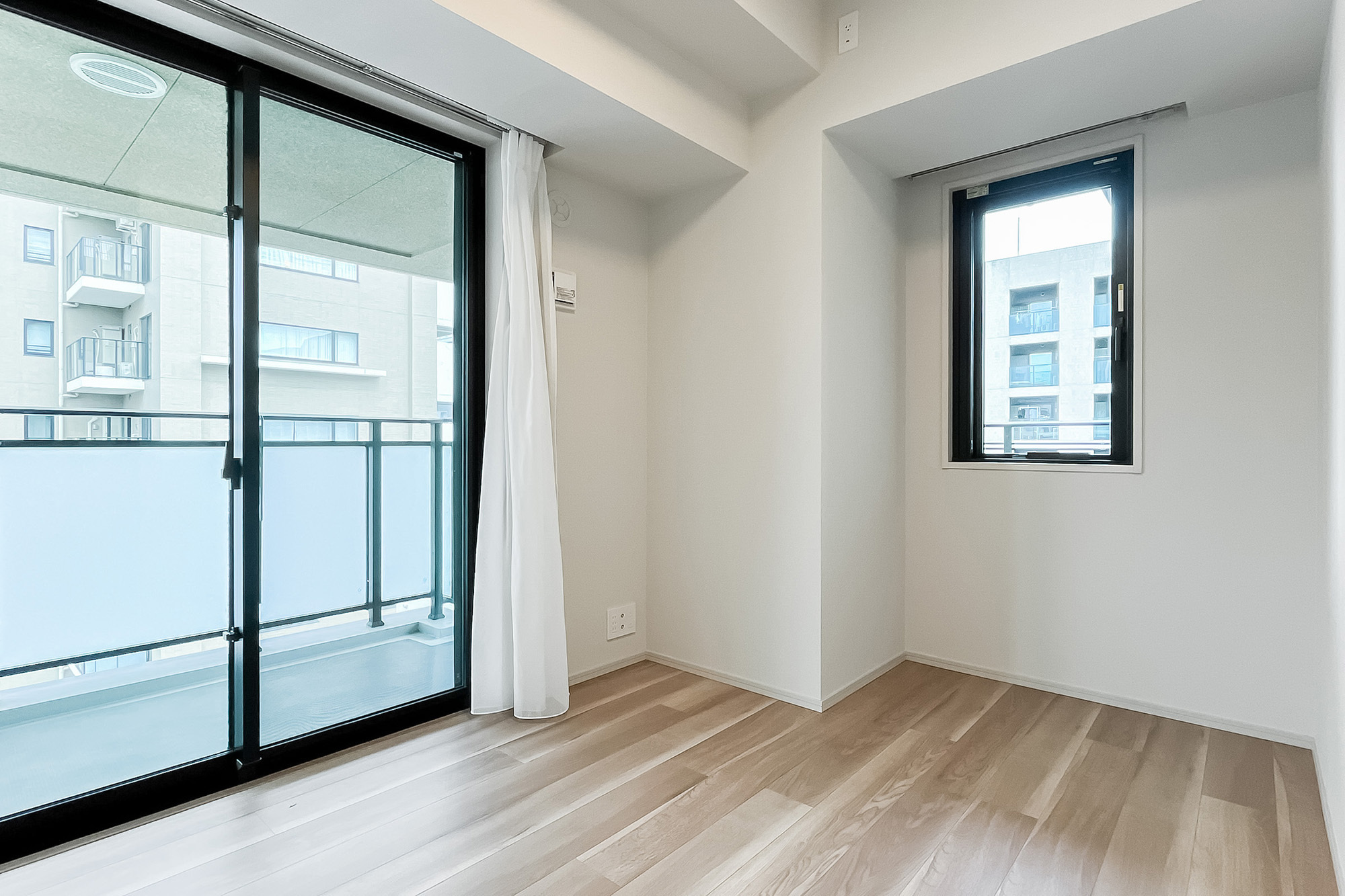 - 住戸の所在階は7階。三方角部屋で窓が多く、風通しがよさそうです。LDK西側の窓からは空を大きく仰げ、「新宿御苑」のグリーンを望みます。専有面積約79㎡を2LDKにした間取り。LDKは約19.4帖の広さがあり、一面に収納が設けられているのもうれしいポイントです。