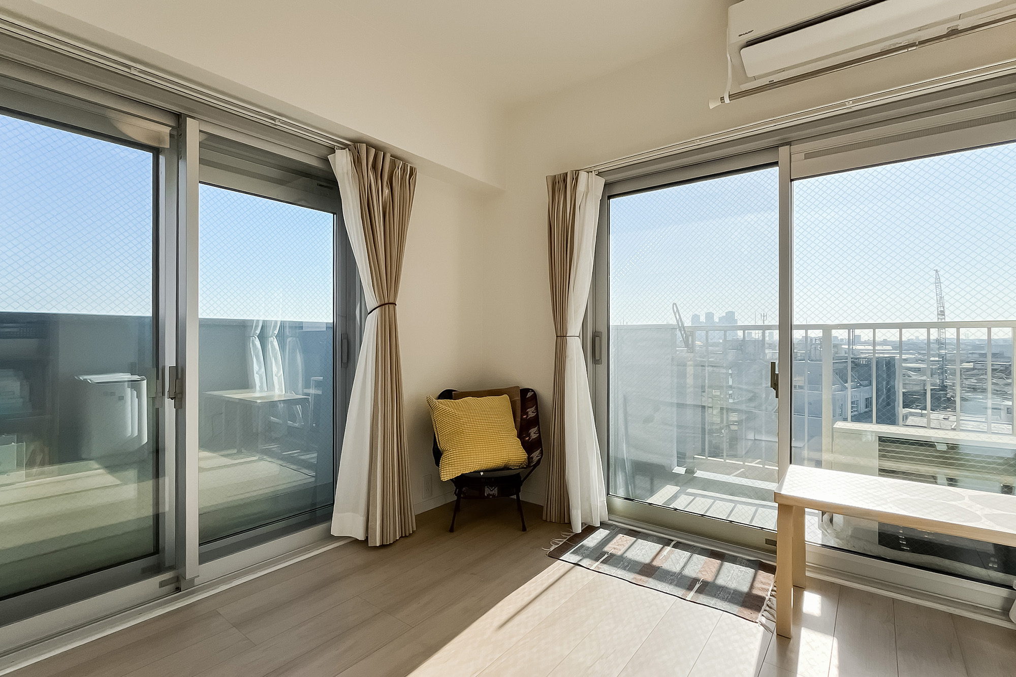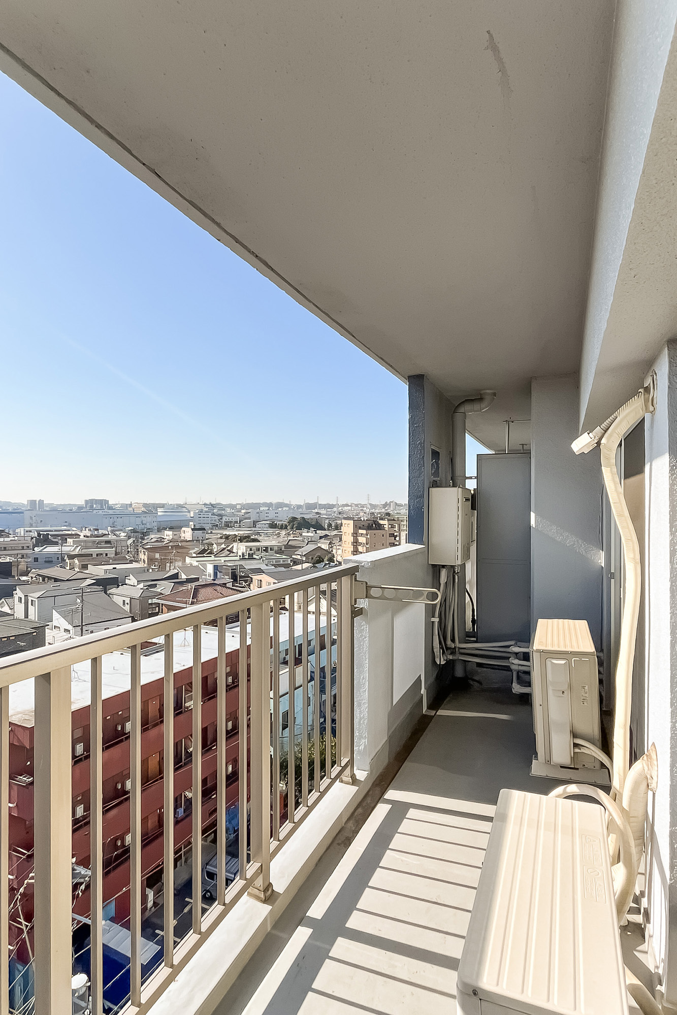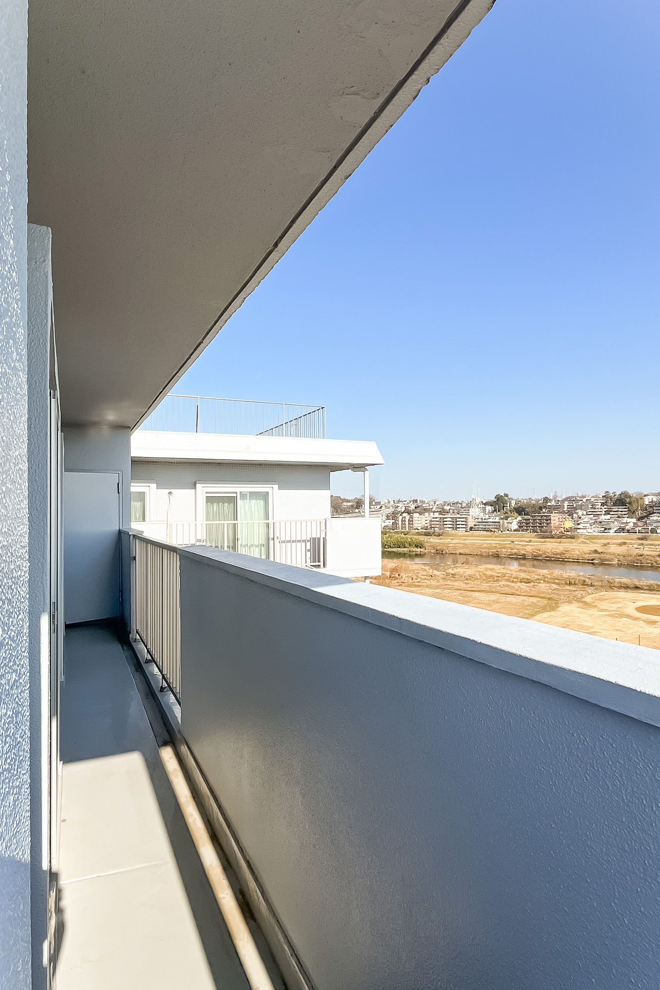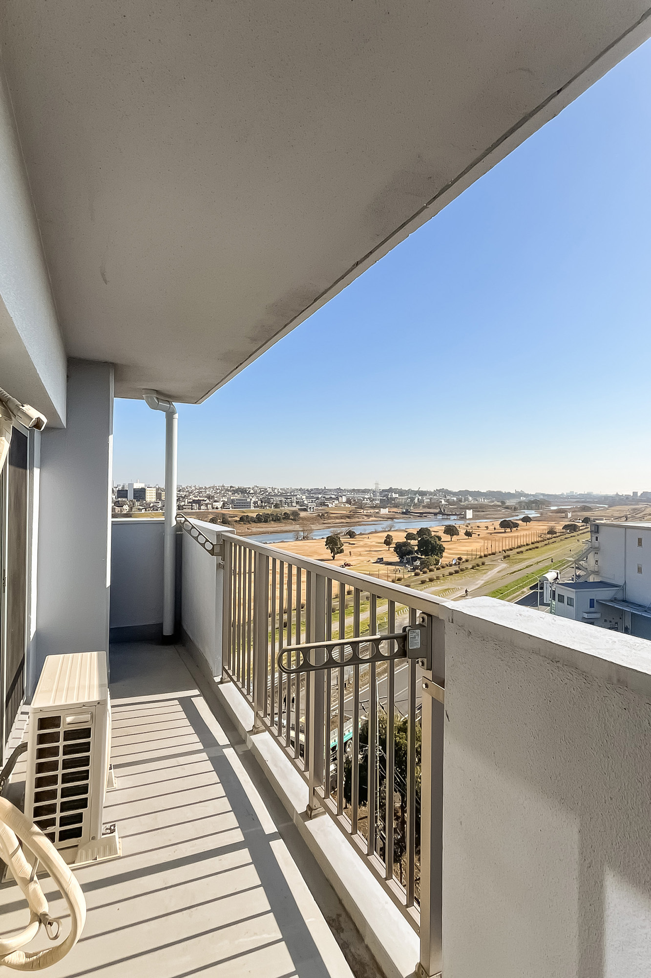 - 南東の角住戸のため日当たりが良好! バルコニーは南側のふたつの洋室〜東側のリビングまで、L字型に続いています。東側からは多摩川を、南側からは抜け感のある眺望を楽しむことができますよ。またバルコニーには、収納が備わっており、アウトドア用品などの置き場所として便利そうです。