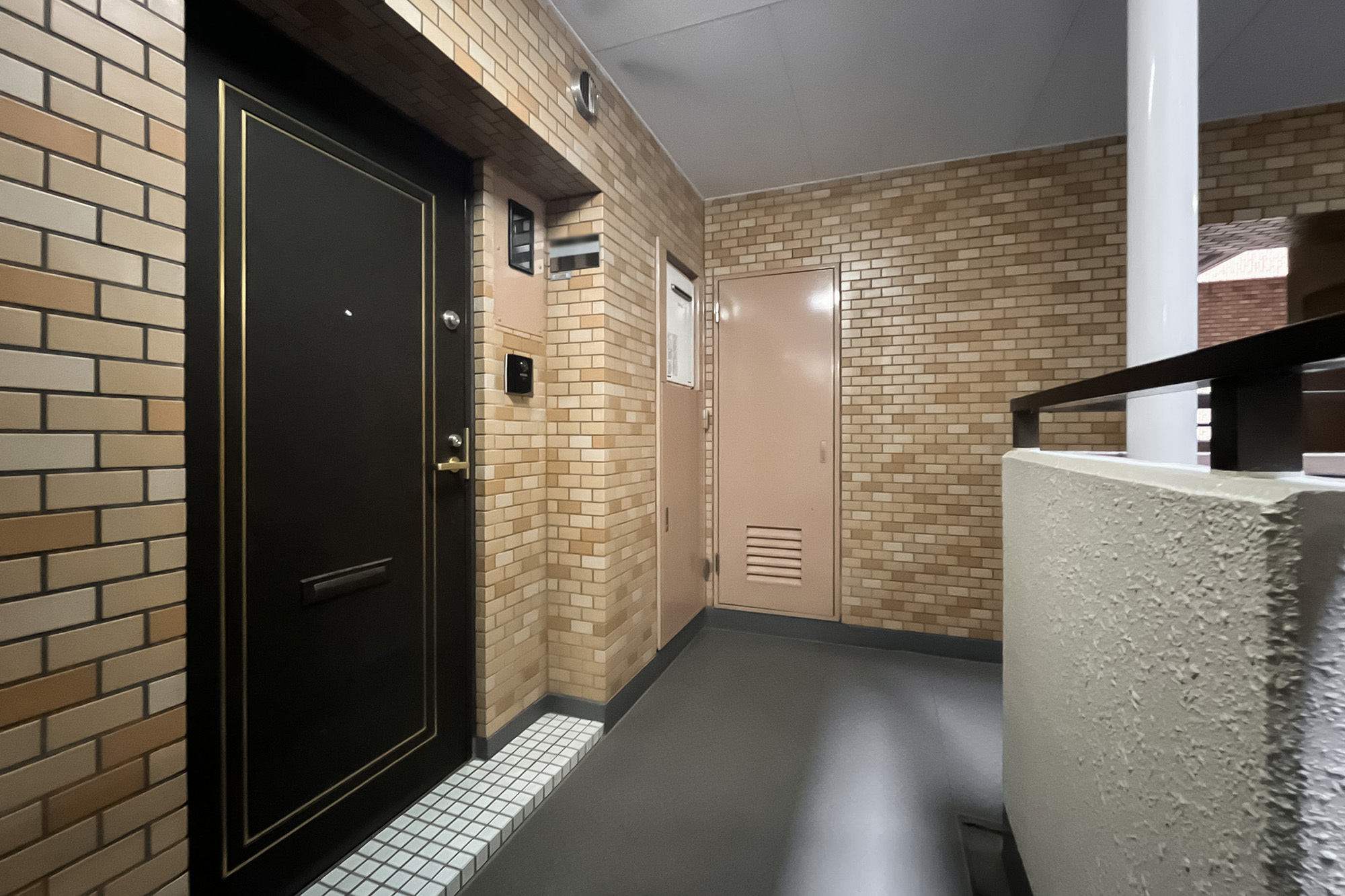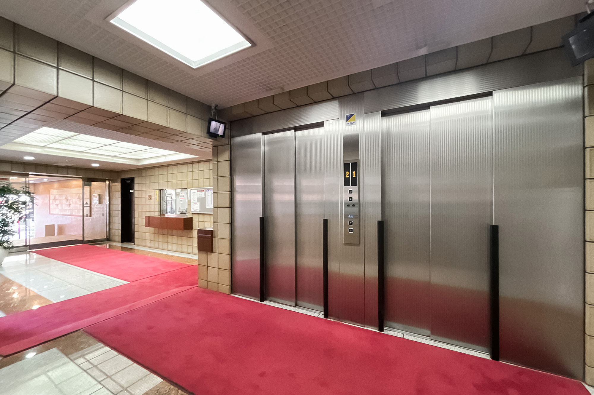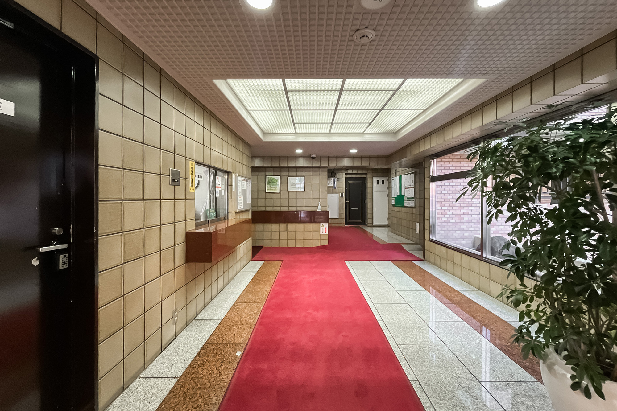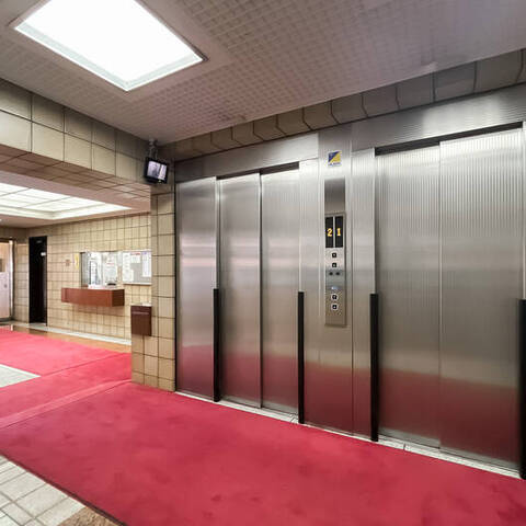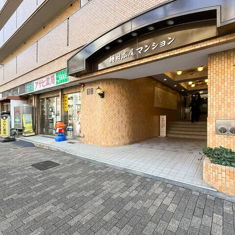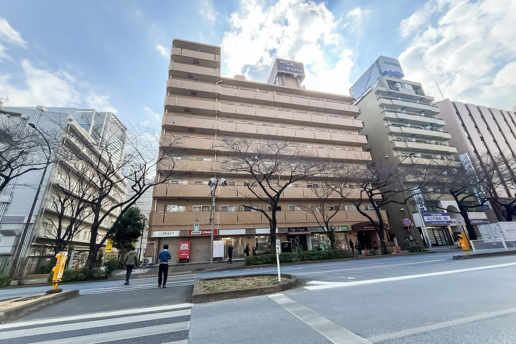 - 明治通り沿いに佇む、1987年竣工の建物。ベージュのタイルをまとった、品のある佇まいです。共用部にはオートロックを完備しています。