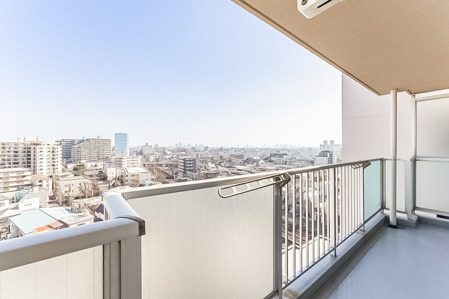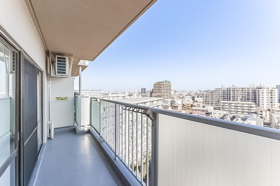 - 住戸の所在階は10階。バルコニーからは遠くまで広がる街並みを望みます。専有面積約59㎡を2LDKにしており、LDKを通らずに各洋室にアクセスできる独立性のあるつくりです。LDKは約12帖。キッチンが壁付けのため、帖数以上の広さを感じそうですね。