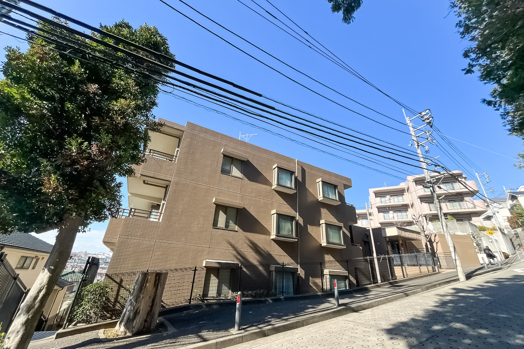 - 最寄りはグリーンライン「日吉本町」(徒歩7分)。3路線を利用できる「日吉」駅(徒歩13分)も徒歩圏内です。アップダウンが多い街で、今回ご紹介するマンションも坂の途中に腰をおろしています。周辺は戸建て住宅やマンションが並ぶ住宅街。落ち着いた雰囲気が漂います。