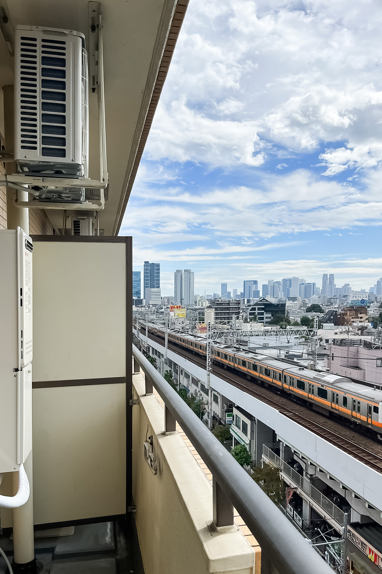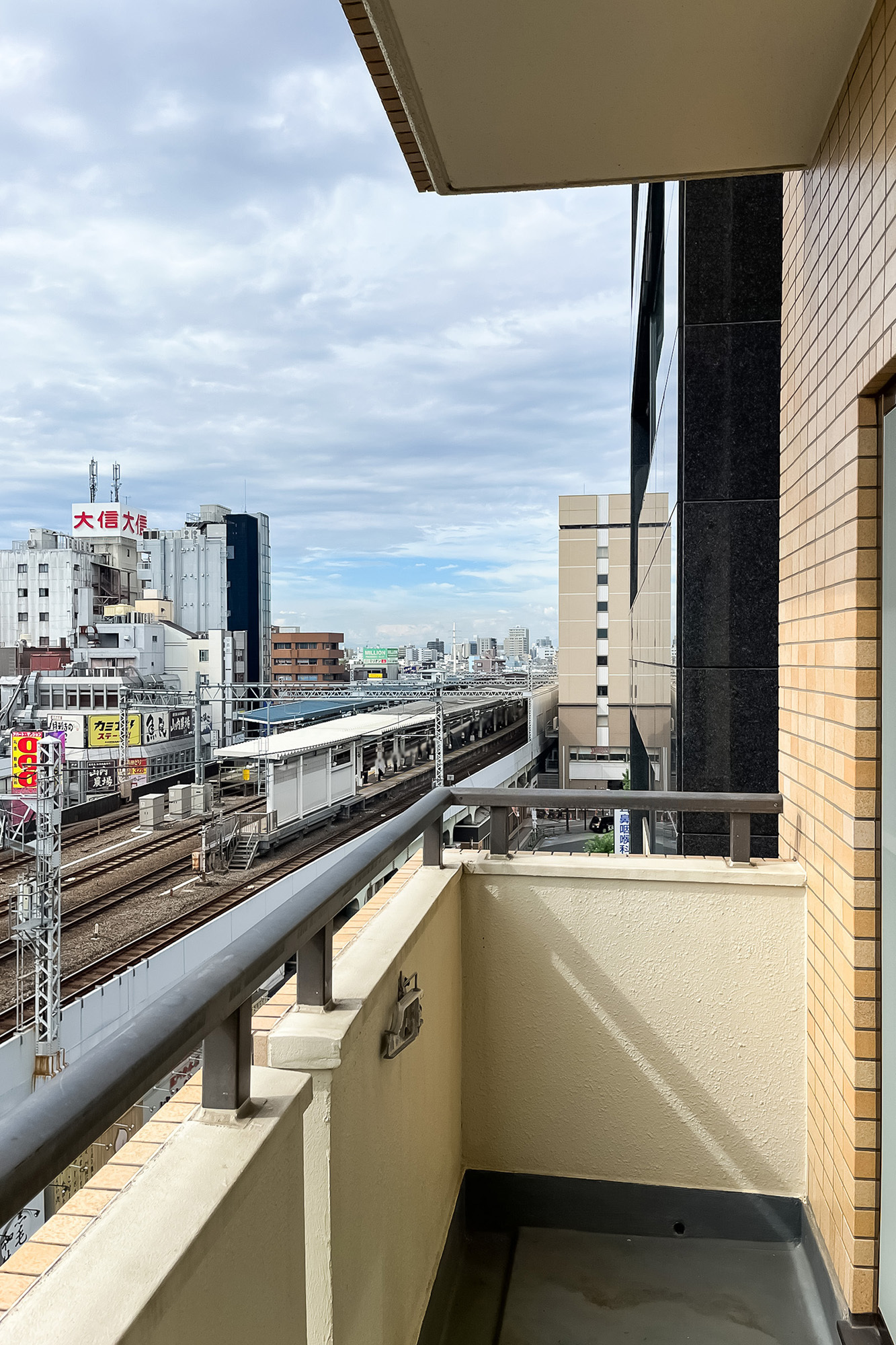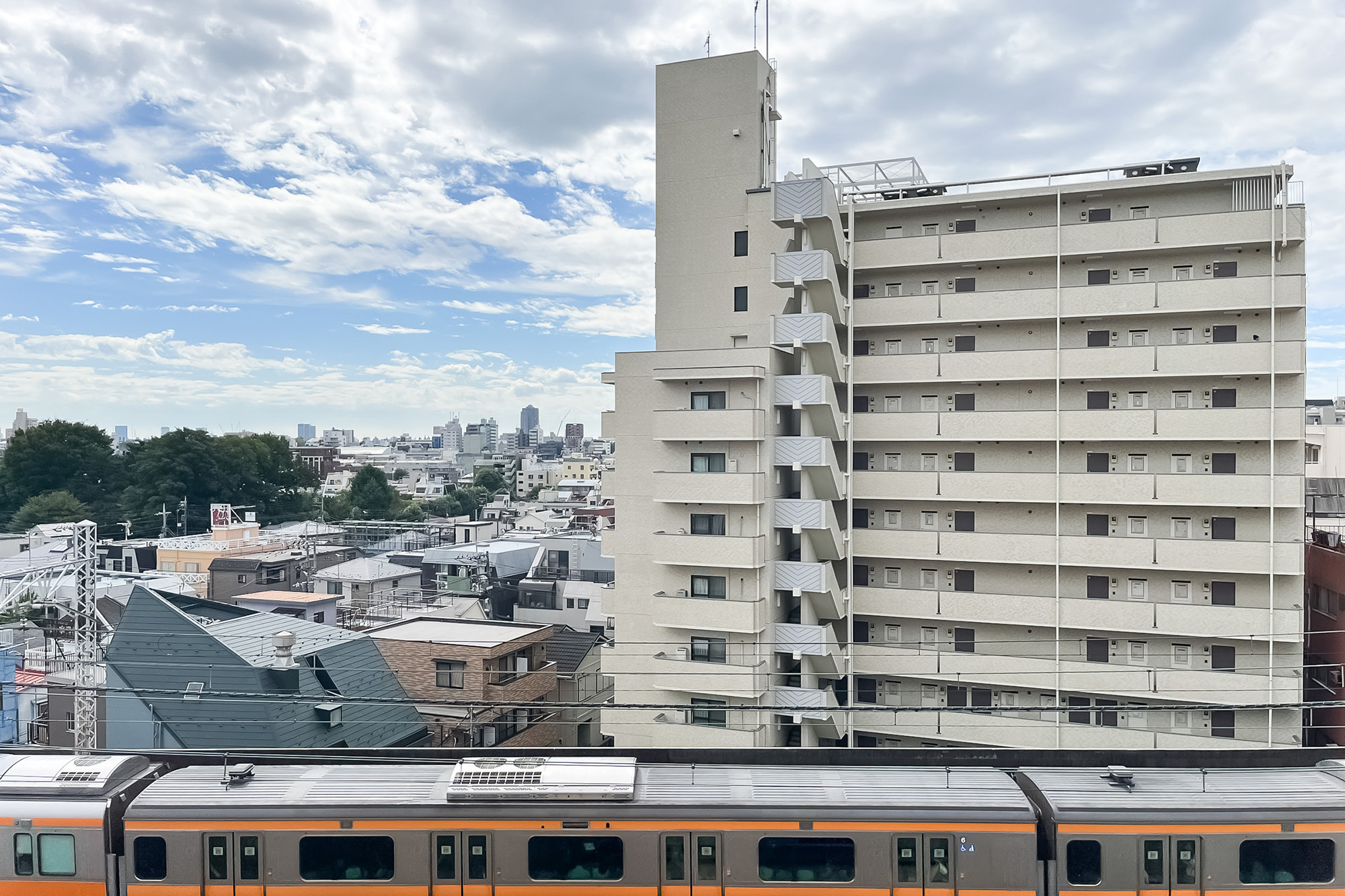 - 7階に所在する南西角住戸。南側には線路が通っています。専有面積約42㎡を1LDKにした間取りで、おひとり〜おふたり暮らしにフィットしそうです。