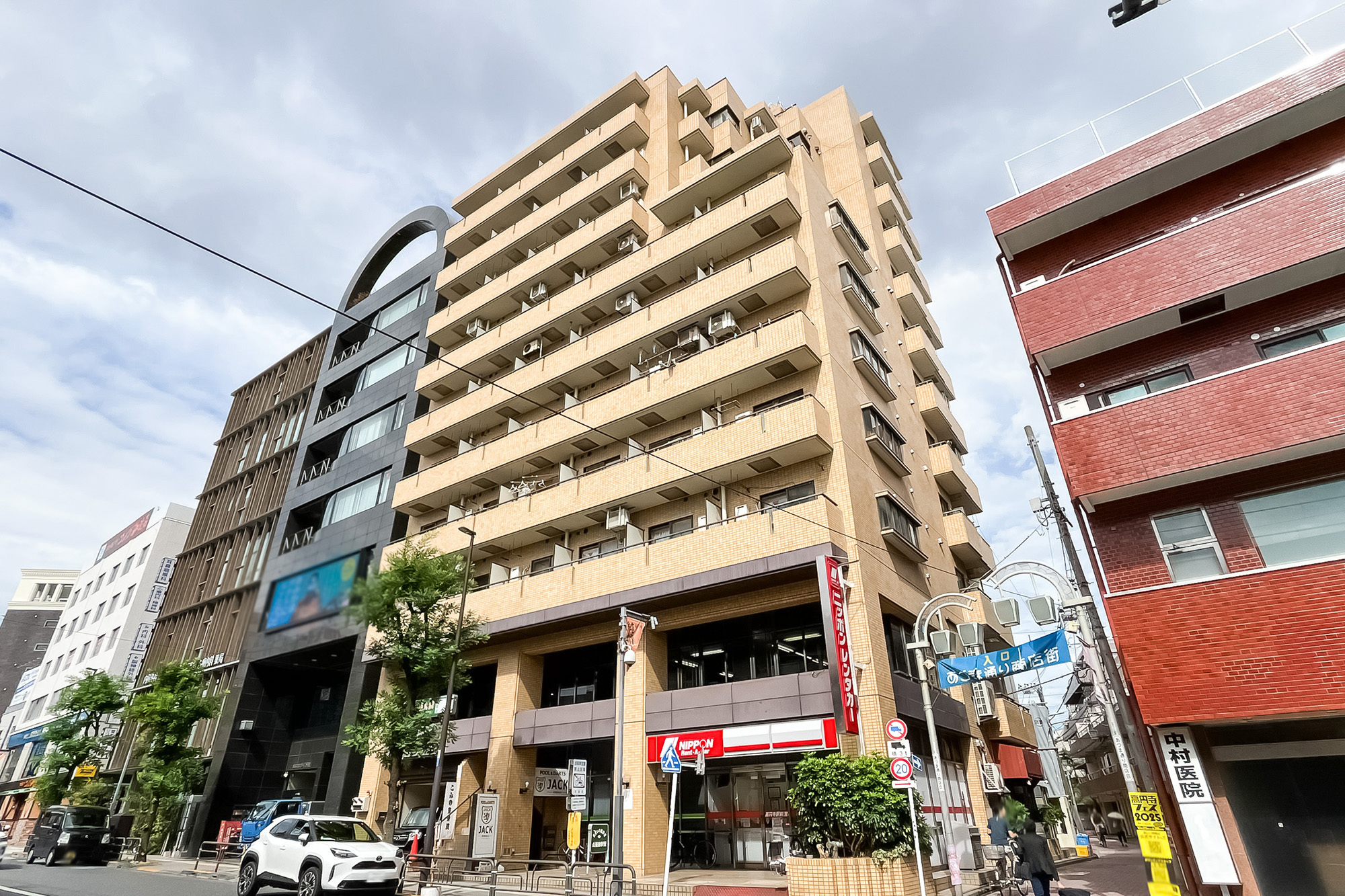 - 1984年竣工の、新耐震基準に適合した建物です。低層階部分にはレンタカーショップなどのテナントが入居中。共益費は一般的な相場と比べお高めに設定されています。