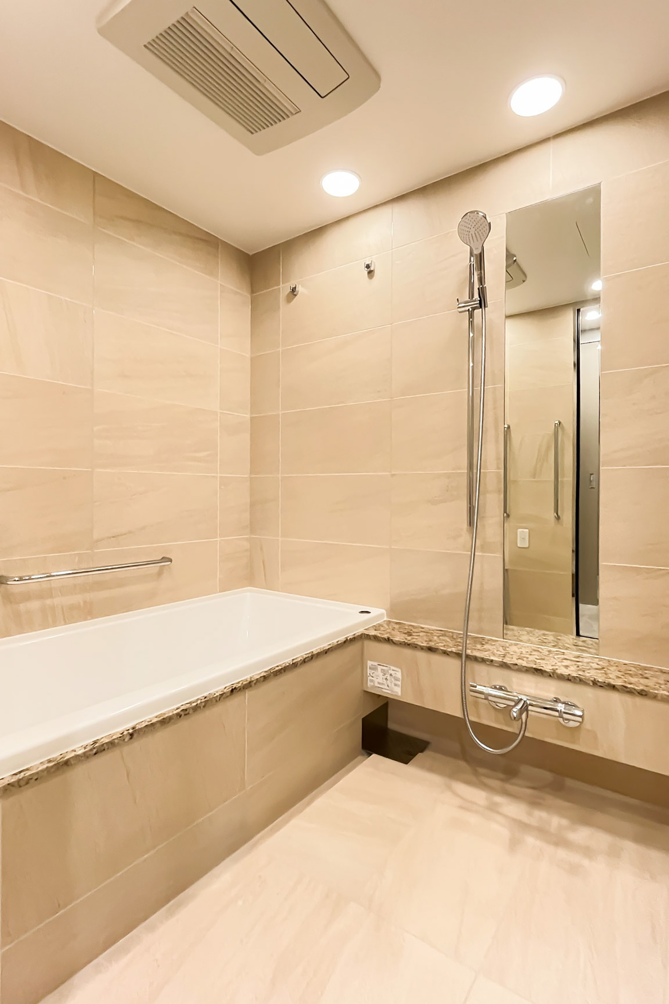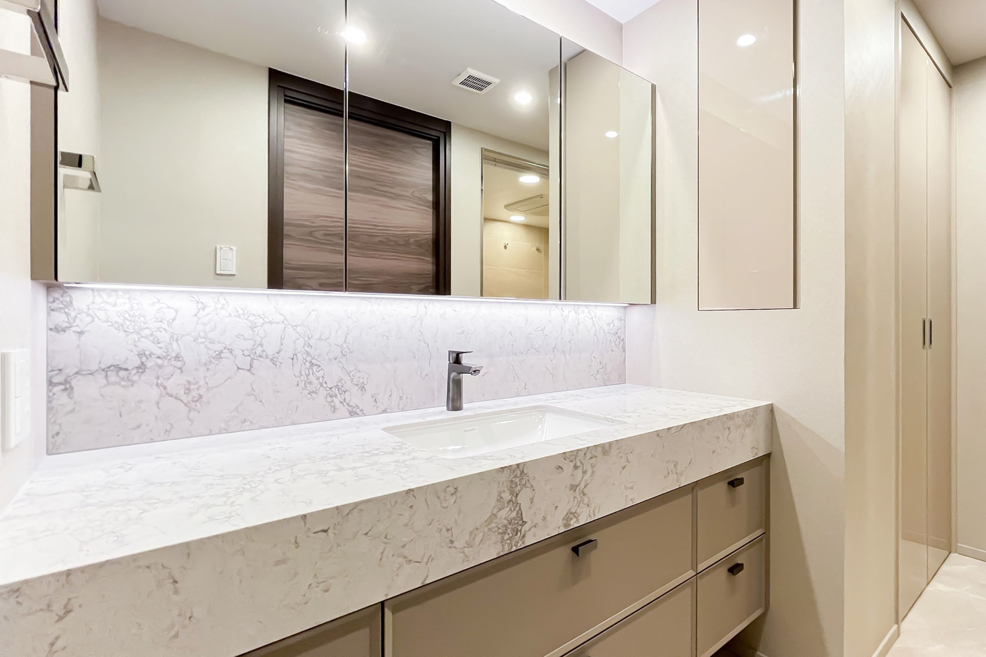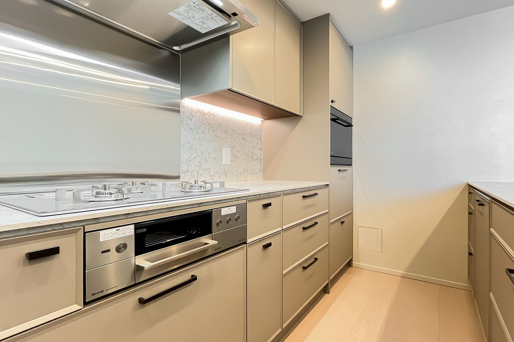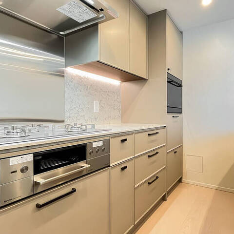 改修工事内容:キッチン交換/洗面台交換/浴室暖房乾燥機交換(ガス)/トイレ交換/壁・天井クロス貼替/フローリング貼替/トイレ床貼替/建具レバーハンドル交換 他