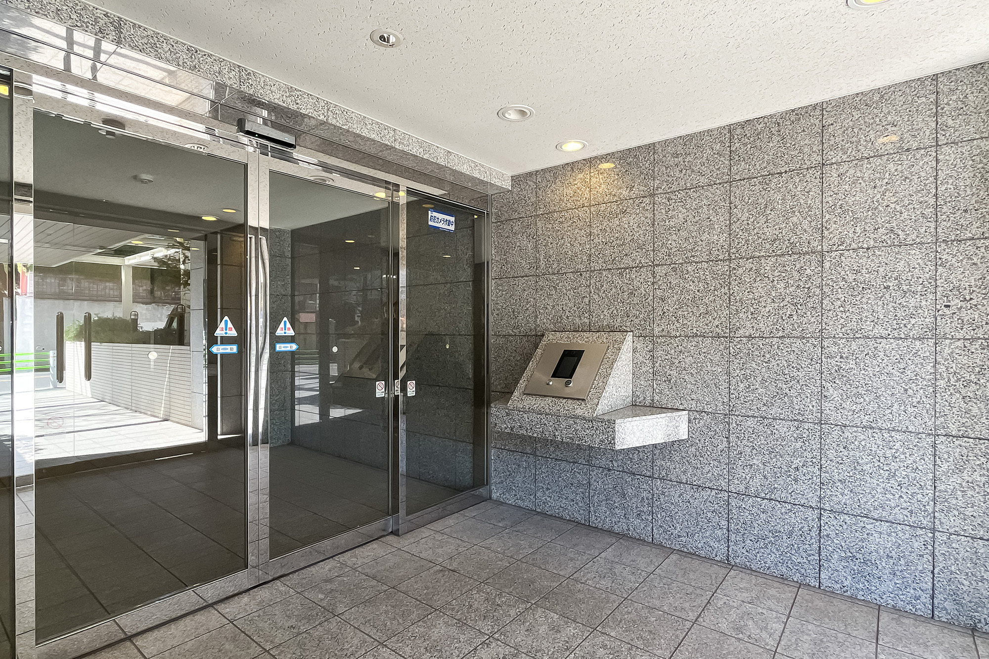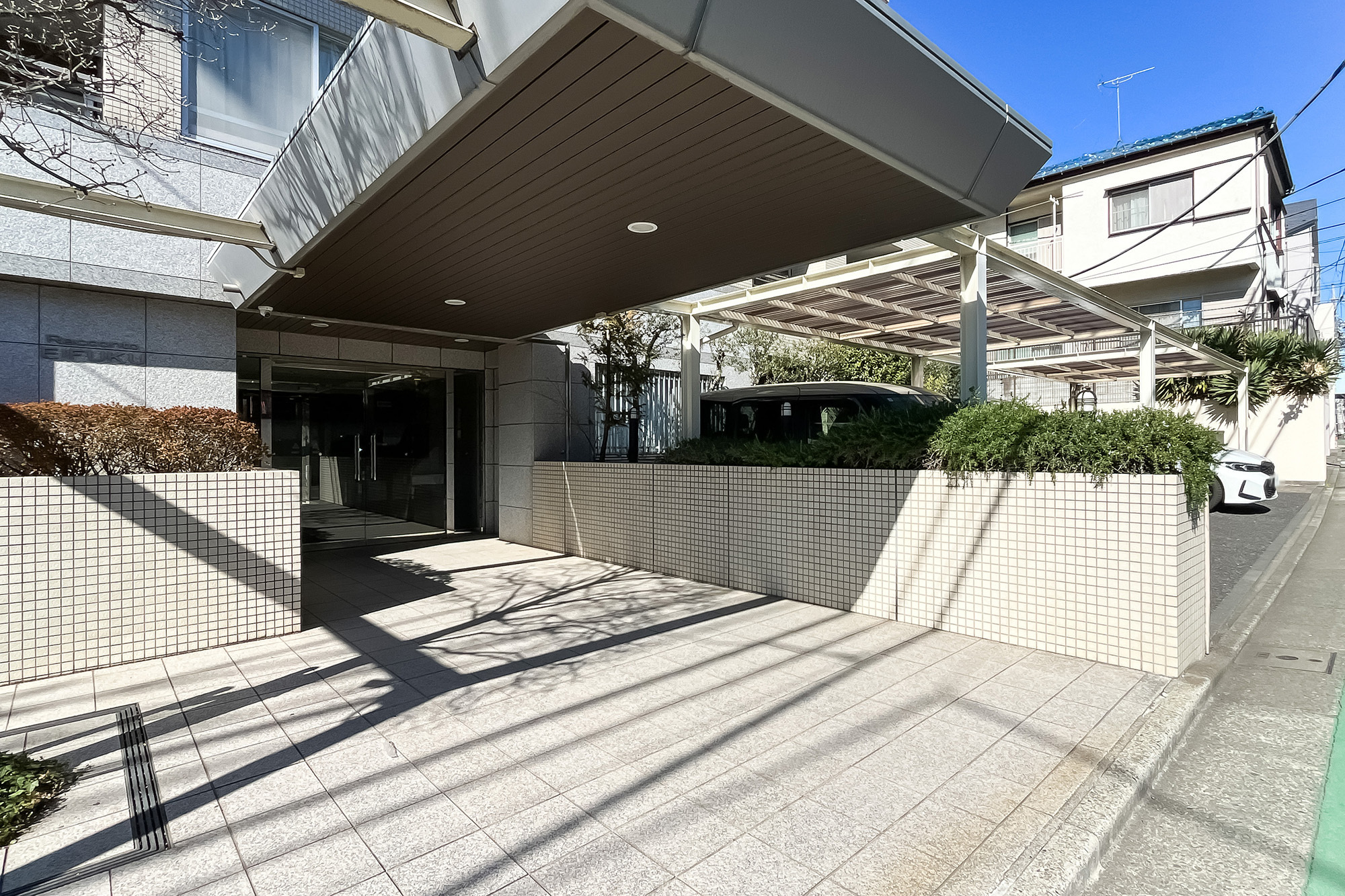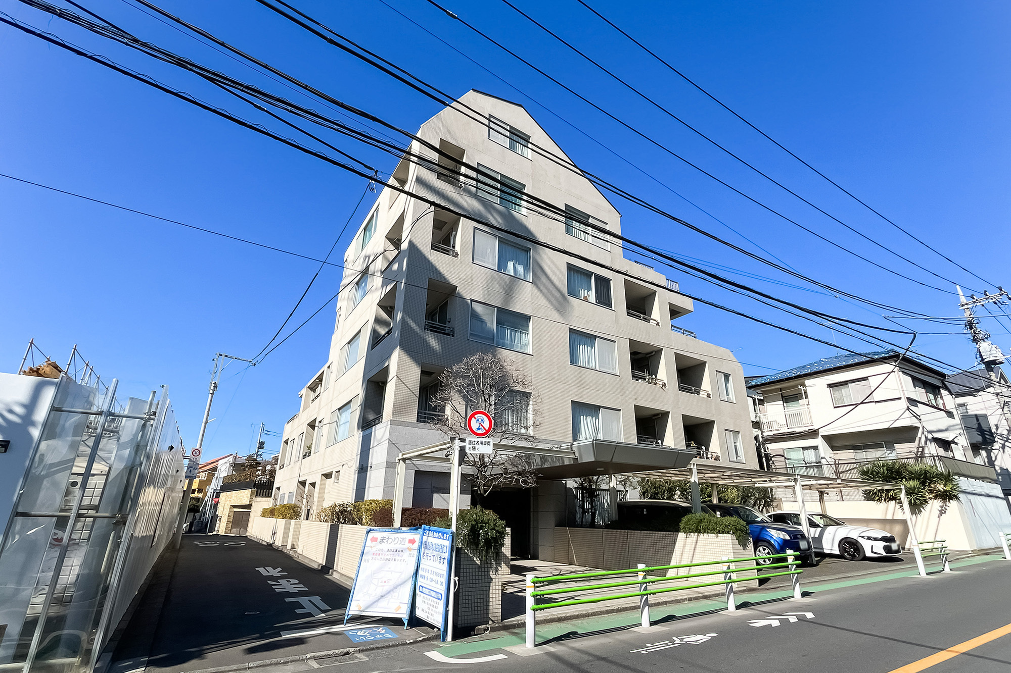 - 台形屋根が特徴的な、2004年竣工のマンション。共用部にはもちろんオートロックと宅配ボックスを完備しており、細則に基づいてペットの飼育が可能です。総戸数は22戸と小規模で、共益費は一般的な相場に比べお高めに設定されています。