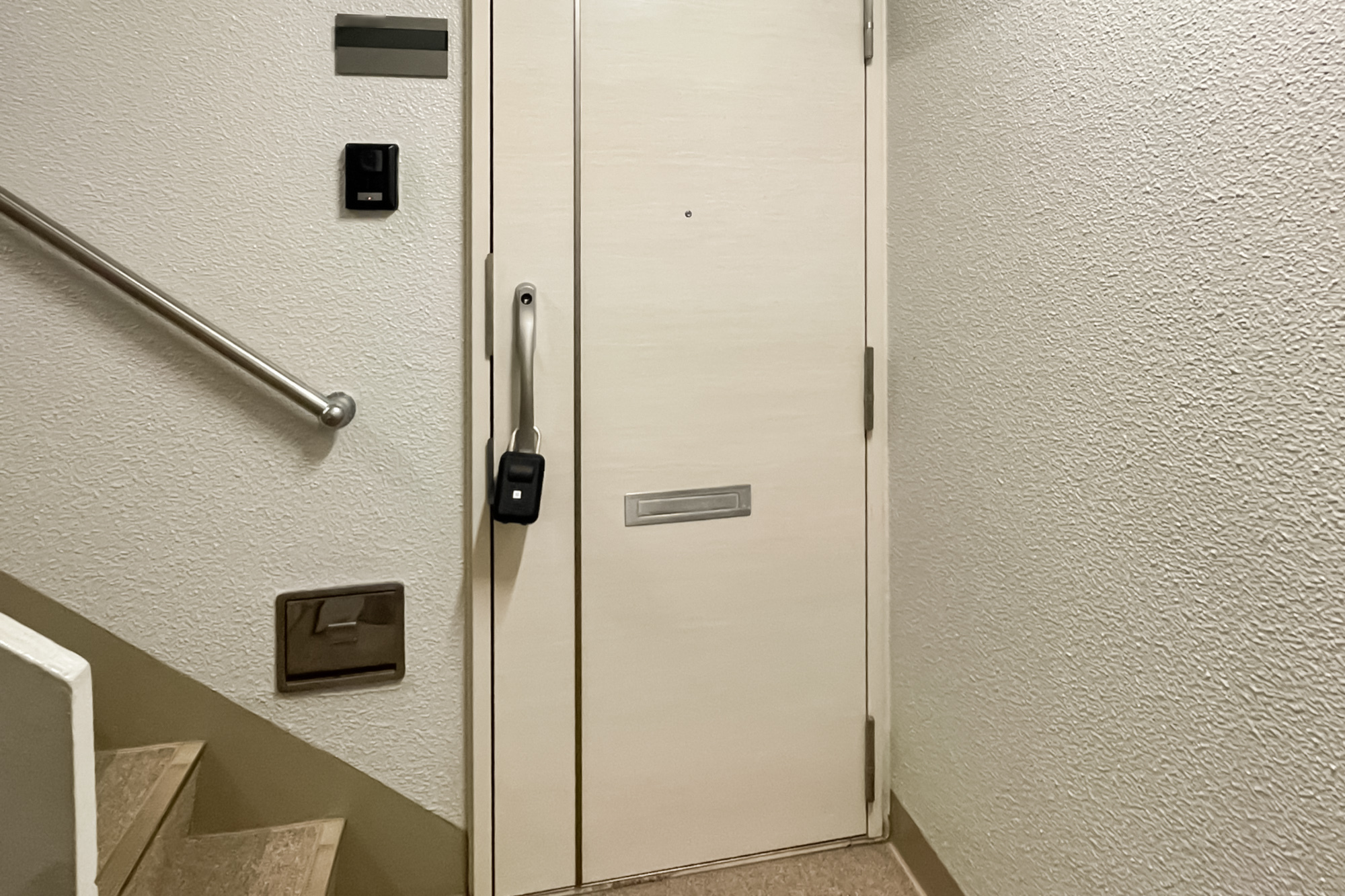 - マンションにはエレベーターが備わっていないため、住戸が所在する2階までは階段でのアクセスとなります。専有面積約74㎡を3LDKにした間取り。南北に窓が備わっており、風が気持ちよく通り抜けてくれそうですね。バルコニーは南向きで、日当たりも良好! また、駐車場専用使用権(使用料月額1,000円)が付いているのもうれしいポイントです。