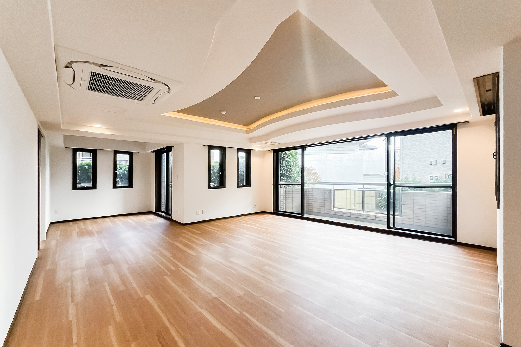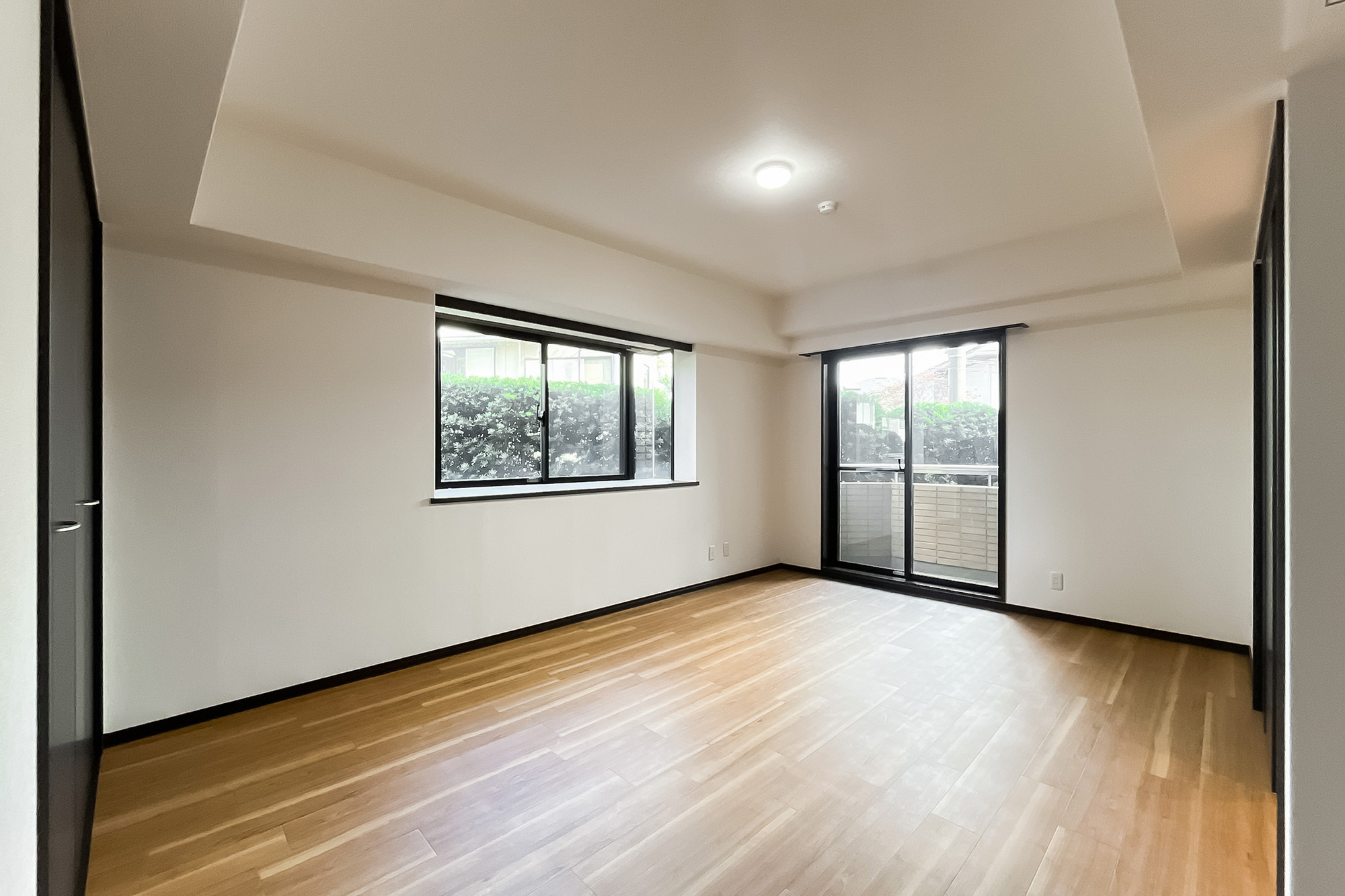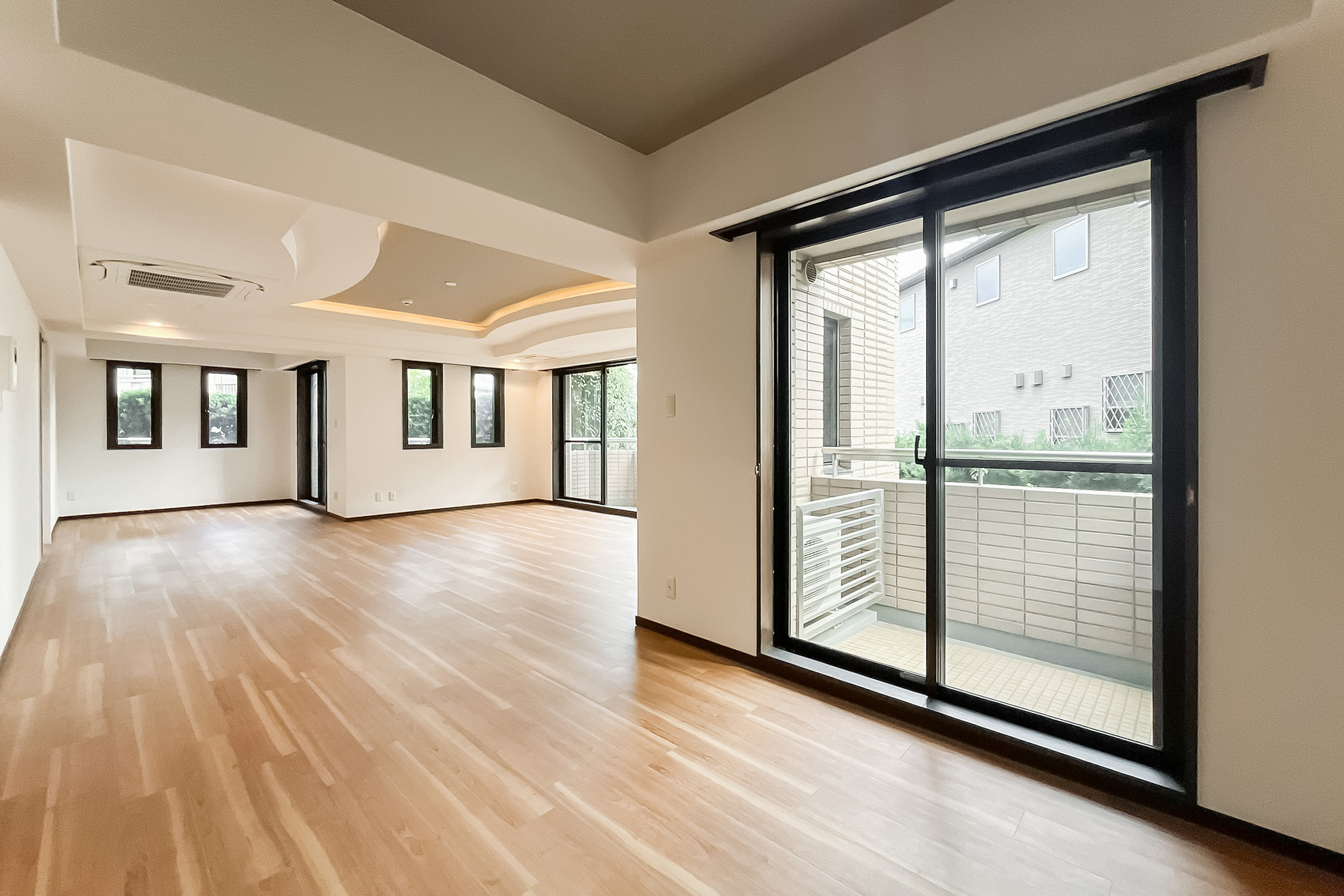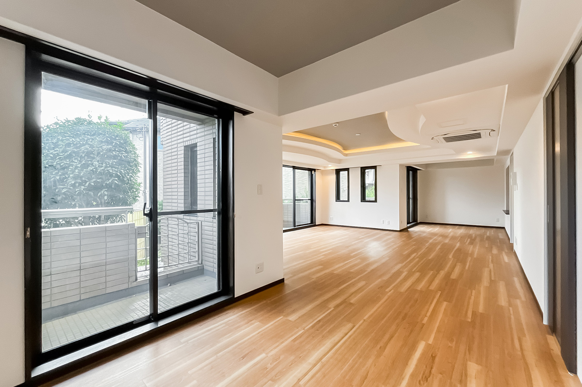 - ご紹介する住戸は1階の角に所在し、専用庭が付いていますよ。専有面積約164㎡を4LDKにしたゆとりのある間取りで、リビングダイニングだけで約29.7帖、メインベッドルームは約12.4帖と広々! ご家族でゆったりとお住まいいただけそうですね。