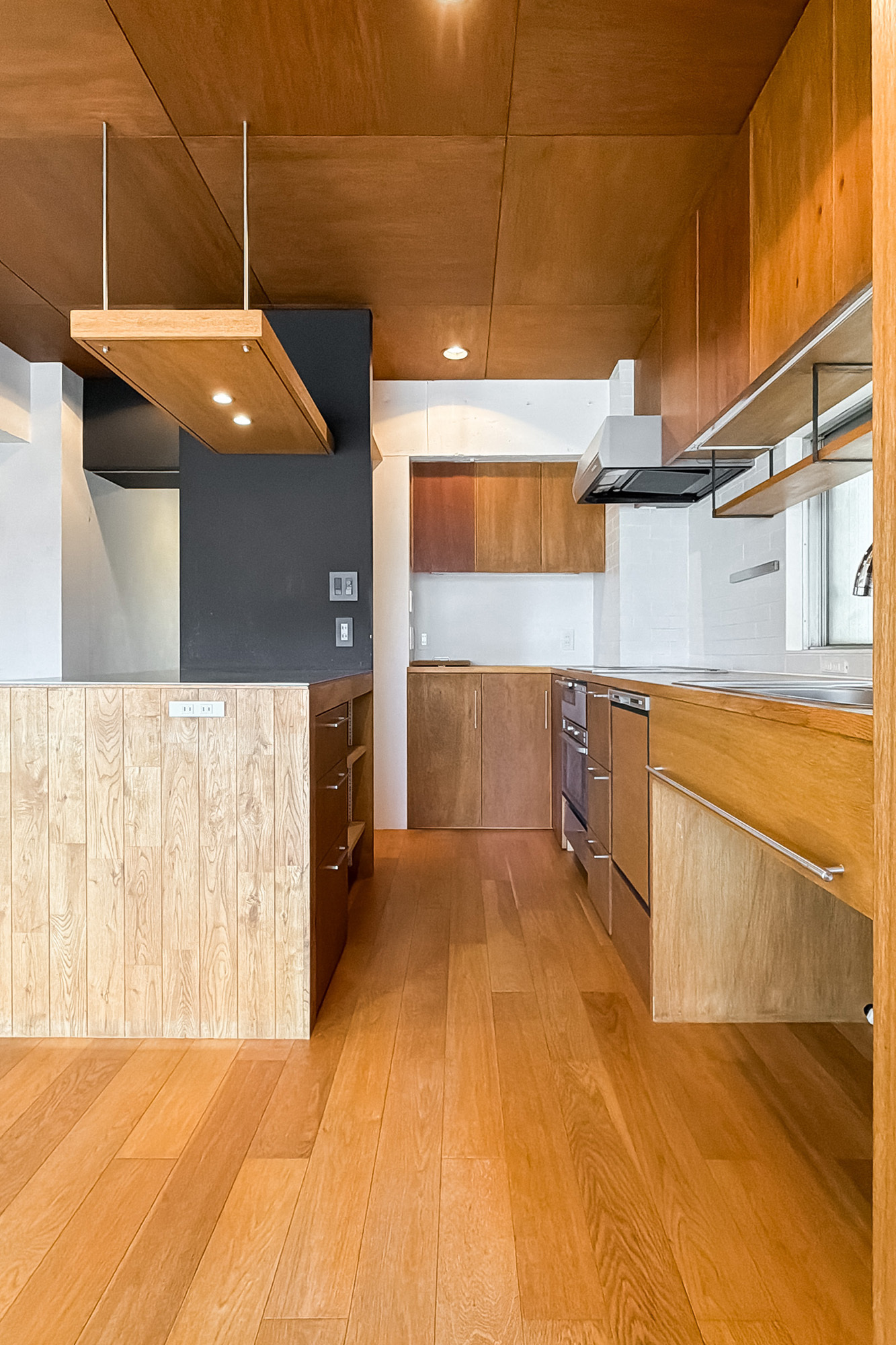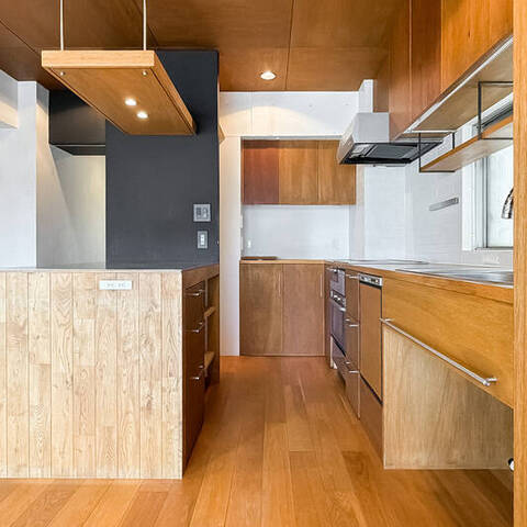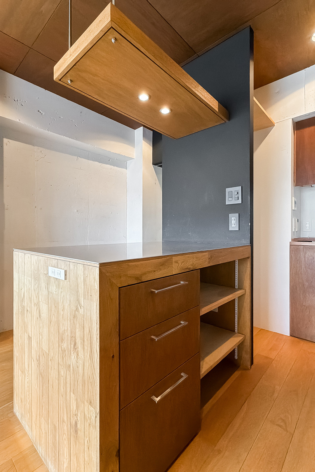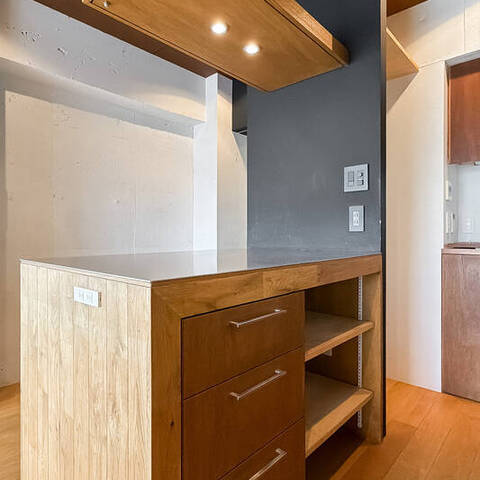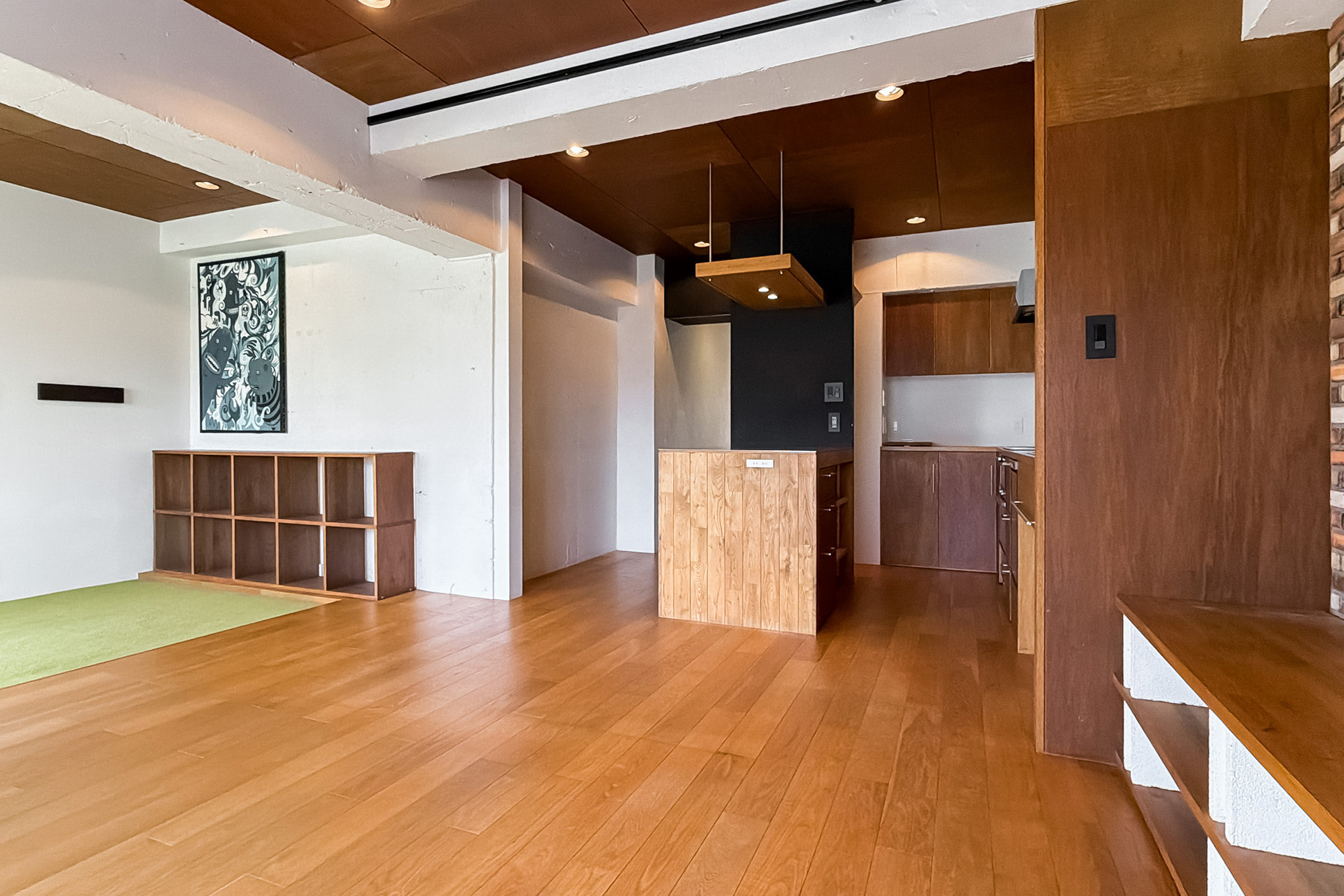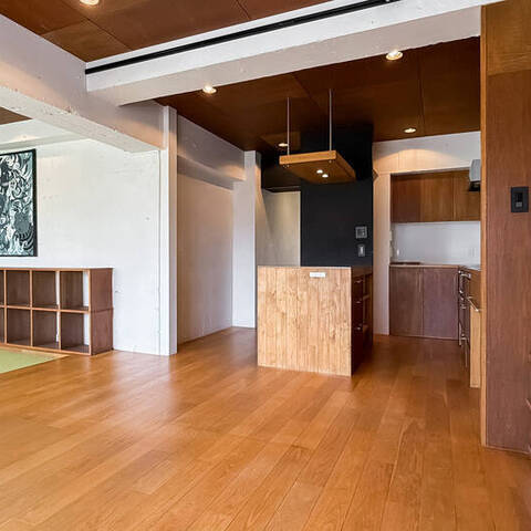 - 専有面積約65㎡を1LDKとした、ゆとりあるプラン。随所に用いられた木目調のパネルや、カーペット敷きのフリースペース、躯体現しの意匠など、こだわりを感じる内装です◎