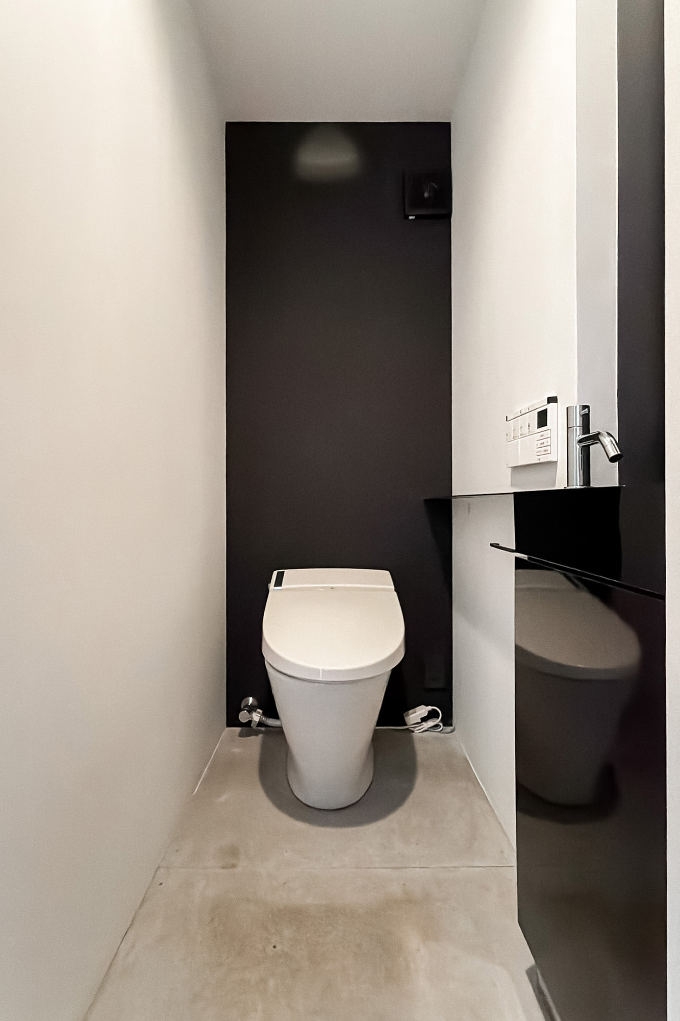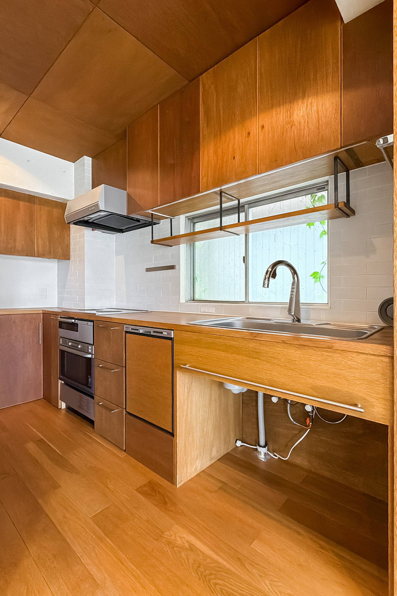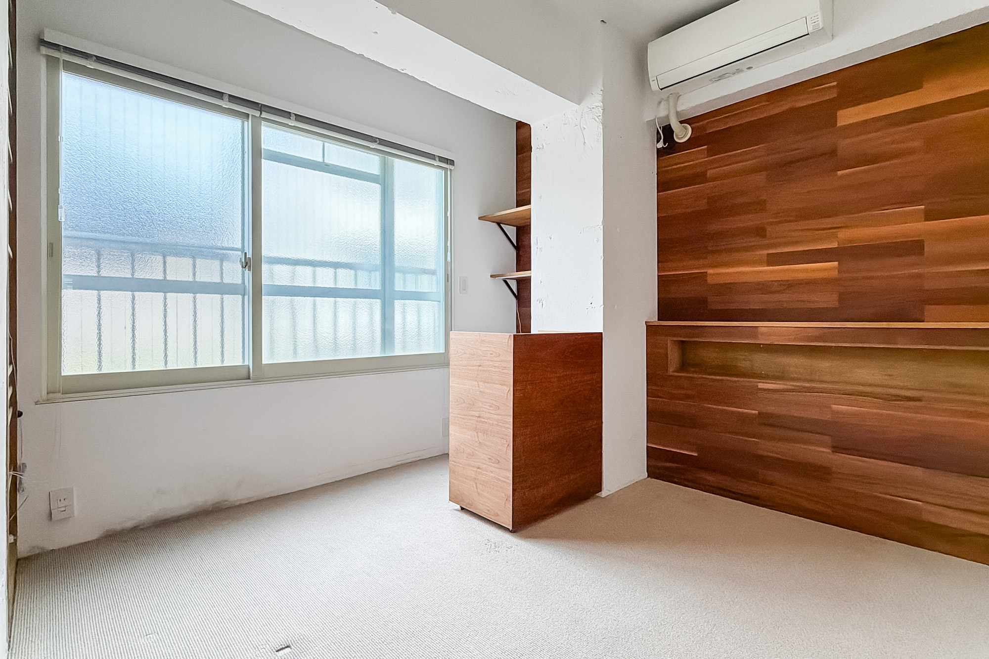 - 専有面積約65㎡を1LDKとした、ゆとりあるプラン。随所に用いられた木目調のパネルや、カーペット敷きのフリースペース、躯体現しの意匠など、こだわりを感じる内装です◎