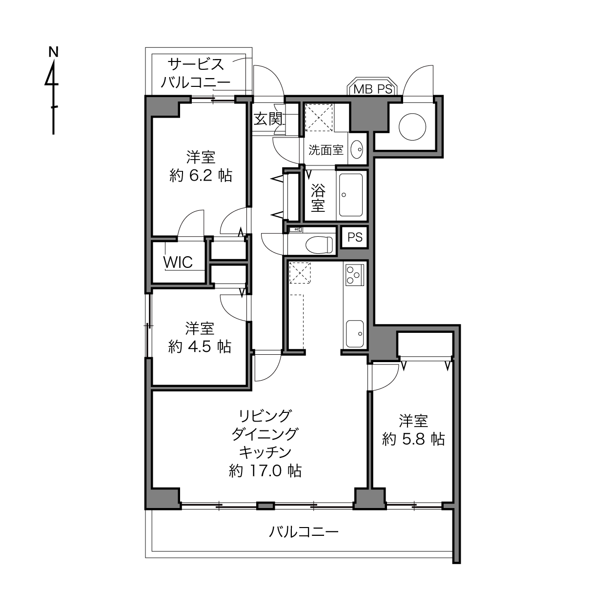 61.82㎡ 2LDK+S[サービスルーム(納戸)]